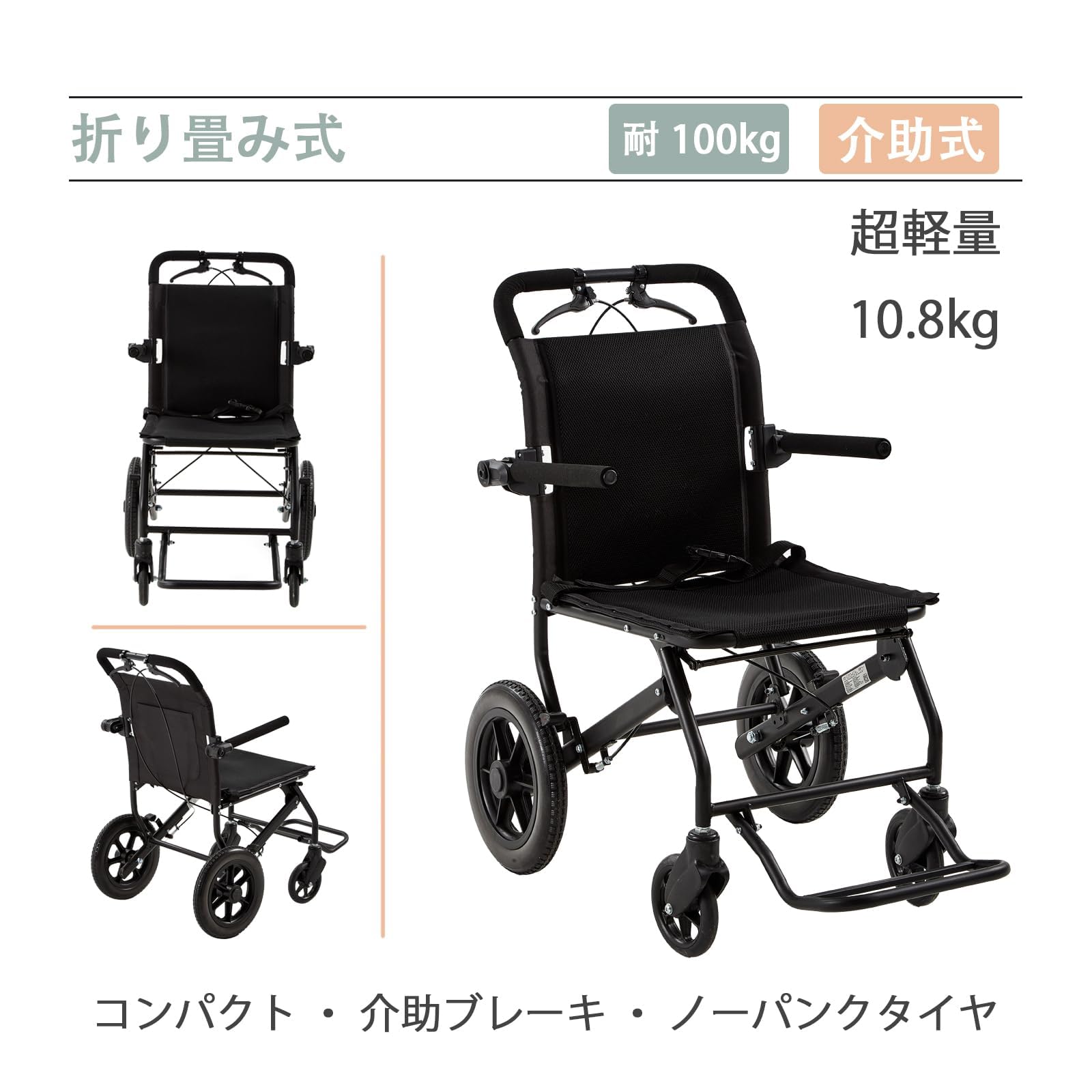 PIPIMOTO 車椅子 折りたたみ 軽量 10.5kg 耐荷重 100kg 介助用車いす ハニカム タイヤ パンク防止 3Dバックレスト W型座面 通気性 取り外し可能 伸縮キャリーバー 介助用ブレーキ 鋼鉄 フレーム 調節可能 フットレスト シートベルト付き リハビリ 介護 旅行 室内 室外(PM-S200)
