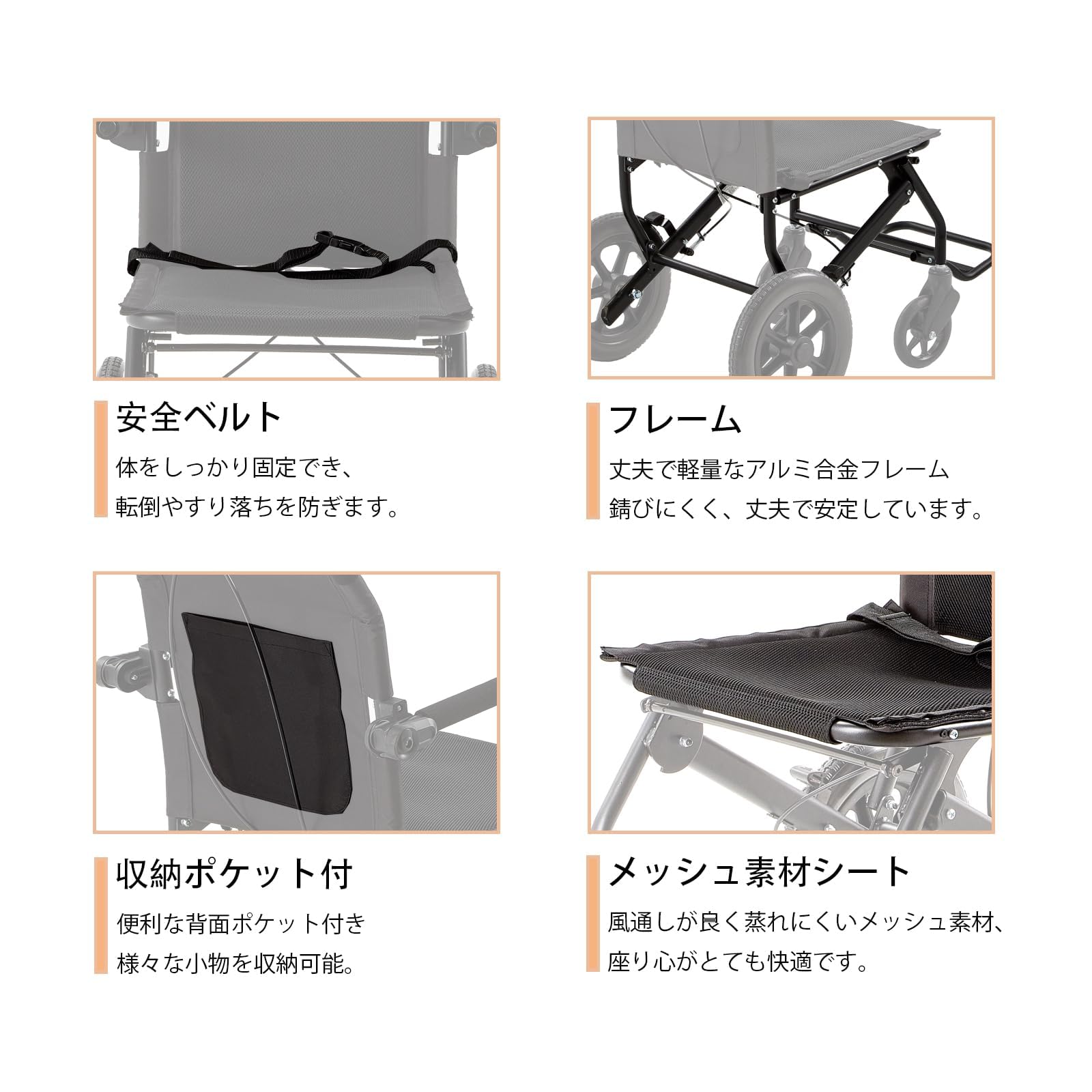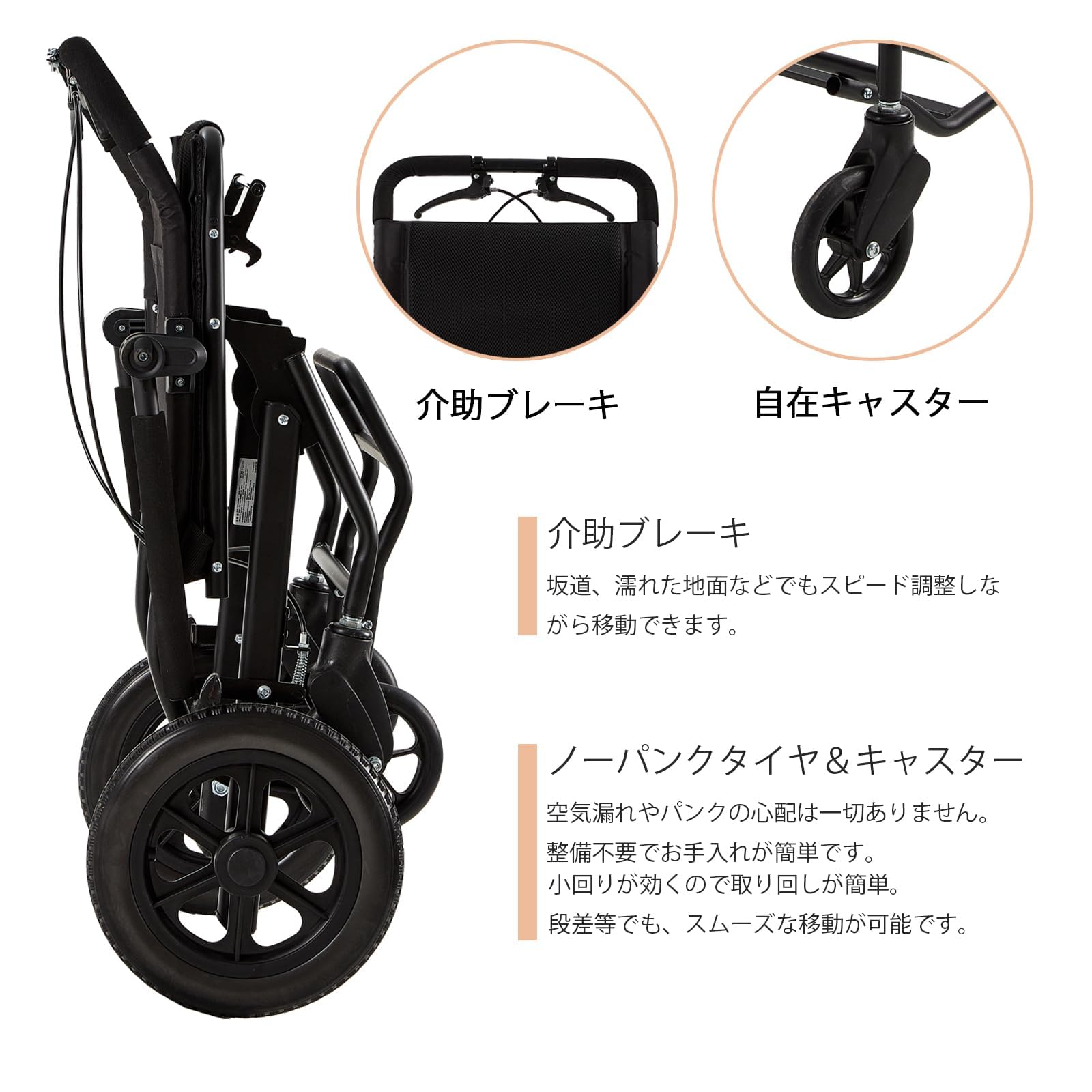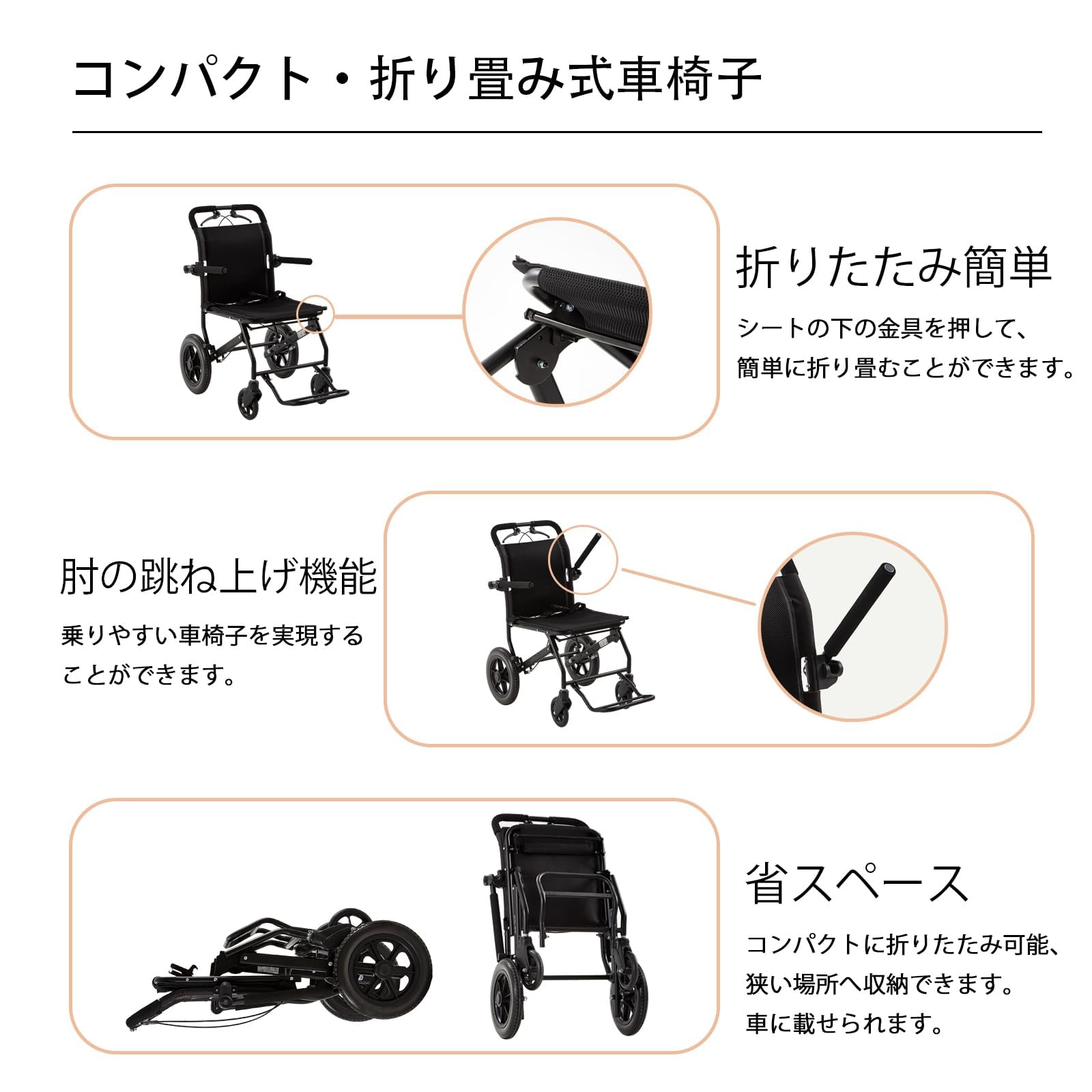 ① 商品仕様 サイズ:全幅60cm×全高88cm×全長84cm; 折りたたみ時:全幅27cm×全高66cm×全長60cm。 座席幅40cm;後輪12インチ;キャスター6インチ;座高46cm;シート奥行40cm;背もたれ高41cm;重量10.8kg;推奨最大重量100㎏まで。フレーム:アルミ合金。シート:ポリエステル。 原産国:中国 付属品:説明書、保証書 ブランド:zurcheel ② ご利用方法 シニアの方々や妊娠中の方々、捻挫、術後などで足が不自由な方々や足に障害をお持ちの方々が自宅や病院、交通機関を利用する際のサポートに最適です。 特徴:軽量アルミ製、折り畳み式。コンパクト。