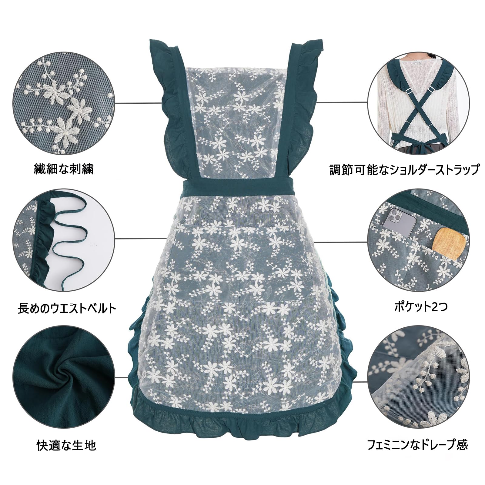 説明 Joolxxo エプロン レディース おしゃれ 可愛い レース付き 花の刺繍 調節可能 大容量ポケット2つ 付き 汚れにくい シワ防止 キッチン ダイニングルーム コーヒーショップ 家事に最適 園芸 保育園 花屋 料理店用