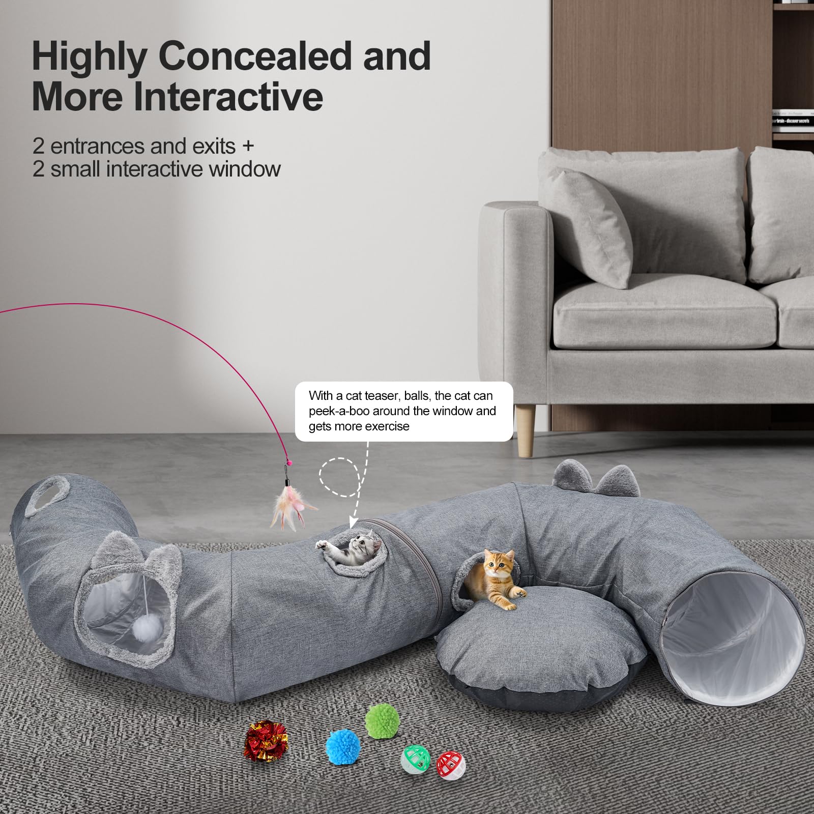 Avont 猫トンネル ベッド 長いS型 キャット 多連結 猫用おもちゃ 延伸保温 分割洗浄 強化安定 運動不足対策 折りたたみ 水洗い -グレー
