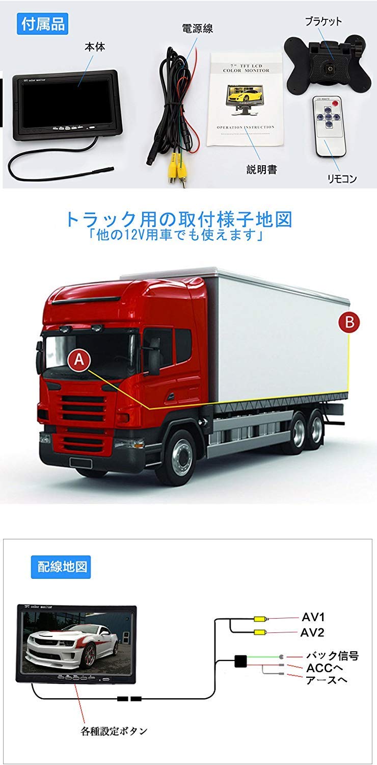 ULOPOP7インチトラック用ドライブレコーダー、IPS液晶、4K超 2画面分割オンダッシュモニター 録画機能付き、 ガイドラインON/OFF 正像・鏡像を切替可能,駐車監視機能付き、12-36V兼用 2個カメラ付きセット、日本語説明書つき