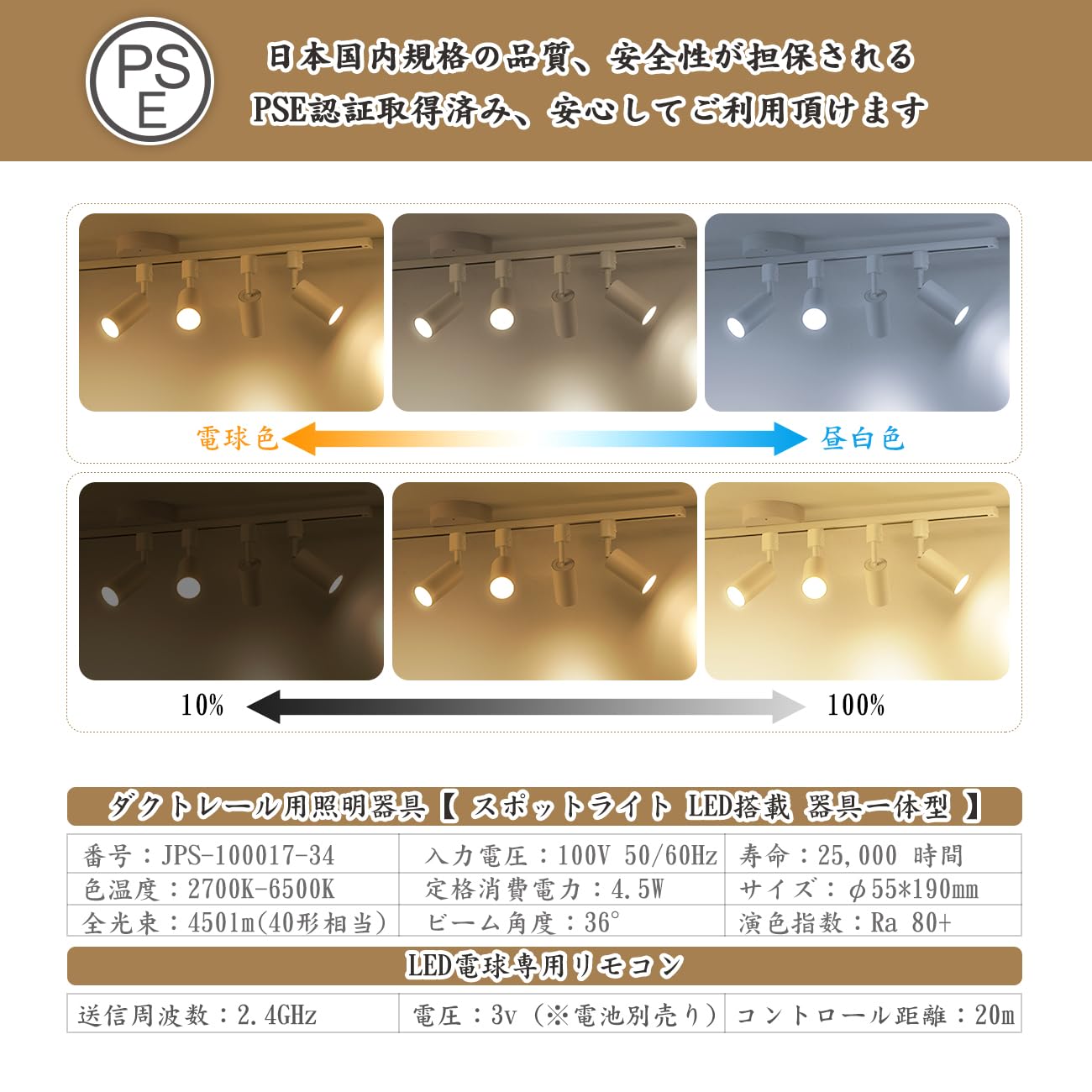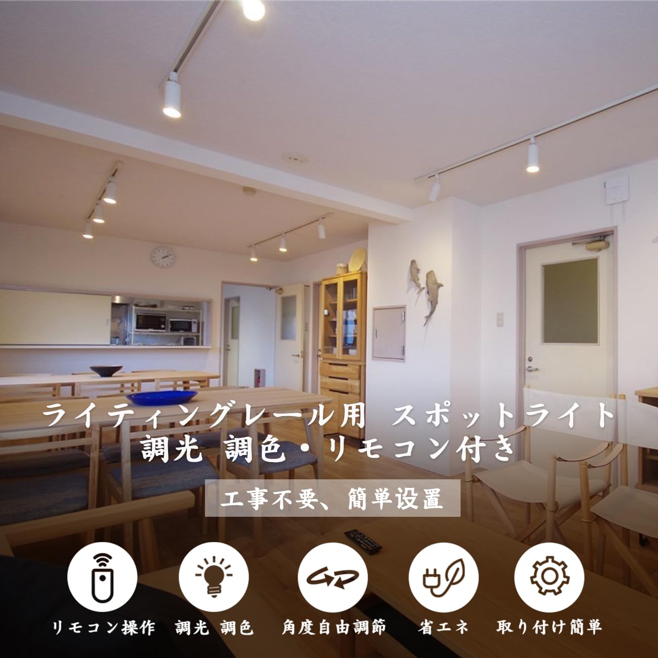 ライティングレール用スポットライト100W相当 調光 調色 リモコン付き 電球色昼光色昼白色 消費電力10W 大光量1000LM,照射角度調節可能,2.4GHz無線式遠隔操作,30分/60分お休みタイマー 常夜灯 光色切り替え PSE認証済み 日本語取扱説明書 白い 1個セット(電池別売)