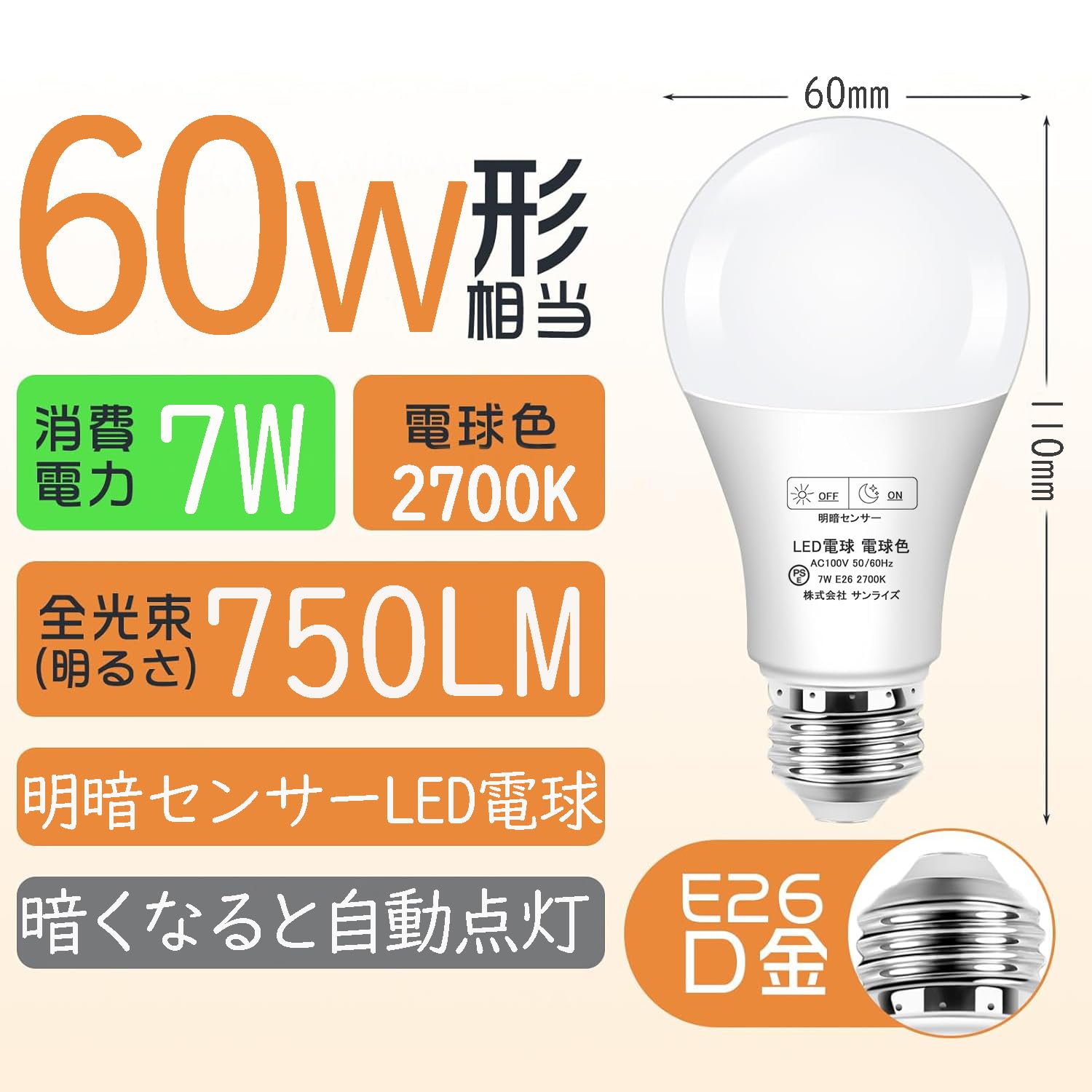 GOHDLAMP 明暗センサーLED電球 電球色 E26口金 60W相当 明暗電球 led電球 暗くなると自動点灯ライト 常夜灯 足元灯 夜間自動点灯 防犯灯 屋外 廊下 足元ライト (電球色, 1個入り)