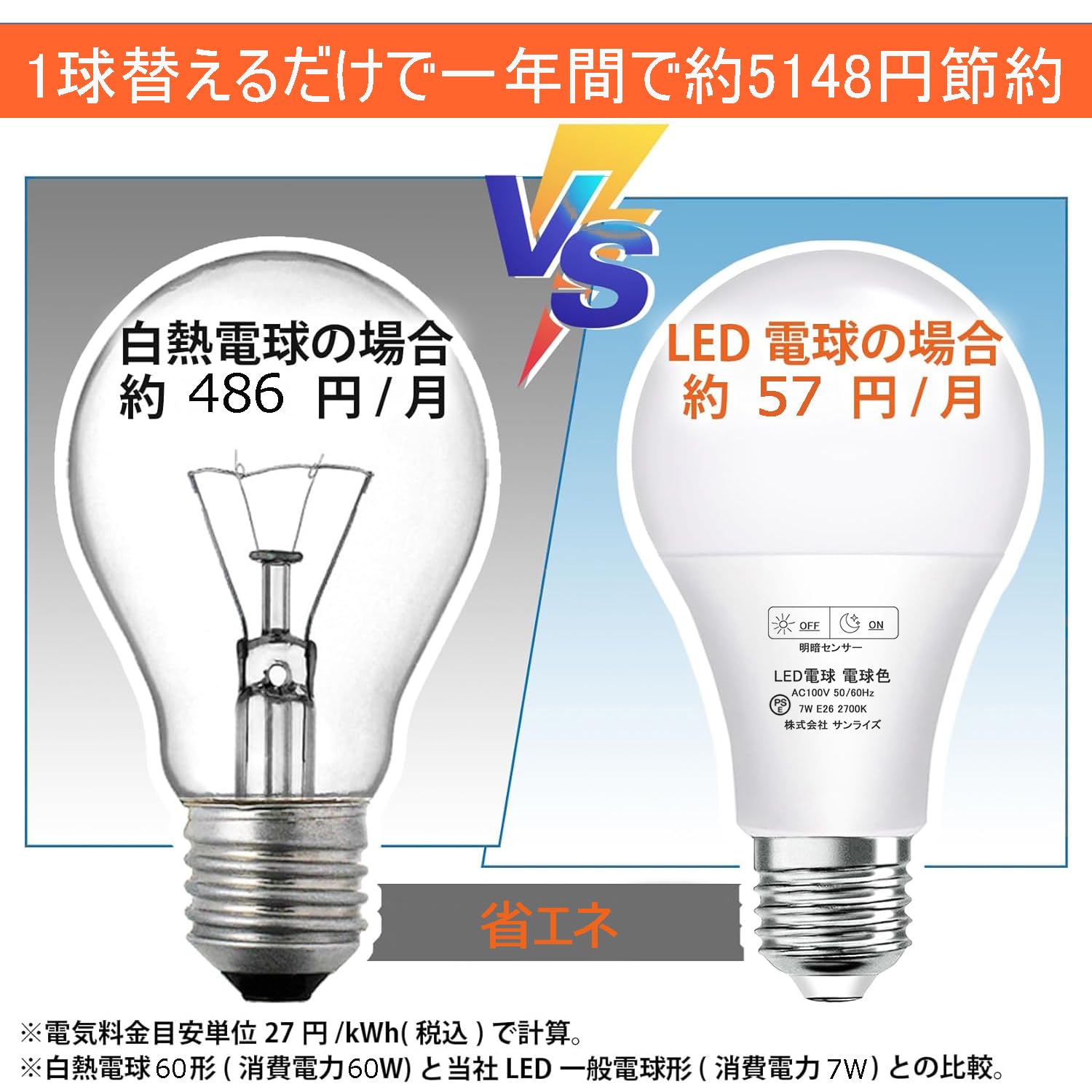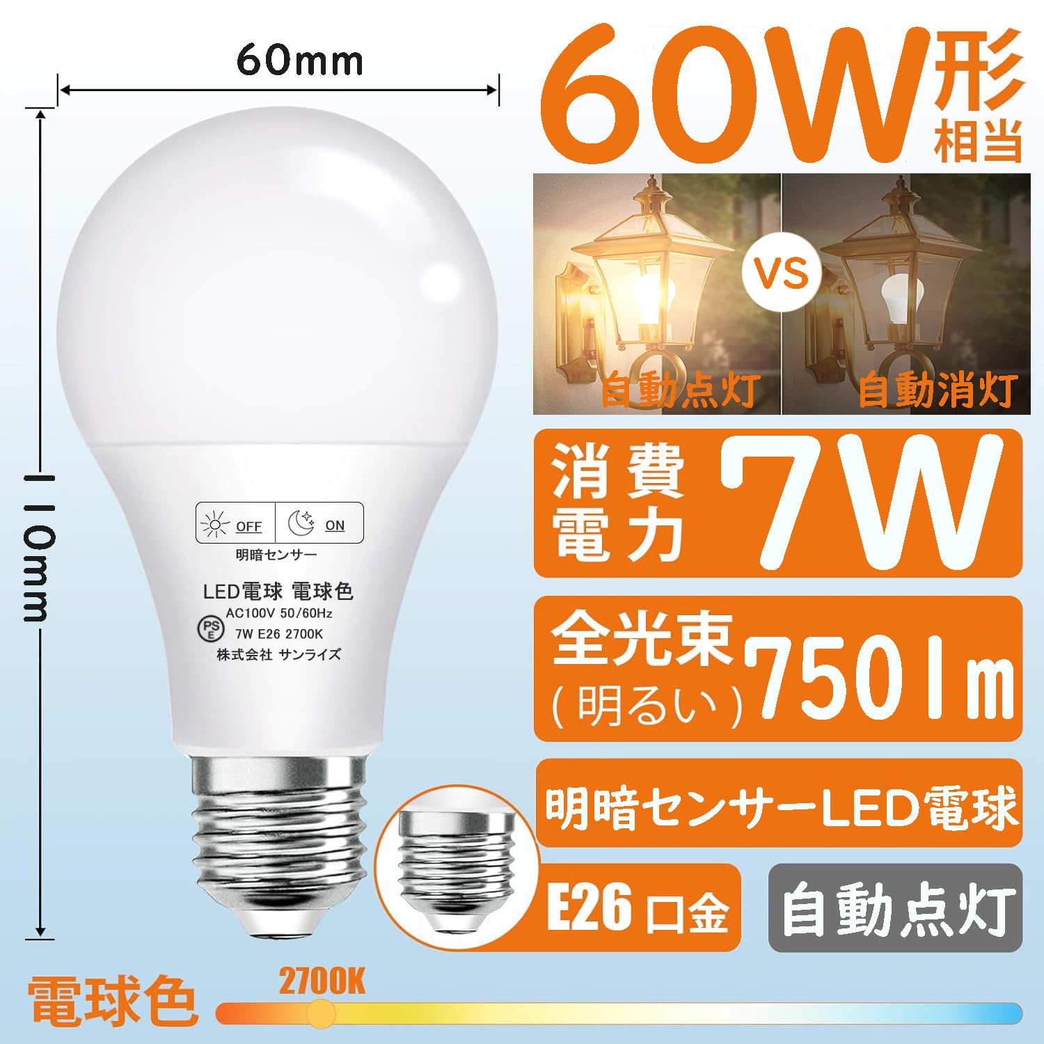 GOHDLAMP 明暗センサーライト 電球色 E26口金 60W相当 明暗電球 led電球 暗くなると自動点灯ライト 常夜灯 足元灯 夜間自動点灯 防犯灯 屋外 廊下 足元ライト (電球色, 2個セット)