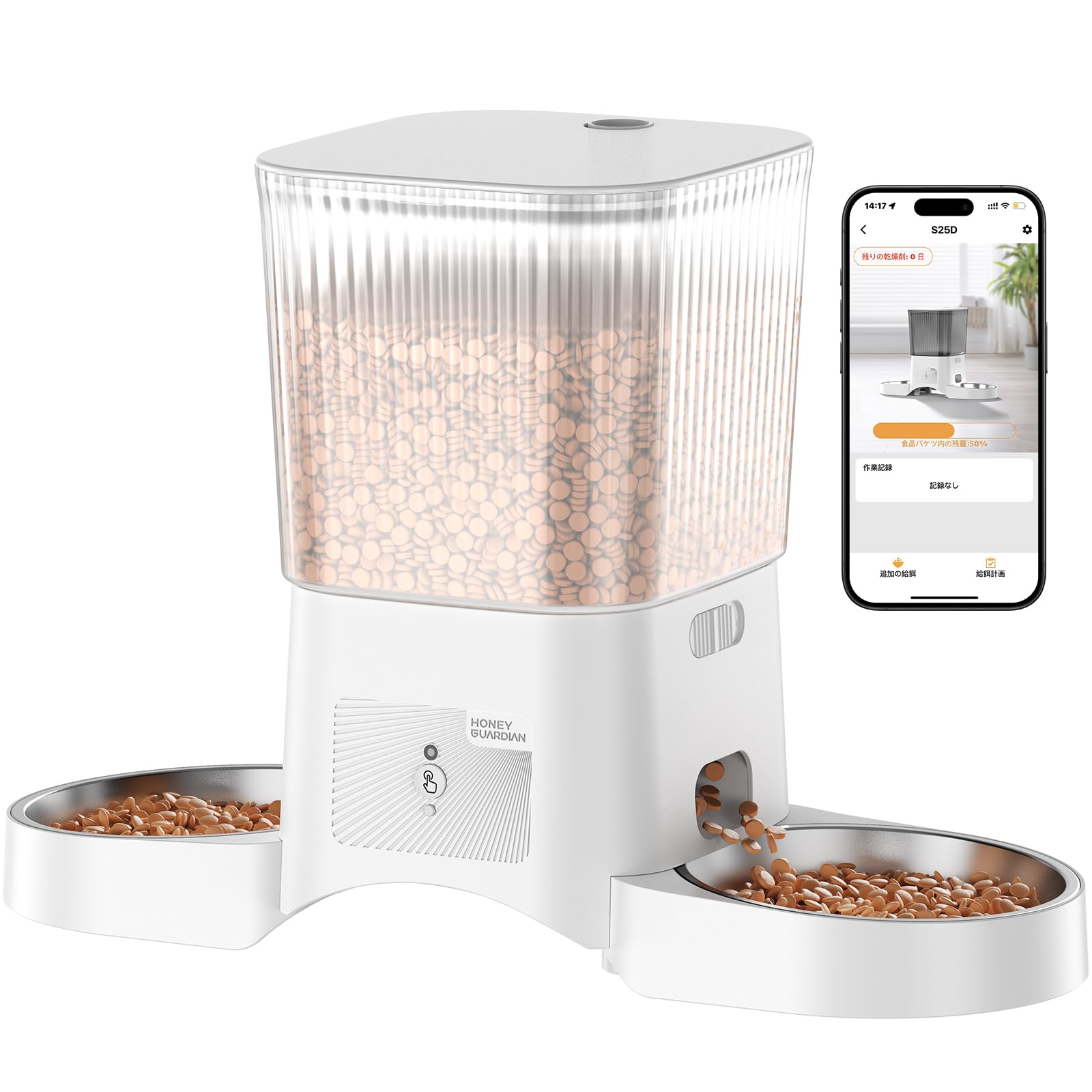 HoneyGuardian 自動ペット給餌器 防湿・防虫設計 3.5L 二重ステンレスボウル 1-6回給餌プログラム 音声録音/手動給餌 両用電源 ホワイト