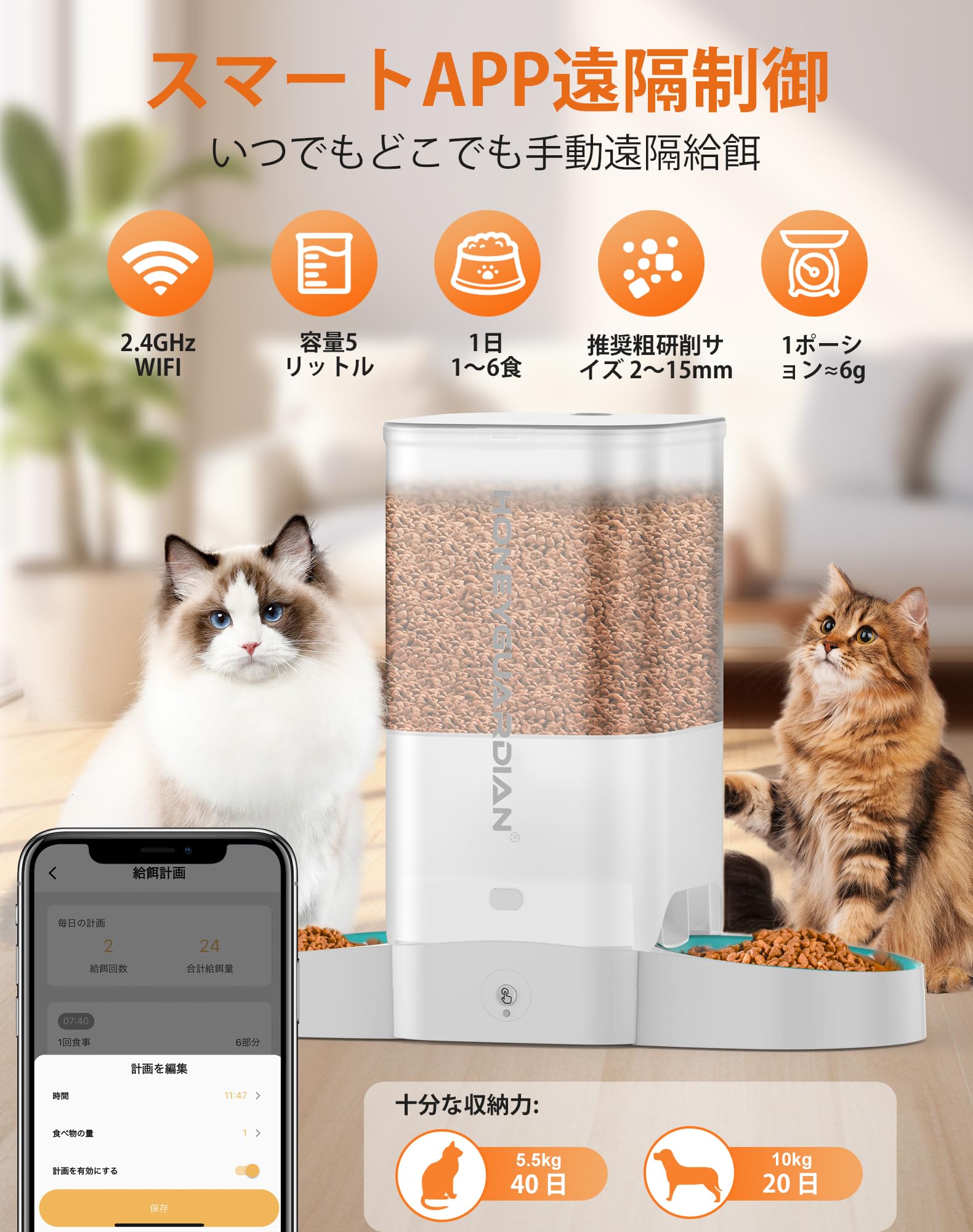 HONEYGUARDIAN 自動給餌器 猫 2匹 スマホ遠隔操作 WiFi接続式 多頭飼い 自動餌やり機 3.5L容量 定時定量 1日6食 猫 餌 自動 2個のステンレスボウル付き スマホ管理 2WAY給電 IOS Android対応 日本語対応アプリ ブラック
