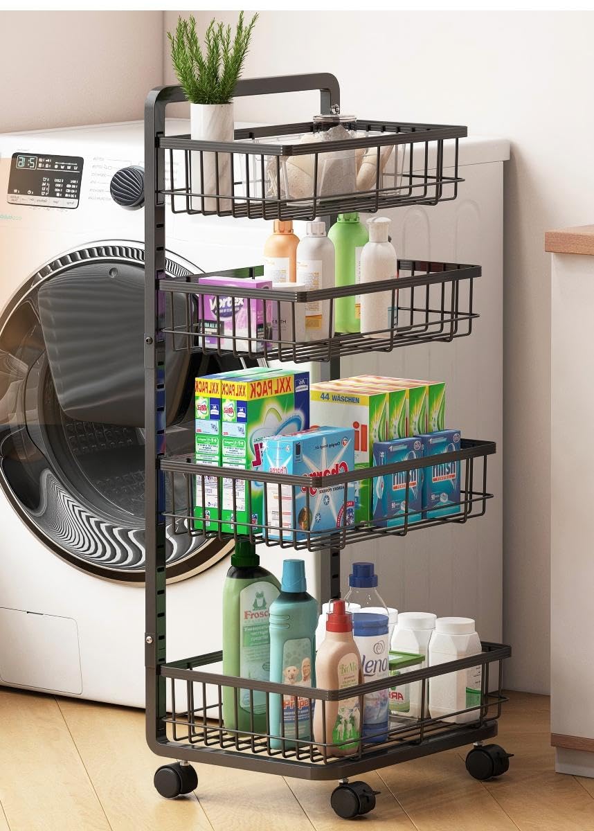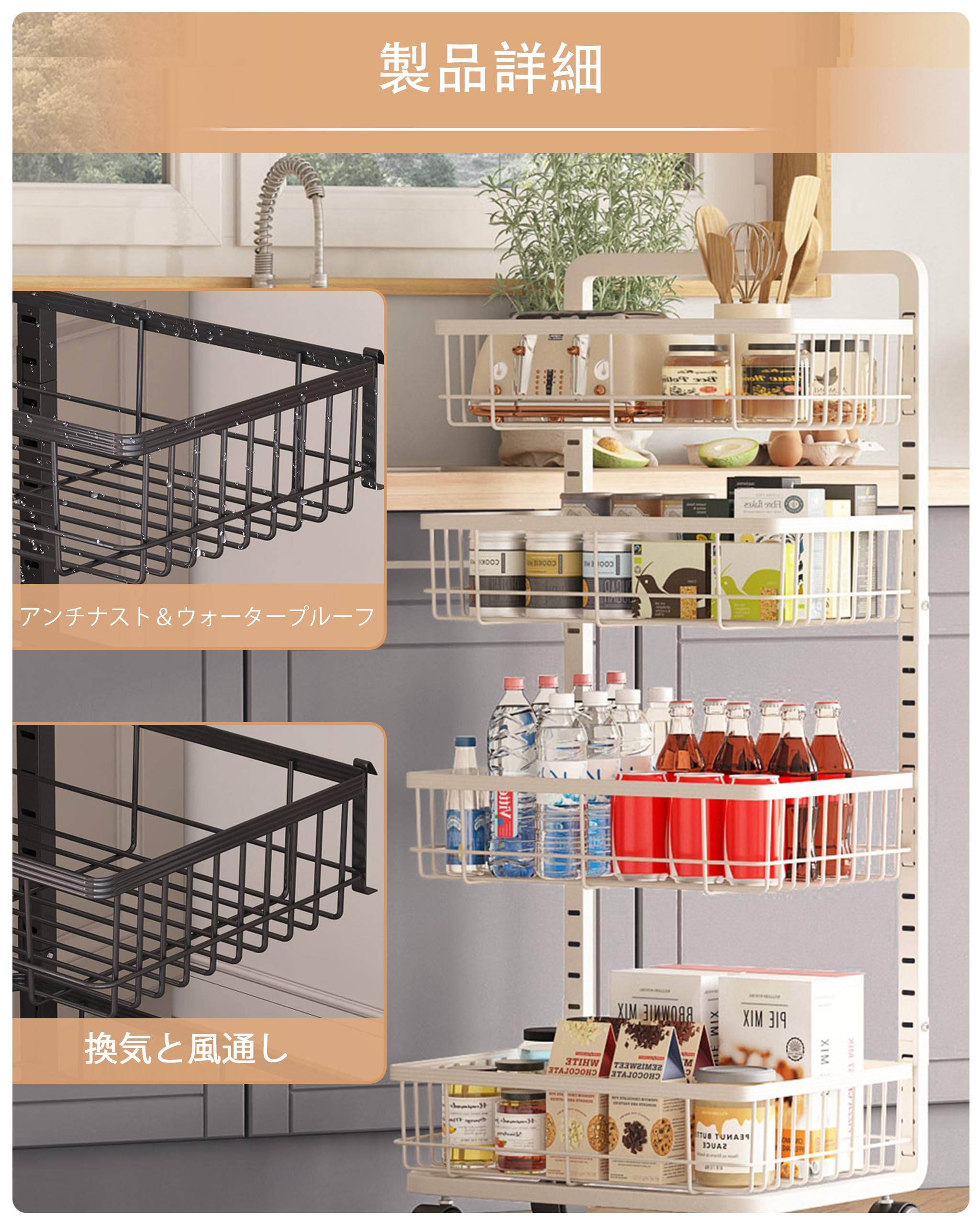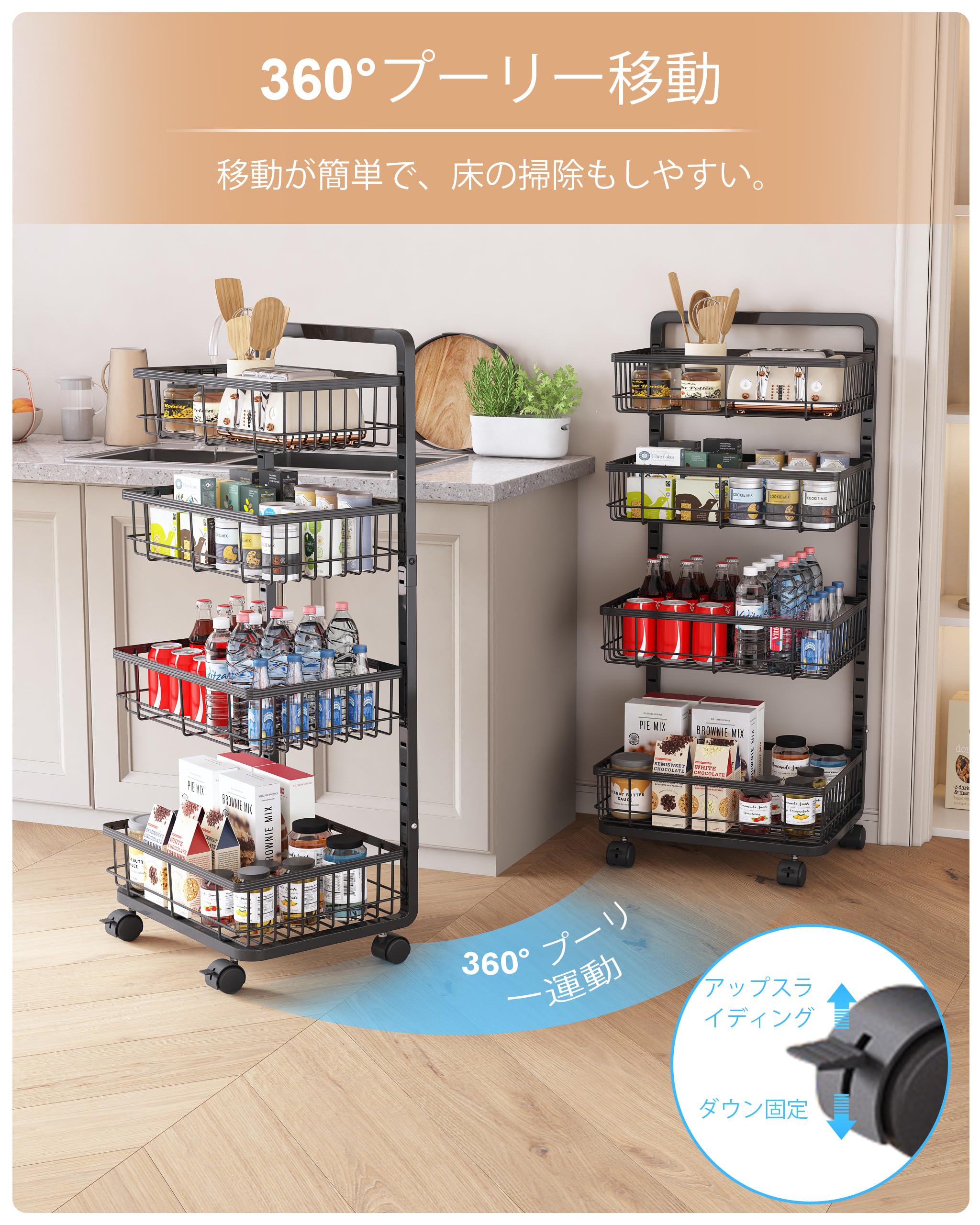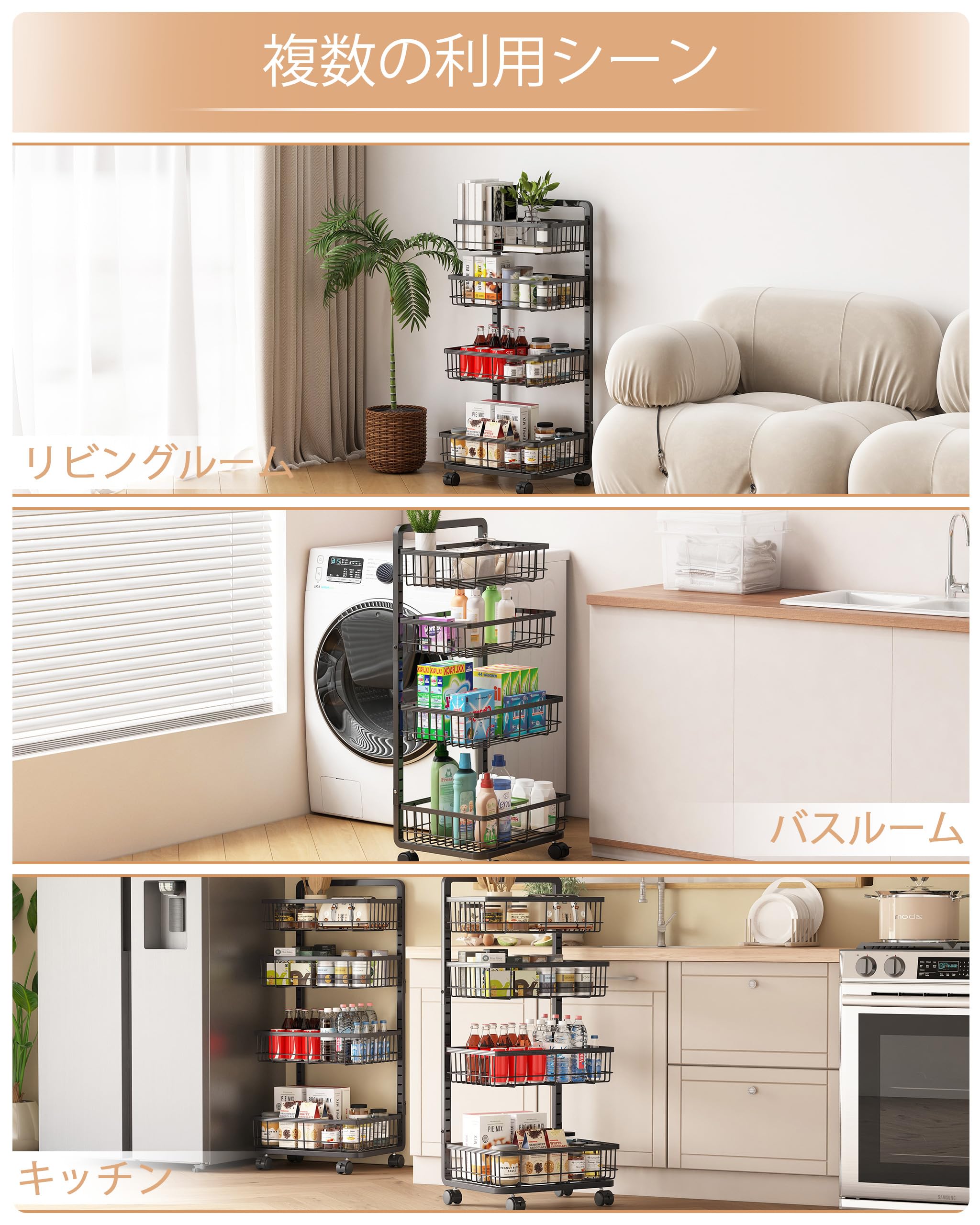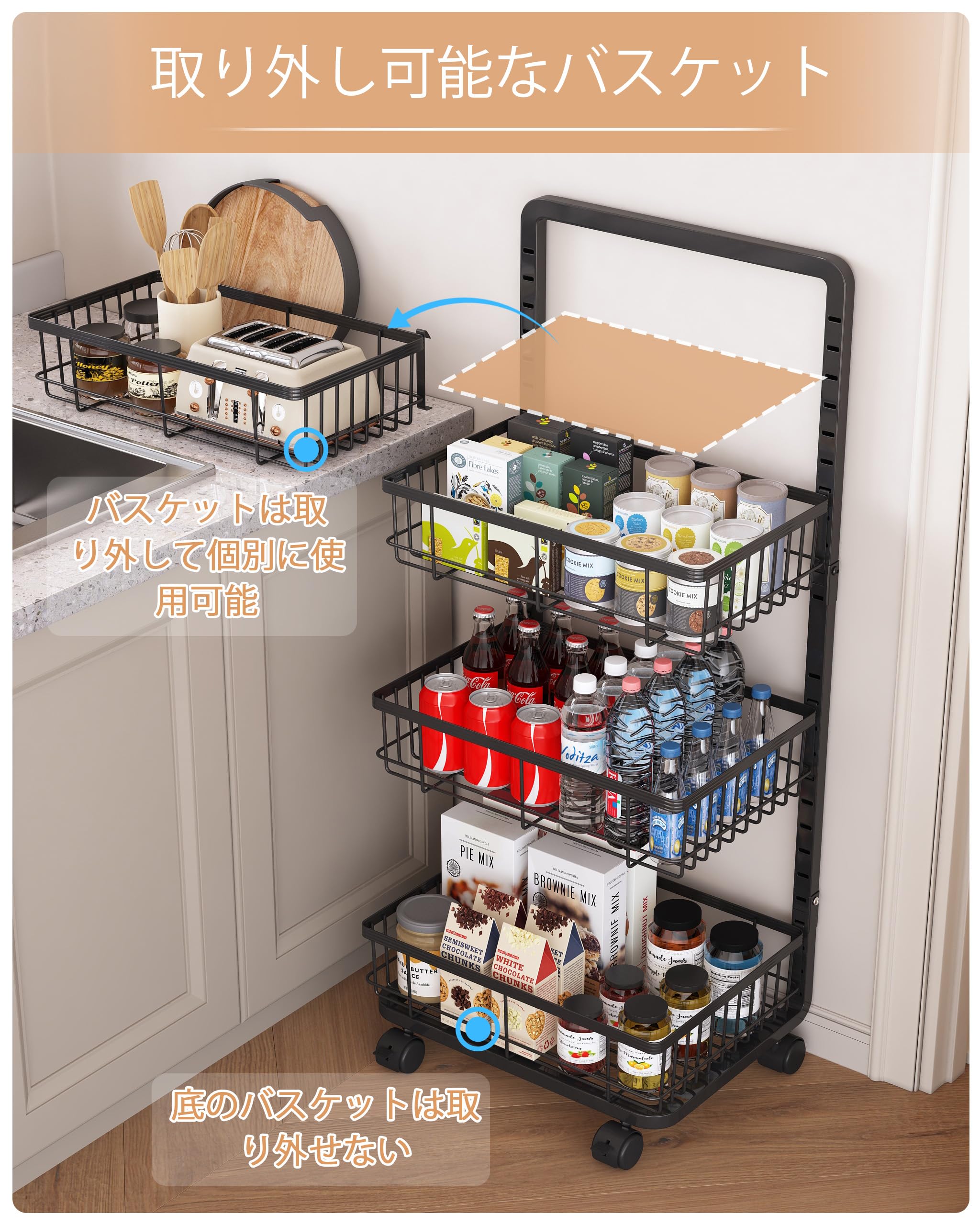 キッチンワゴン 収納カート 隙間収納 360度キャスター付き 移動式 引き出し付き 収納ワゴン バスケットラック 取り付け不要 スリム 多段収納 すき間ワゴン キッチン・バスルーム・リビング対応 省スペース ラック スライド式 (ブラック, 幅13cm-4段)