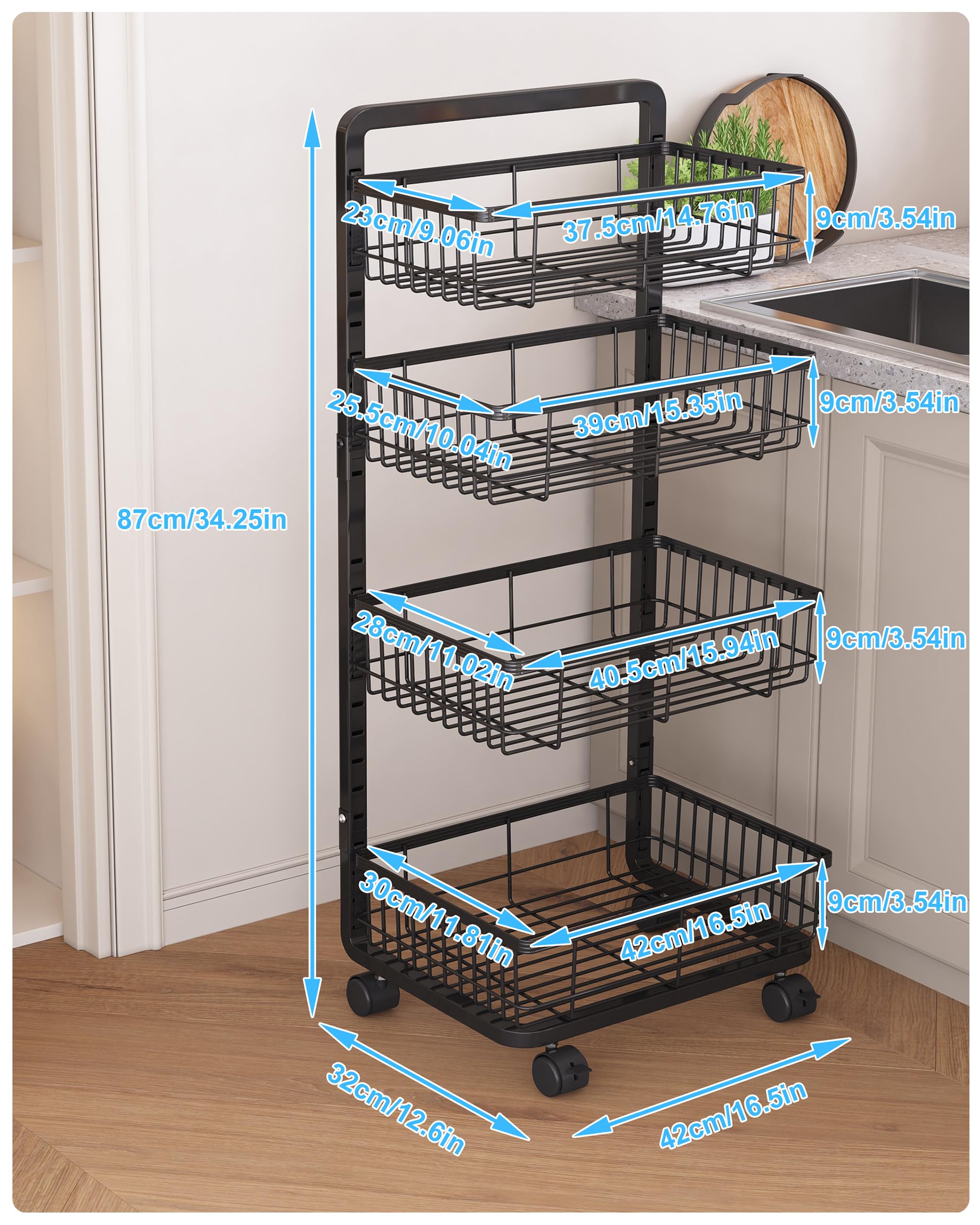 Ornestia キッチンワゴン キャスター付き スリム隙間収納 4 段ラック 炭素鋼製 段数調節可能 42×32×87cm キッチン・洗面所・冷蔵庫・浴室多用途 (ブラック)