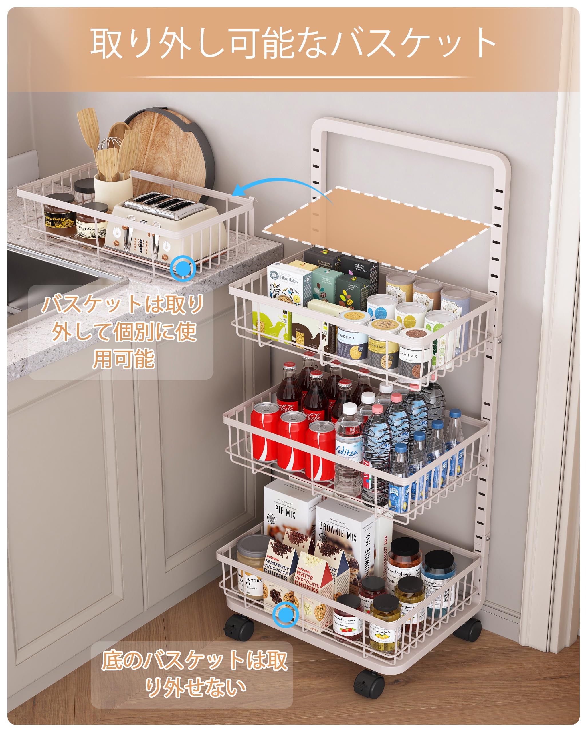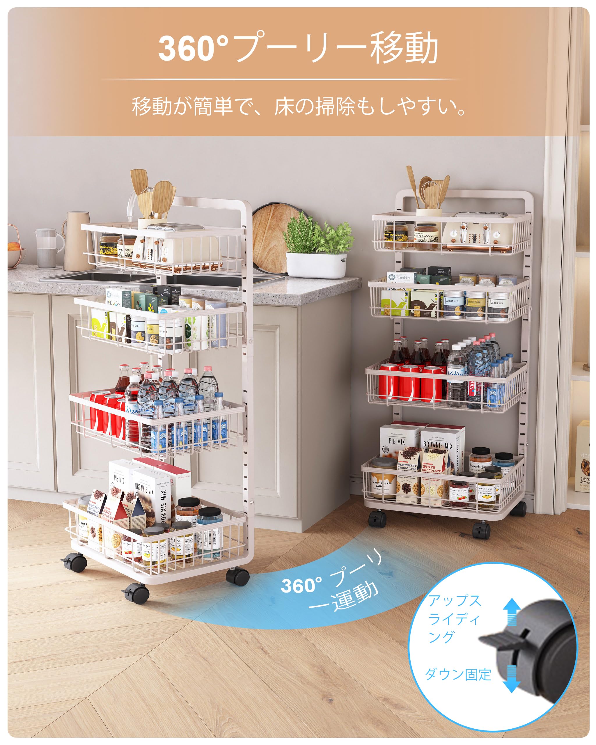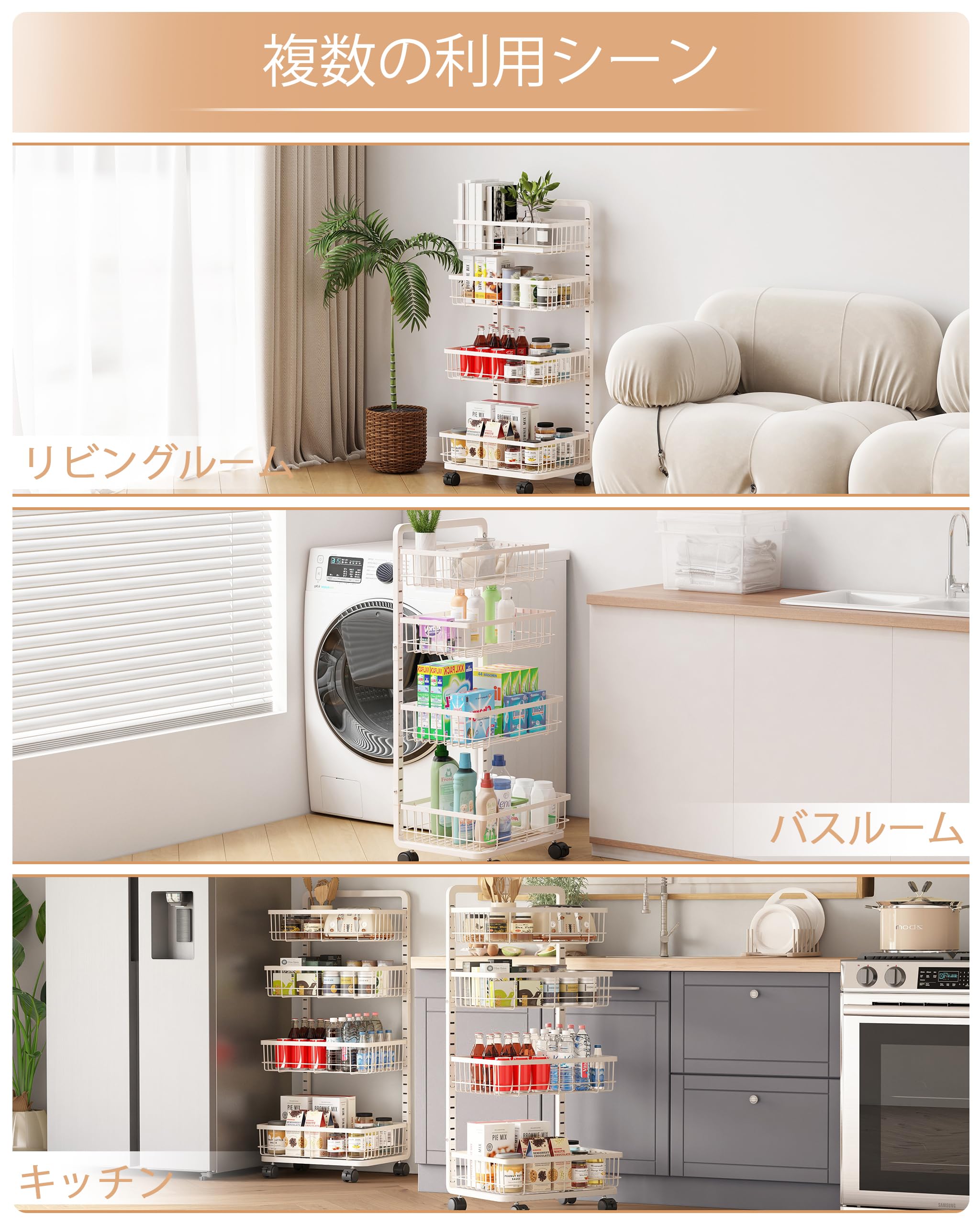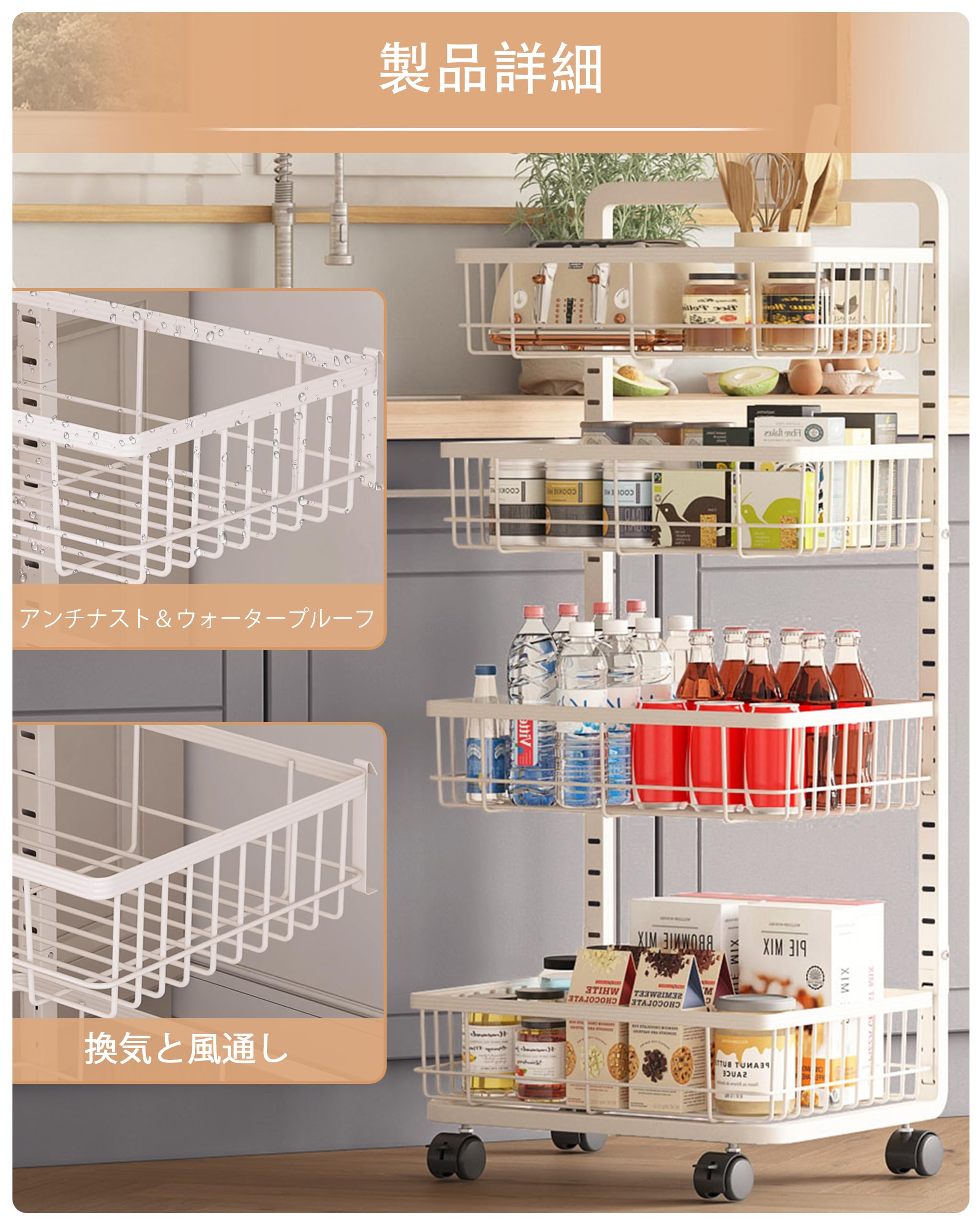 LIANTRAL キッチンワゴン 4段 スチールラック 収納ワゴン ストッパー付きキャスター キッチンラックと木天板付き キッチン収納カート すきま ストックラック ブラック Medium