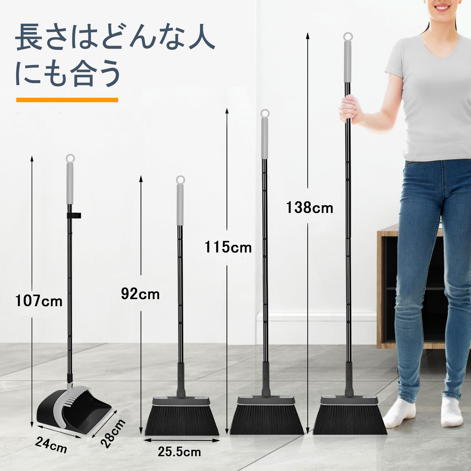 JEHONN ほうきちりとり掃除セット,108cm-138cm,自立掃除道具,防風塵取り収納に便利室内玄関ホーム庭園ショッ落ち葉プ最適