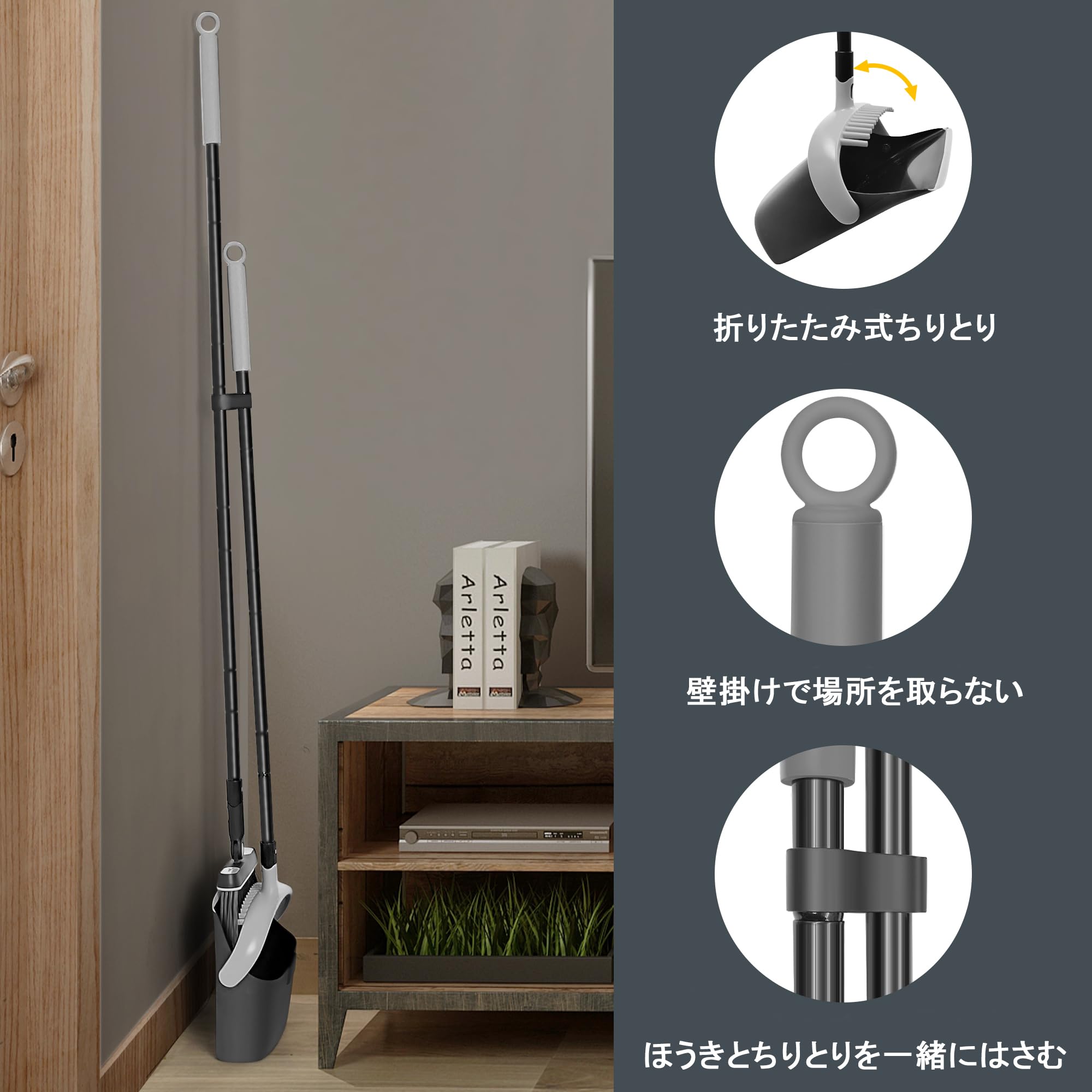 JEHONNほうき ちりとり セット室内 屋外, 138cmロングハンドルホウキ ちりとり セット軽量180度回転自立掃除道具, 防風塵取り室内玄関ホーム庭園ショッガーデニング(黒とグレー)