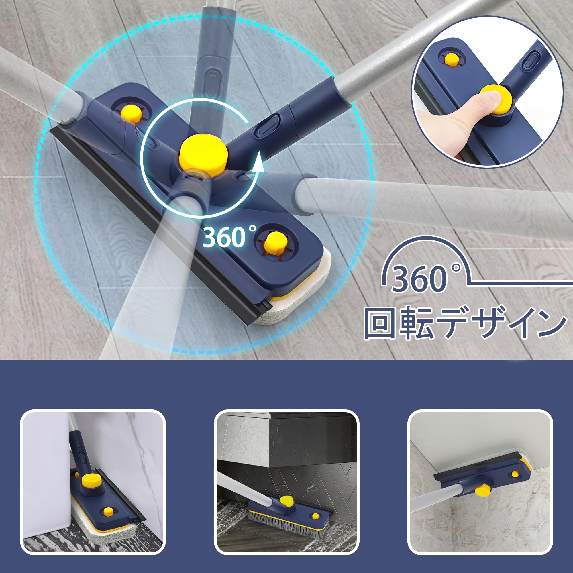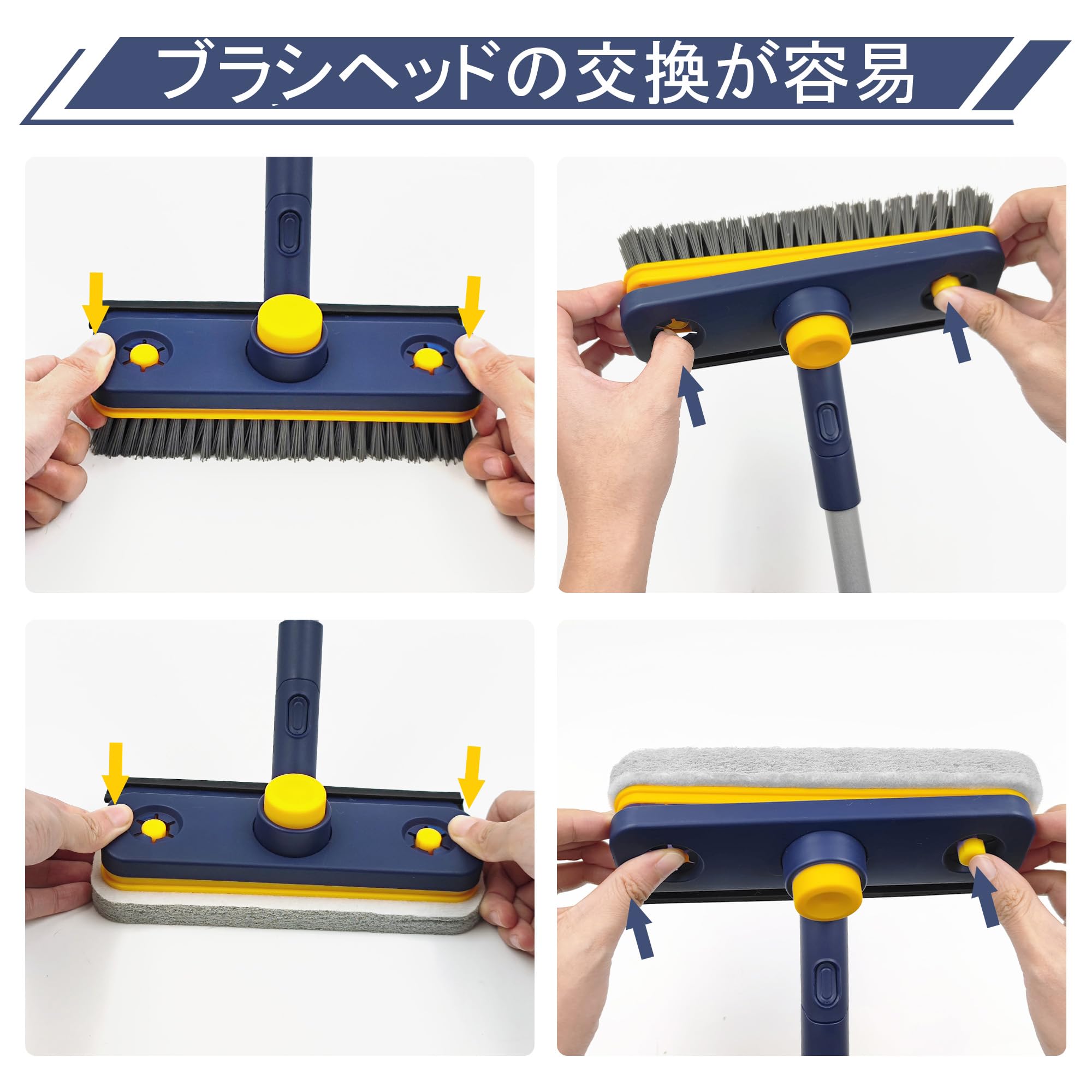 JEHONN デッキブラシ掃除用ブラシ伸縮ロング106-130cm,浴室の浴槽の流しの床の壁のための4つの異なったお風呂掃除 ブラシの頭部(青)