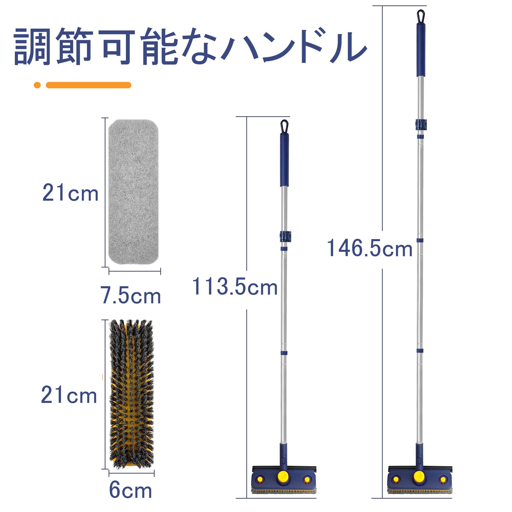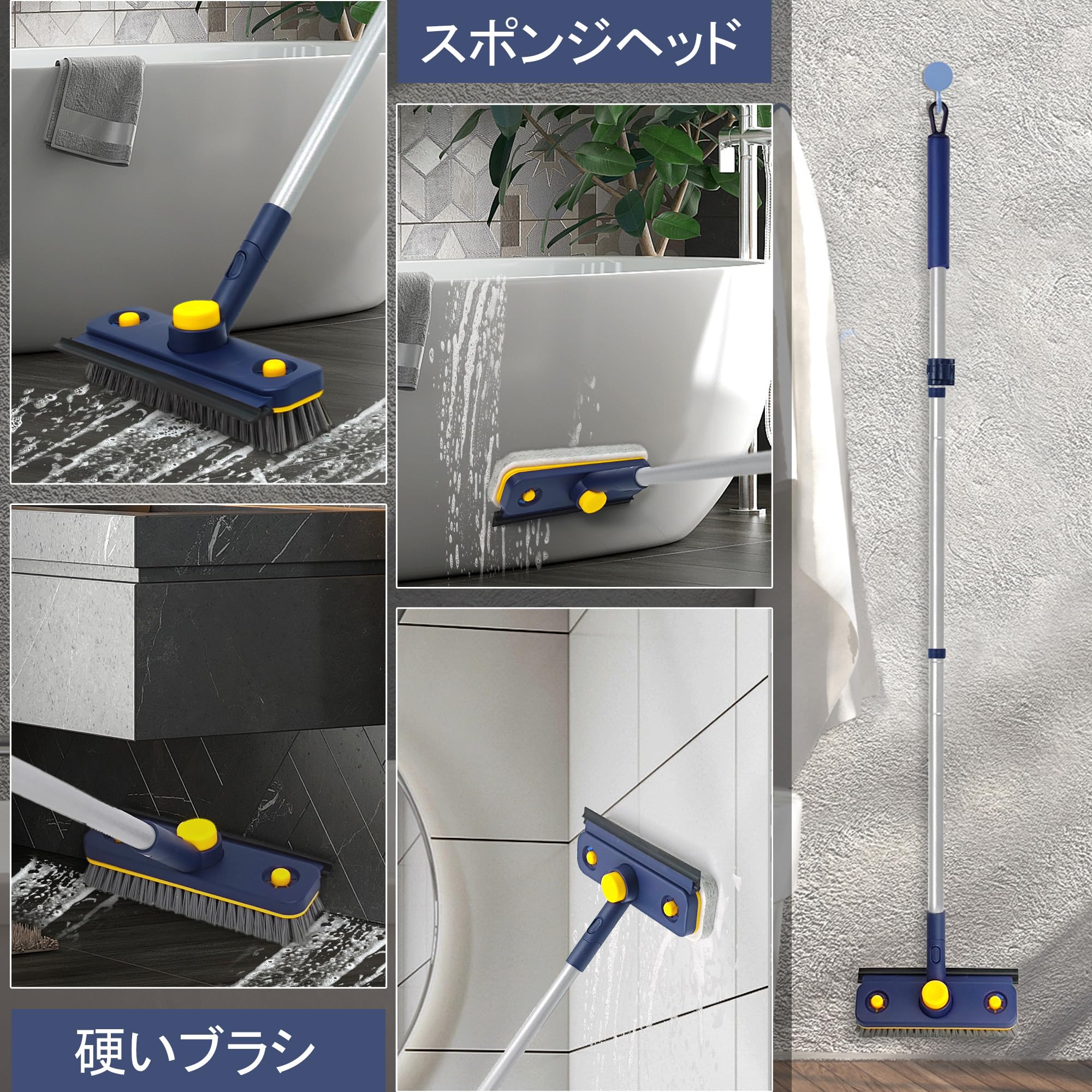 JEHONNお風呂掃除ブラシデッキブラシ長さ調節可能113cm - 146cm, 3 in 1ゴムポンバスブラシ浴室、テラスの清掃に使用