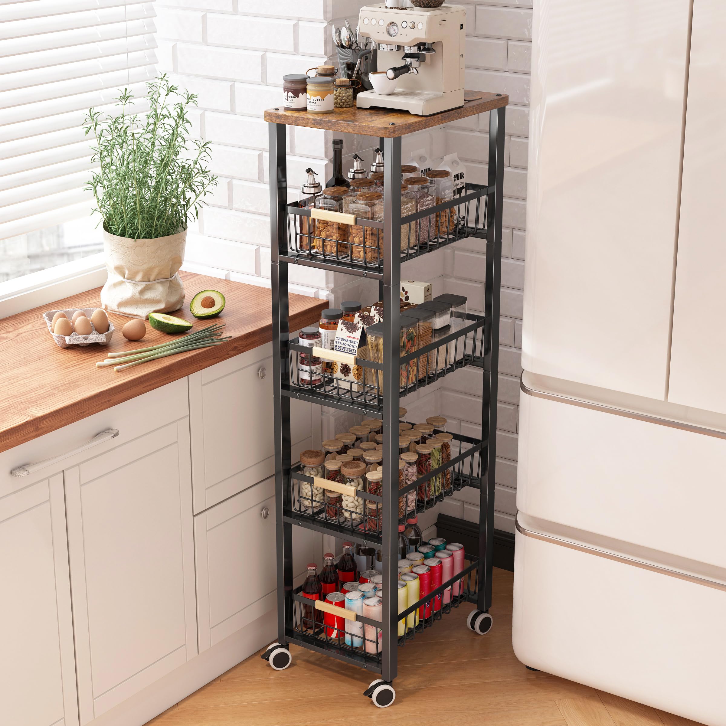 TUYOBIキッチンワゴン スリム 隙間収納 キャスター付き 収納ワゴン 4段 幅12×奥行35×高さ101CM サイド収納 調味料ラック ワゴンカート 台所収納 収納ラック 棚 バスケット 移動式 ブラック