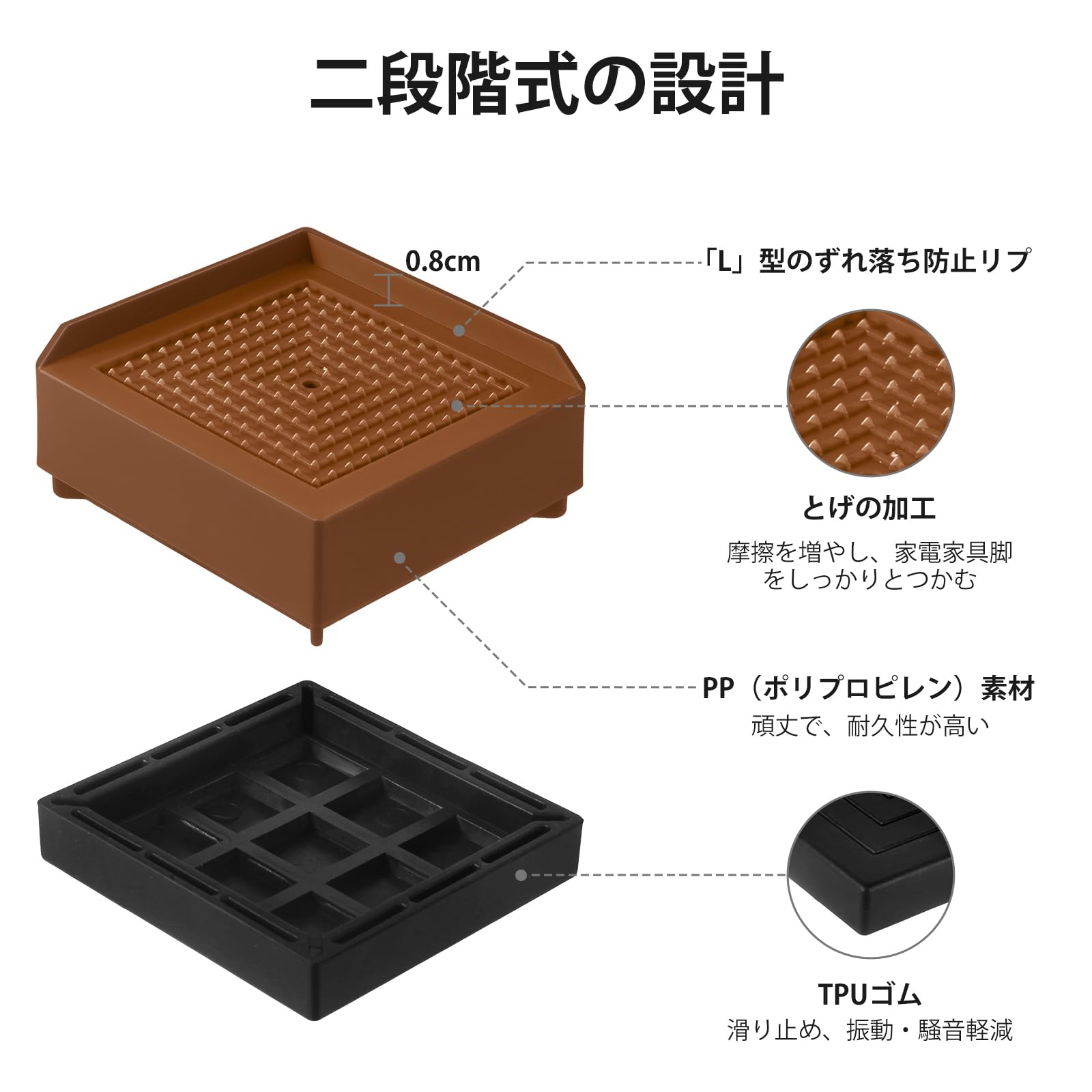 Uping 継ぎ脚 高さ調整脚 継足 8個セット2Way 2.8cm 5.3cm 調整可能 延長脚 アジャスター ベッド・テーブル・ソファ・机・こたつ 高さを上げる足 テーブル脚台 多段階 高さ調節脚 暖房器具 角型 家具 脚台 つぎあし 底上げ 最大四段階重ねる