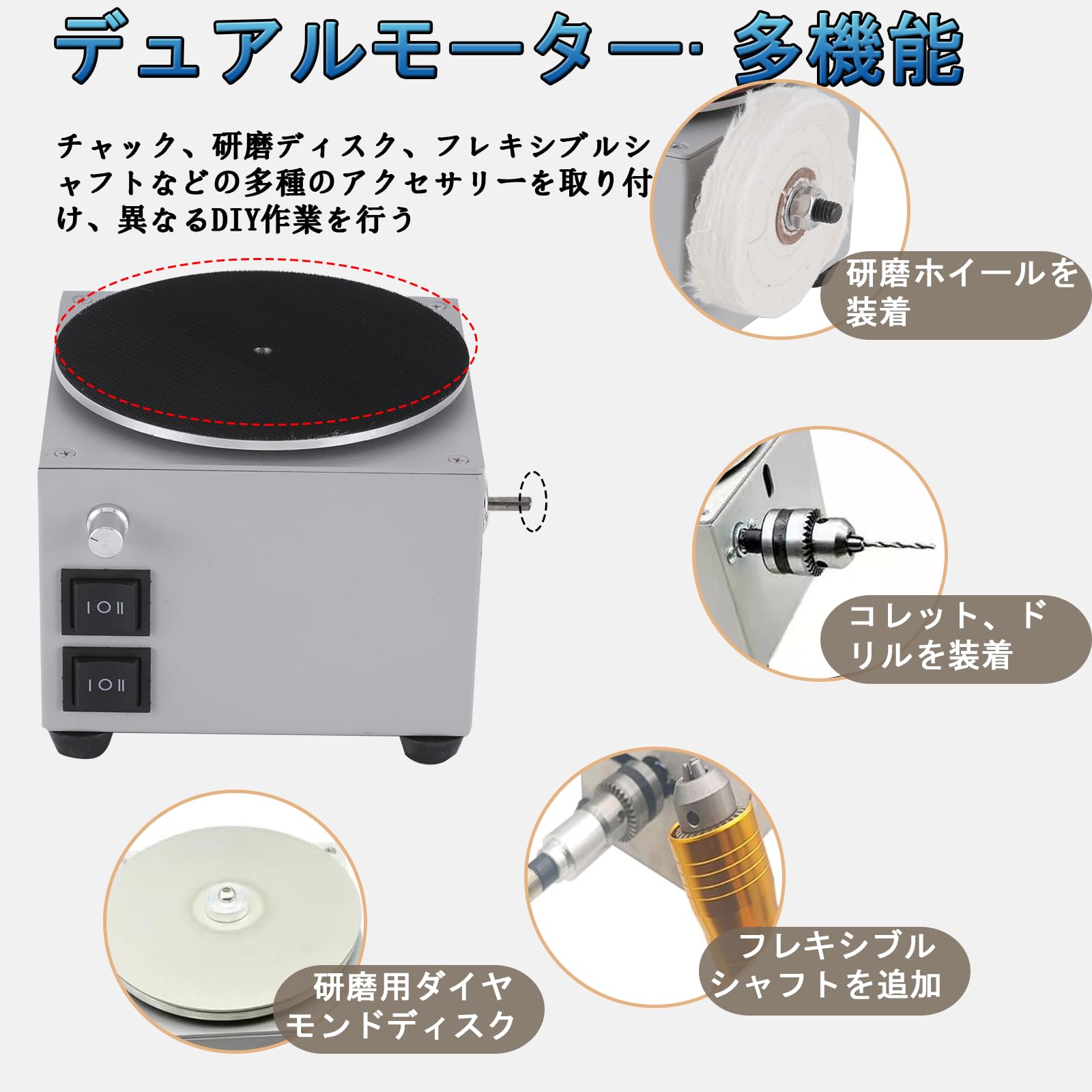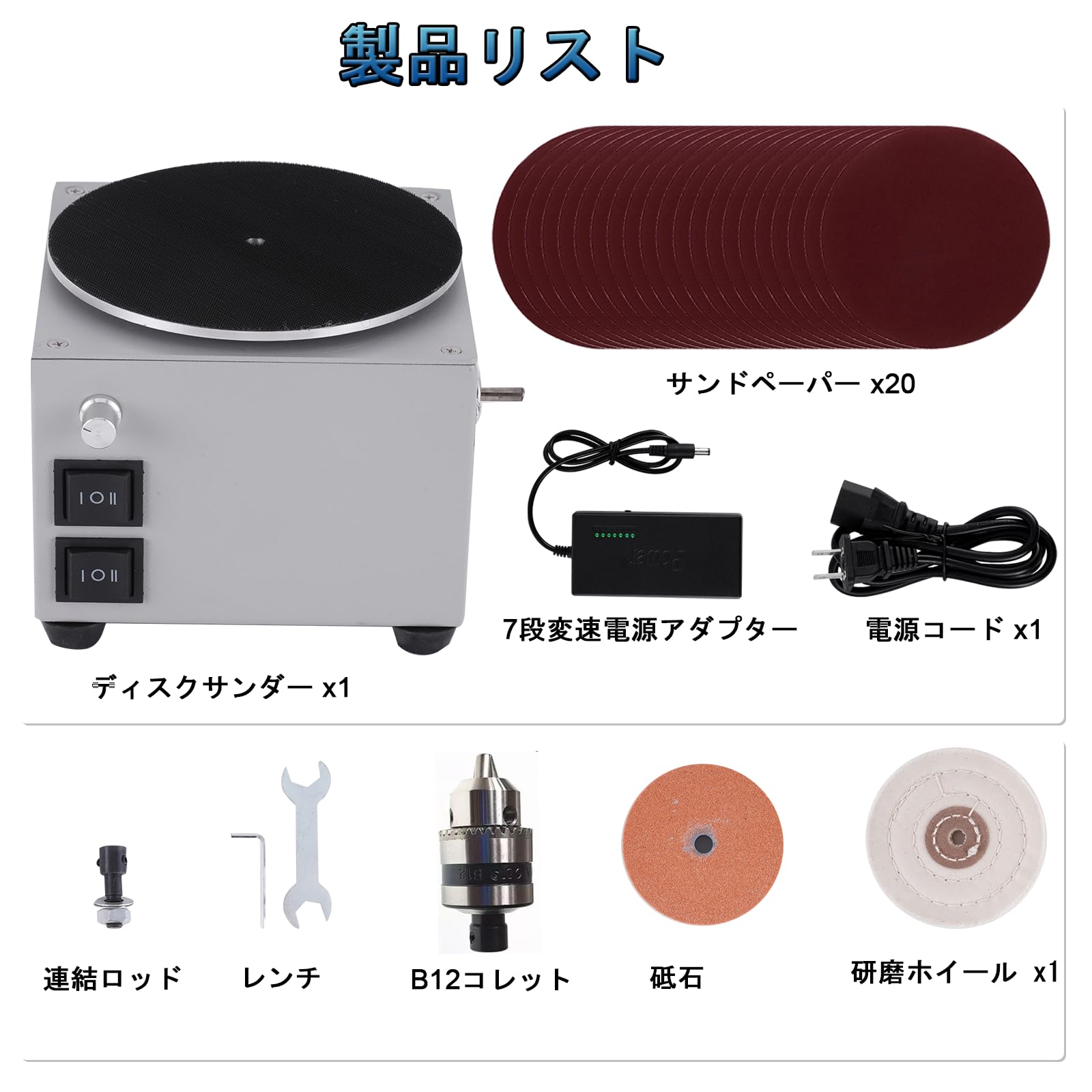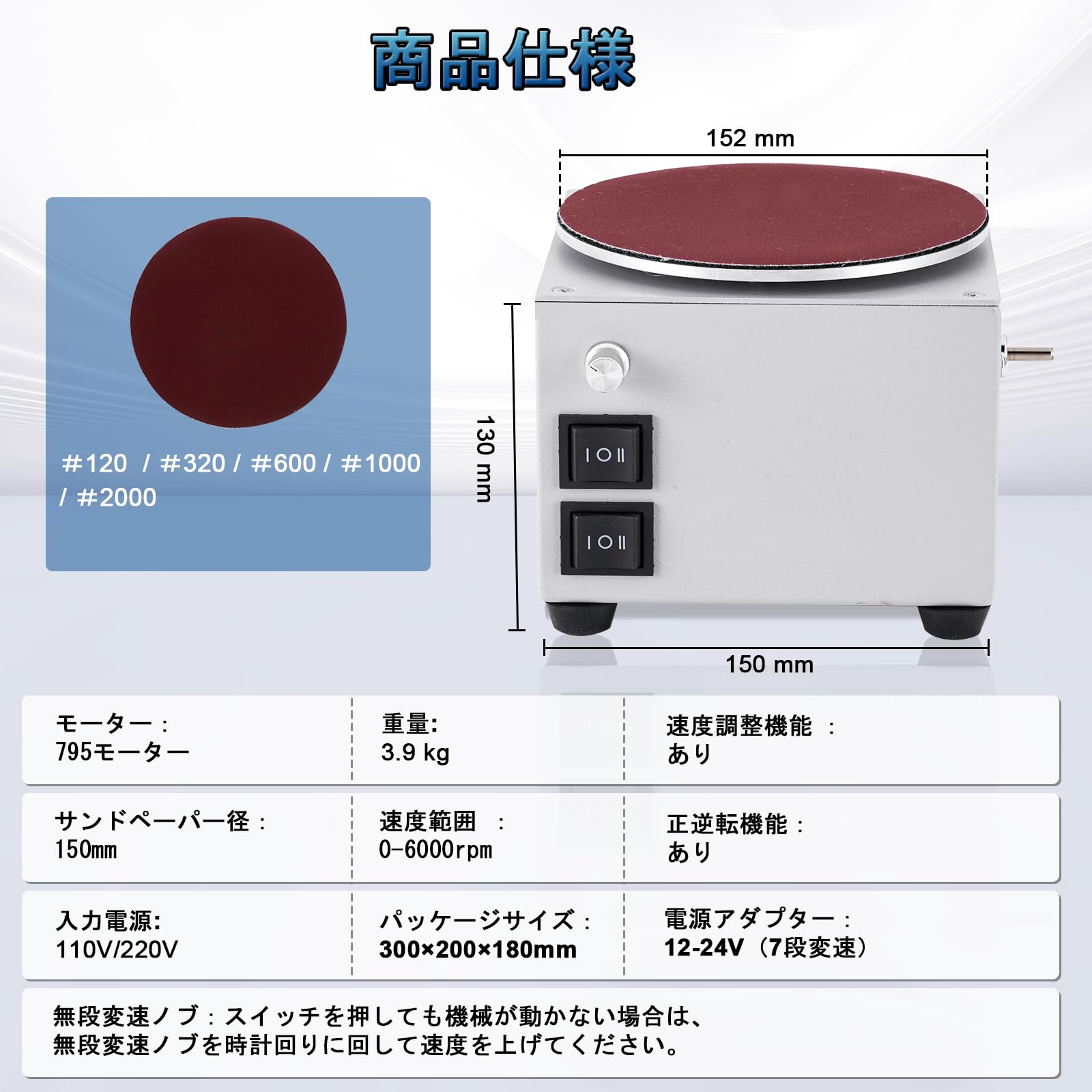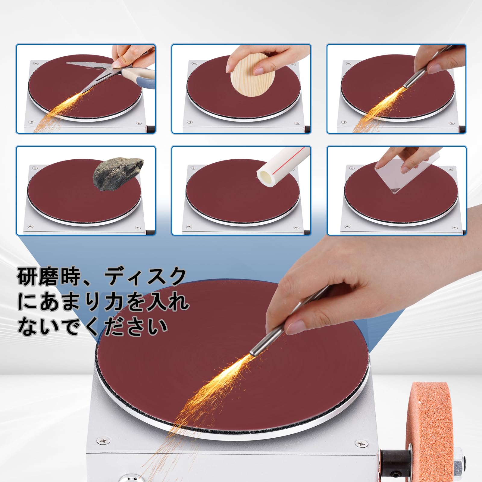 【用途】包丁などの刃物の研ぎ、金属、プラスチック、玉石、陶磁器などの研削、穴あけ、磨き、DIY 【特徴】 ●回転速度が調整できます。 ●デュアルモーター式で、機能を拡張することができ、軟軸をドリル取り付けDIY彫刻などをします。 ●正逆転機能あり ●サンドペーパーはダイヤモンド研磨ディスクに交換可能(ダイヤモンドディスク外径:15cm 穴径:12.7mm。ジョイントとダイヤモンド研磨ディスクは付属していません。) ●サンドペーパー径:150mm.粒度:#120、#320、#600、#1000、#2000. ●付属品:ディスクペーパー/砥石/バフ研磨ホイール/チャック/スパナ/ジョイント/変速電源/取扱説明書 保証期間:1年 ご注意: ①電源を入れても動作しない場合は、モーターの速度が低すぎる可能性があります。速度調整つまみで速度を上げます。 ②ディスクを強く押さないでください 使用後に自然冷却する必要があります。