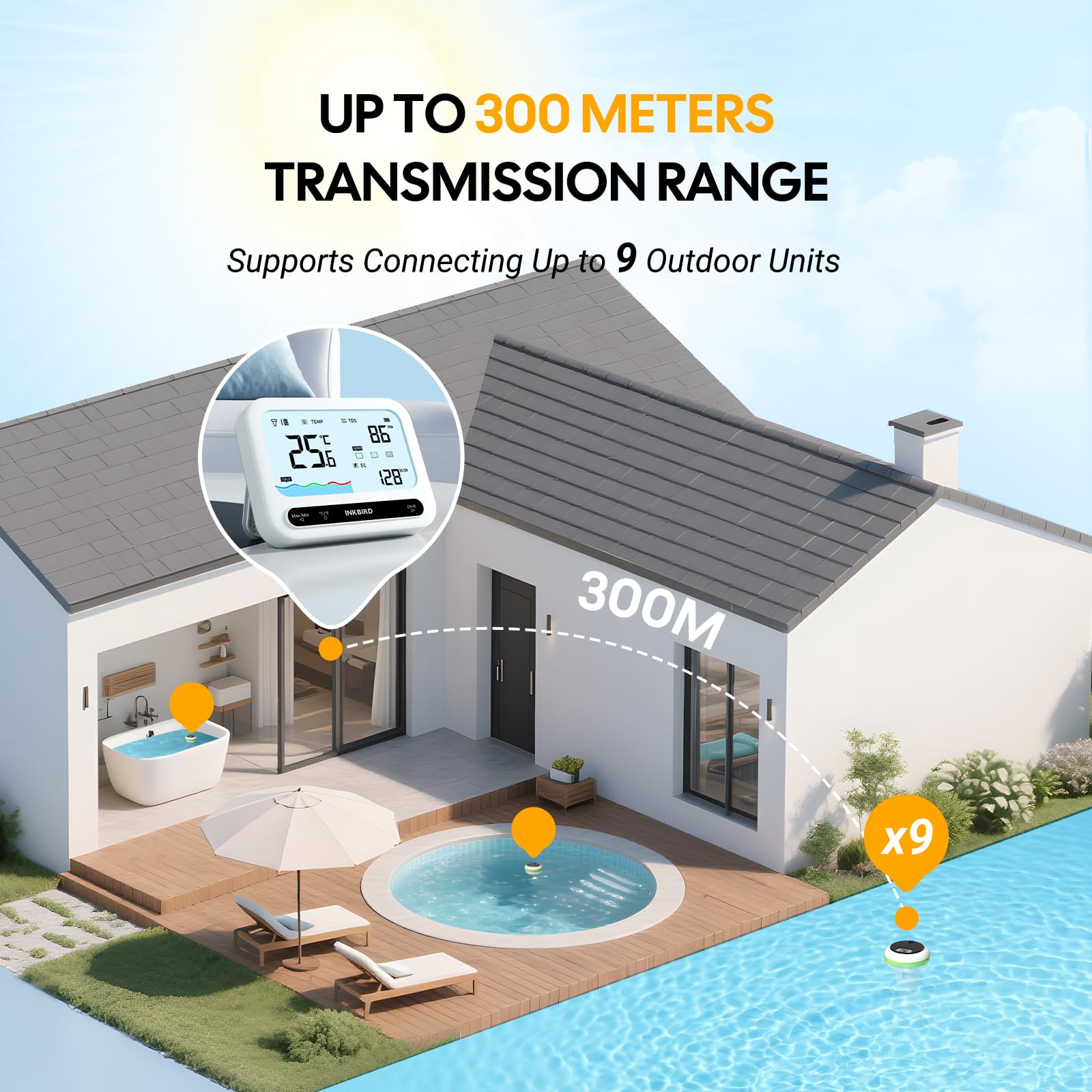 INKBIRD 水温計 お風呂 太陽エネルギー スイミングプール温度計 IP68 防水 室内温度湿度検知器セット WiFiワイヤレス接続 水槽 浴場 浴槽 IBS-P03R