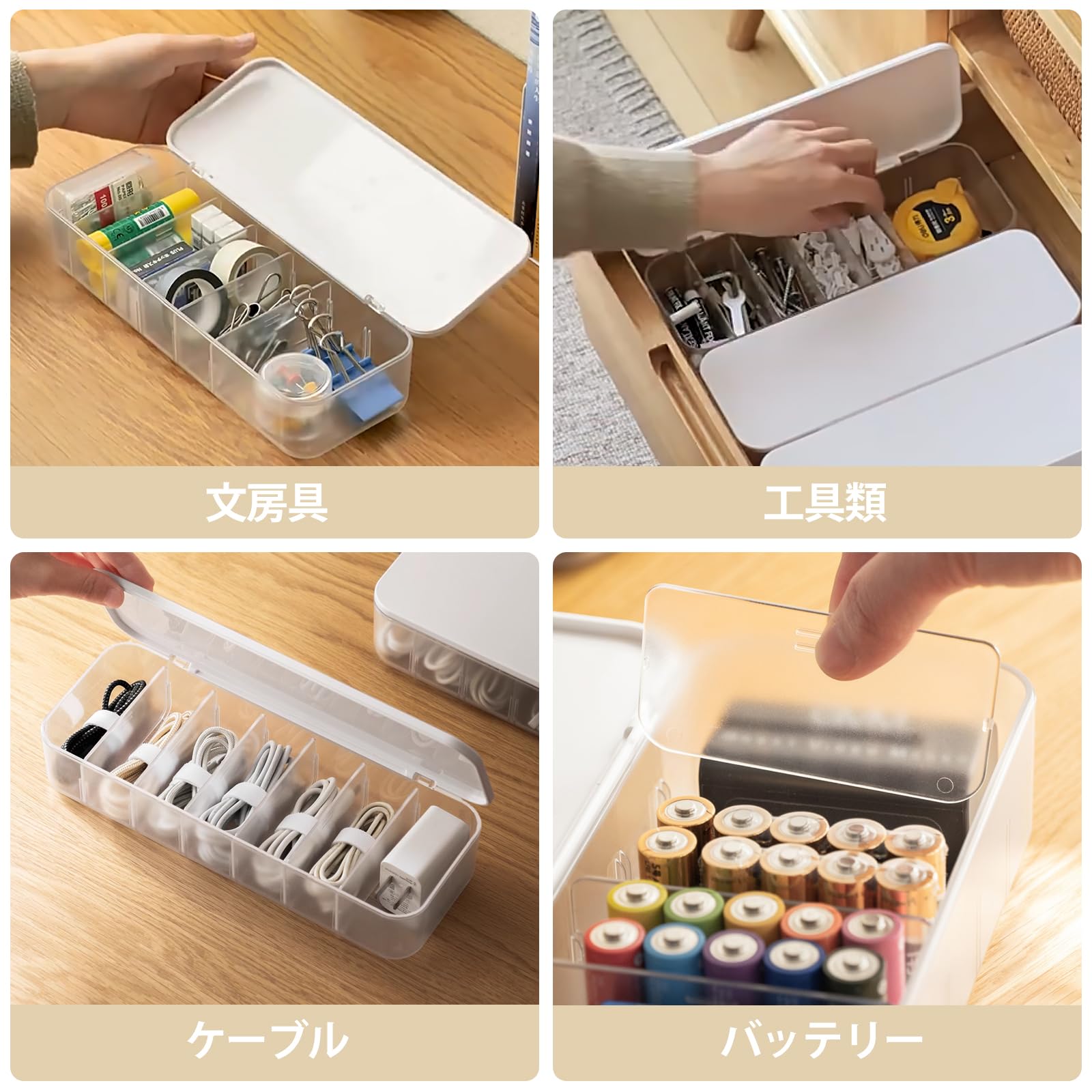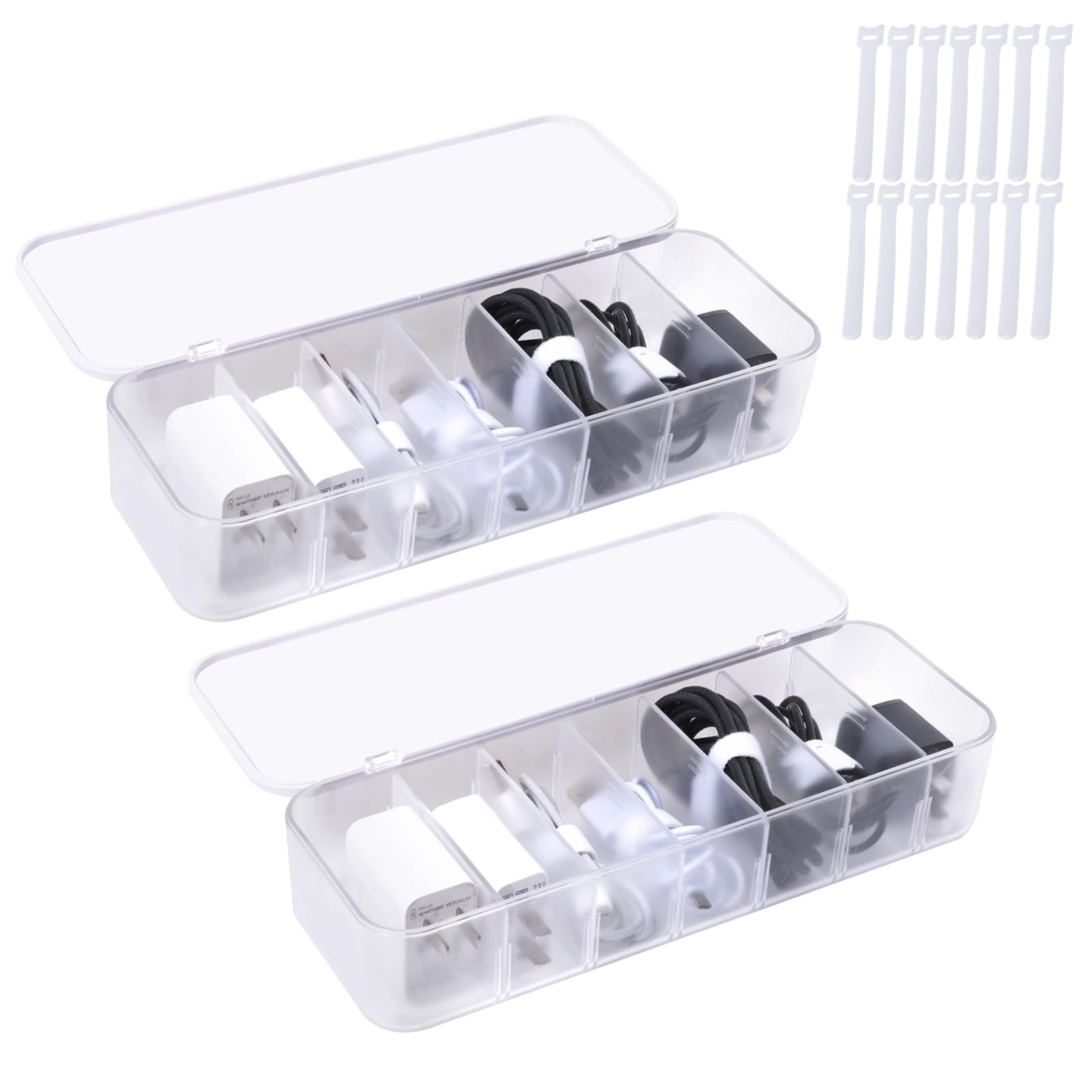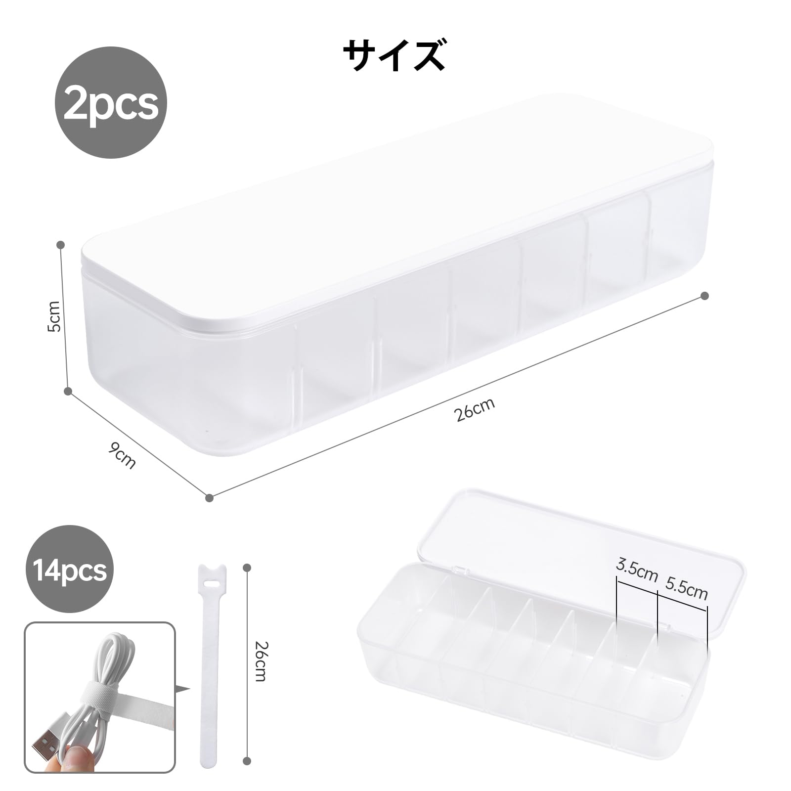 FRETONBA ケーブル 収納ボックス 2個セット 仕分けボックス コード収納ボックス 小物収納ボックス 蓋付き 埃防止 防水 充電器収納ボックス 取り外し可能仕切り コード固定用タイ14本付き 卓上収納 家庭用 オフィス用 整理整頓 ケーブル収納ケース 小物文具収納ケース