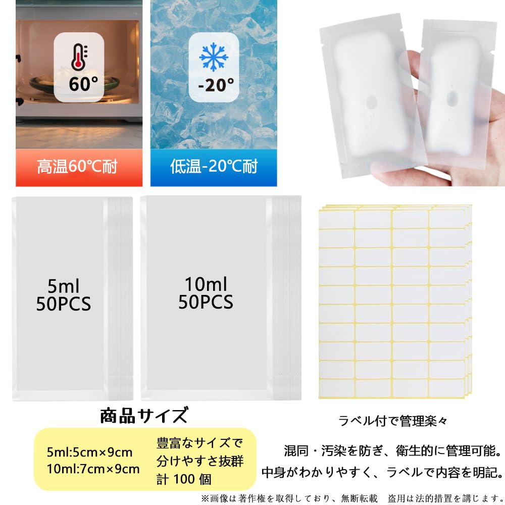 熱圧着 パウチ 小分け100枚 5ml/10ml パウチ容器 トラベルボトル シャンプー 詰め替えボトル 化粧水 乳液 クリーム サンスクリーン ラベル付で 収納 漏れ防止 袋入り 個包装 使い捨て 出張 旅行 便利グッズ 透明 密封 コンパクト 機内持ち込み可能 携帯易い (5ml/10ml)