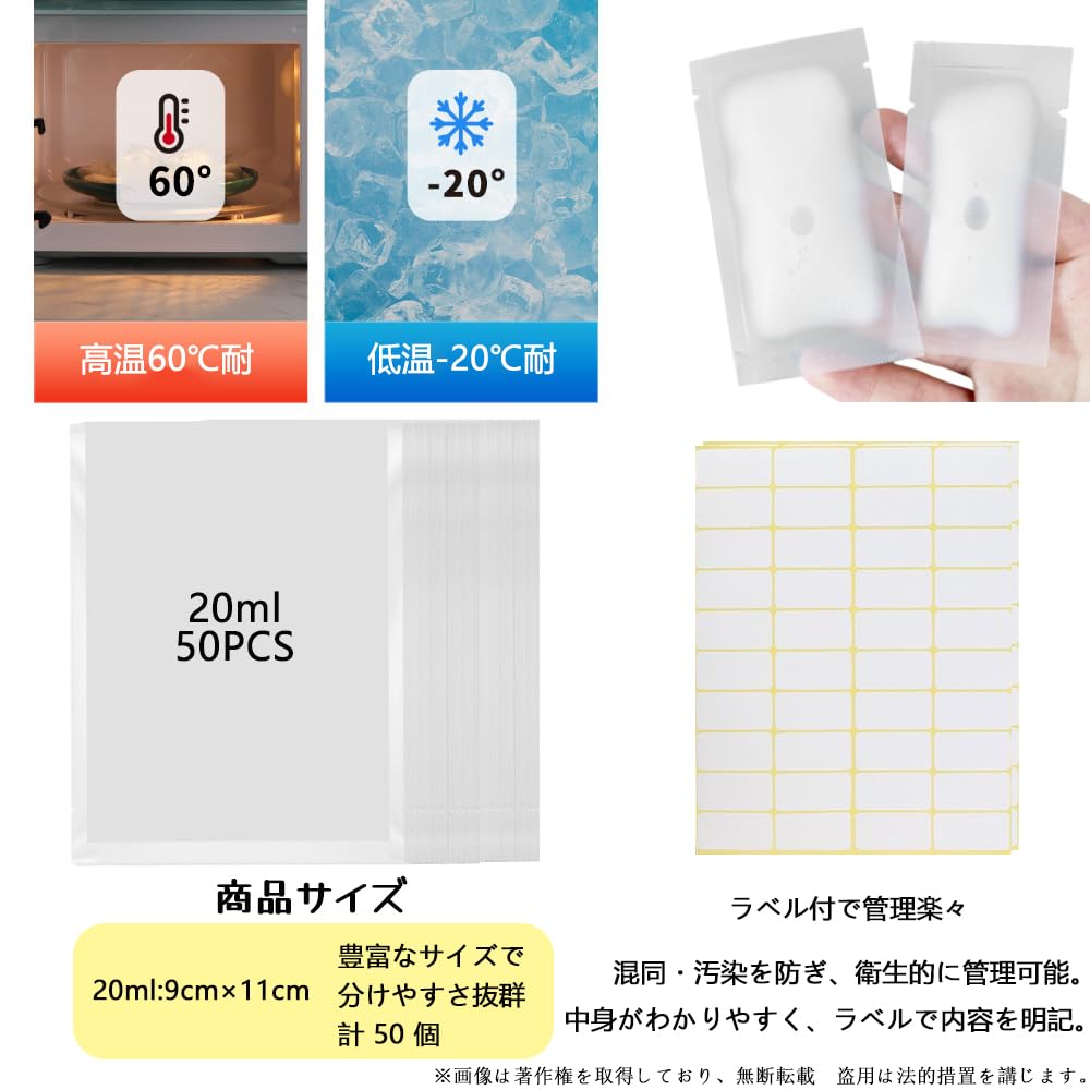 熱圧着 パウチ 小分け50枚 20ml パウチ容器 トラベルボトル シャンプー 詰め替えボトル 化粧水 乳液 クリーム サンスクリーン ラベル付で 収納 漏れ防止 袋入り 個包装 使い捨て 出張 旅行 便利グッズ 透明 密封 コンパクト 機内持ち込み可能 携帯易い(20ml)