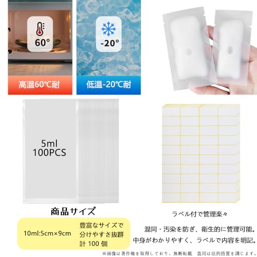 Kamiqiou 熱圧着 パウチ 小分け100枚 5ml パウチ容器 トラベルボトル シャンプー 詰め替えボトル 化粧水 乳液 クリーム サンスクリーン 収納 漏れ防止 袋入り 個包装 使い捨て 出張 旅行 便利グッズ 透明 密封 コンパクト 機内持ち込み可能 携帯易い (5ml)