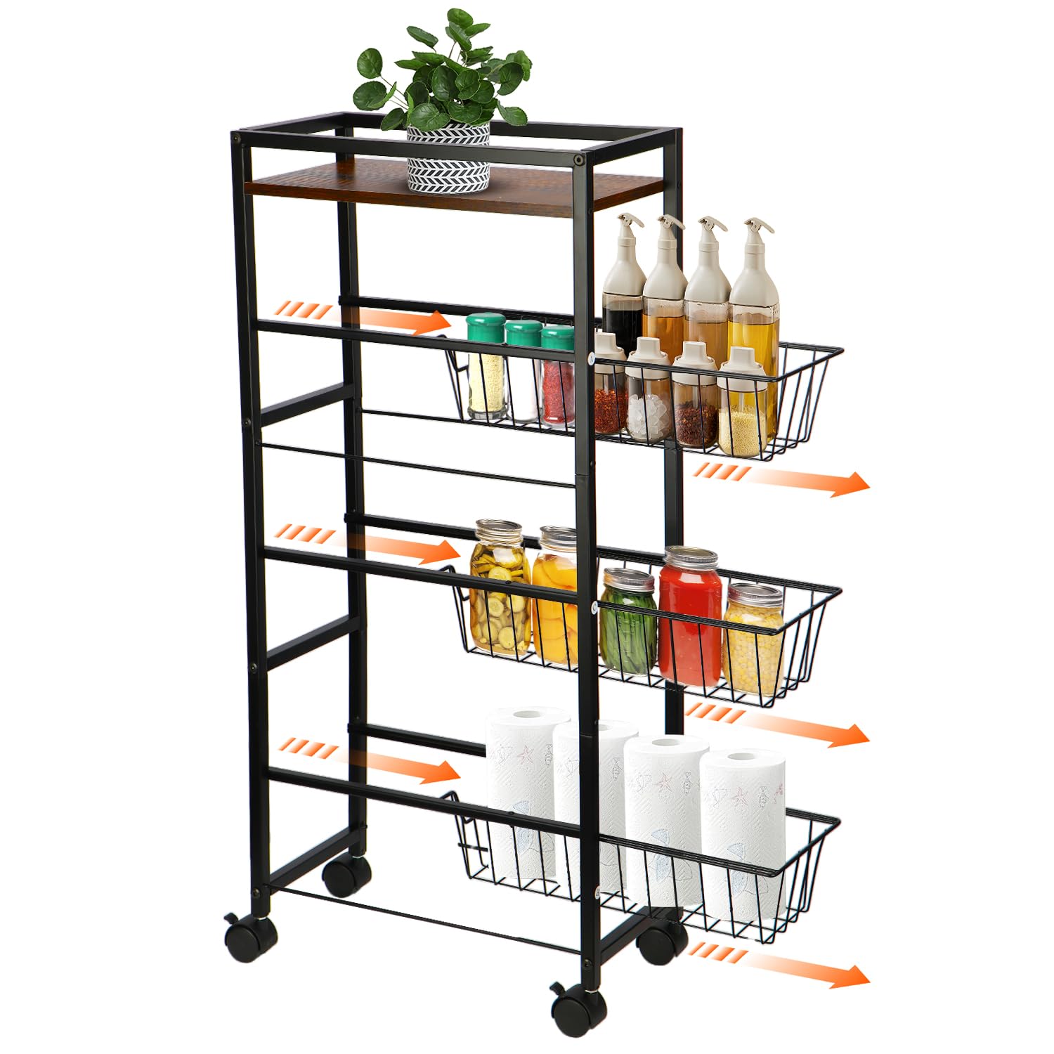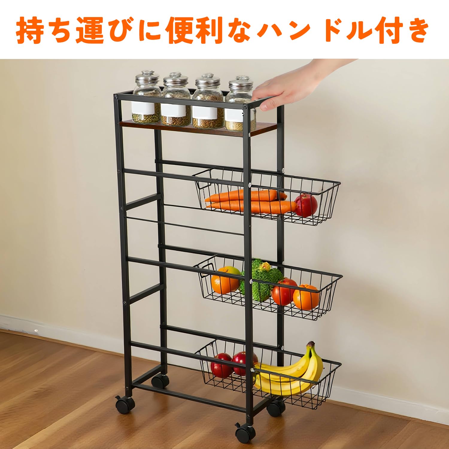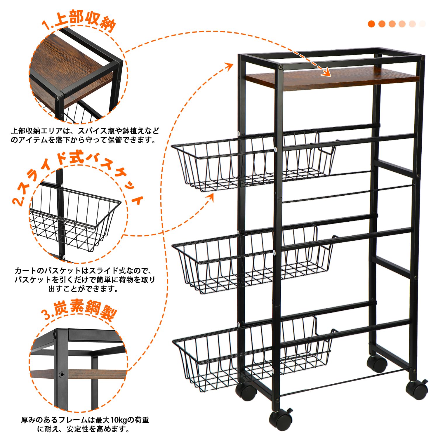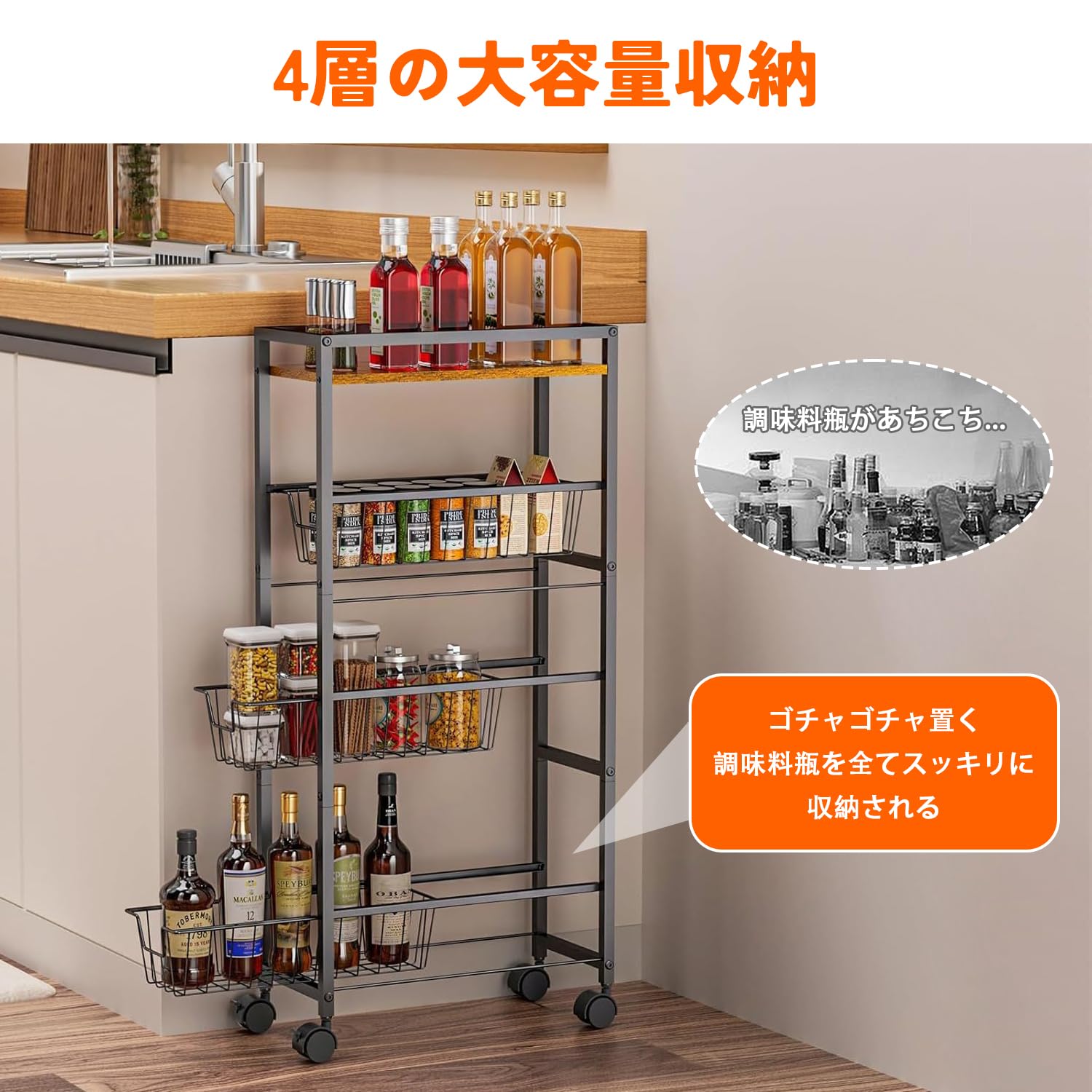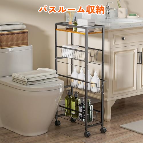 UNITRIP キッチンワゴン 4段 キッチンラックワゴン キッチンラック 収納ワゴン キッチン収納 食器棚 サイドワゴン 収納棚 水切りトレー付き キャスター付き 収納カート 木製トップ付き 滑り止めの足付き 調味料 収納 狭いスペース用 隙間収納 多目的 リビングルーム 寝室 台所 ダイニングルーム 組み立て簡単 小物 キッチンカウンター 幅40×奥行30×高さ73cm 耐荷重50kg