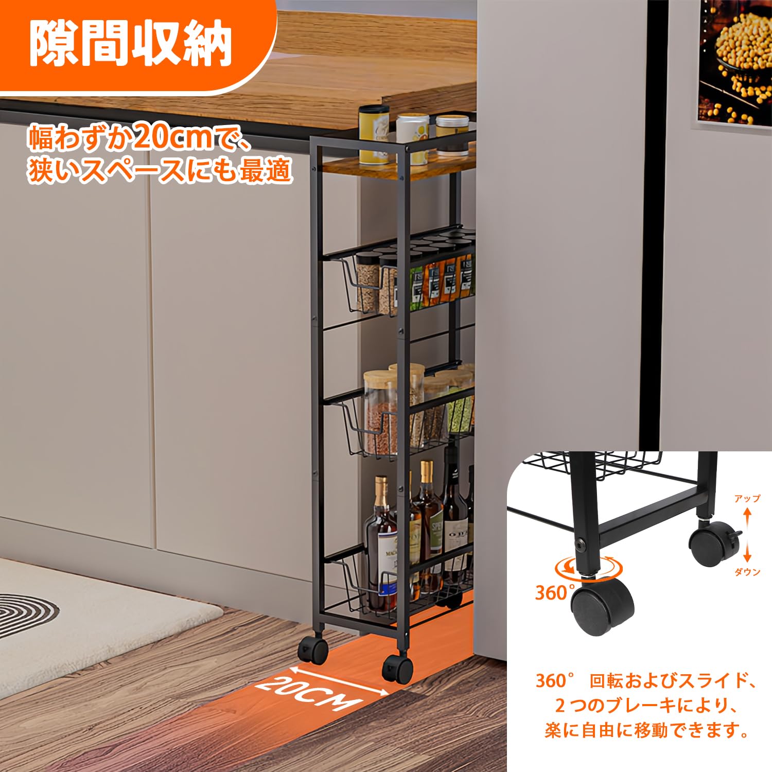キッチンワゴン 収納カート 隙間収納 360度キャスター付き 移動式 引き出し付き 収納ワゴン バスケットラック 取り付け不要 スリム 多段収納 すき間ワゴン キッチン・バスルーム・リビング対応 省スペース ラック スライド式 (ブラック, 幅13cm-4段)