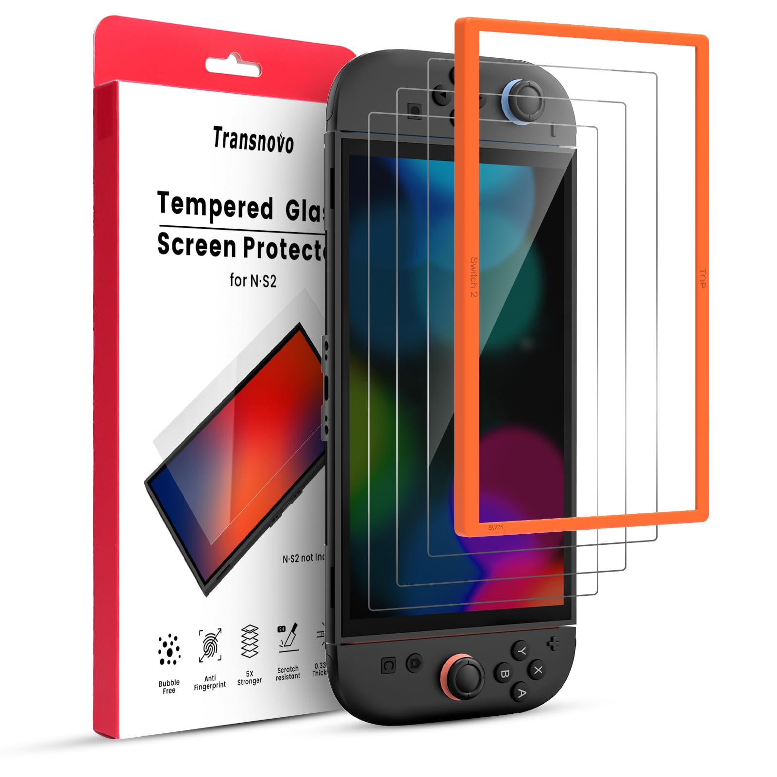 TRANSNOVO【2枚+専用ガイド枠付き】Switch 2 2025対応保護画面ガラスフィルム ニンテンドースイッチ用 強化ガラス 9H硬度 高感度タッチ 迅速な対応貼り付けガイド付き 気泡・キズ防止 高耐久 撥水撥油