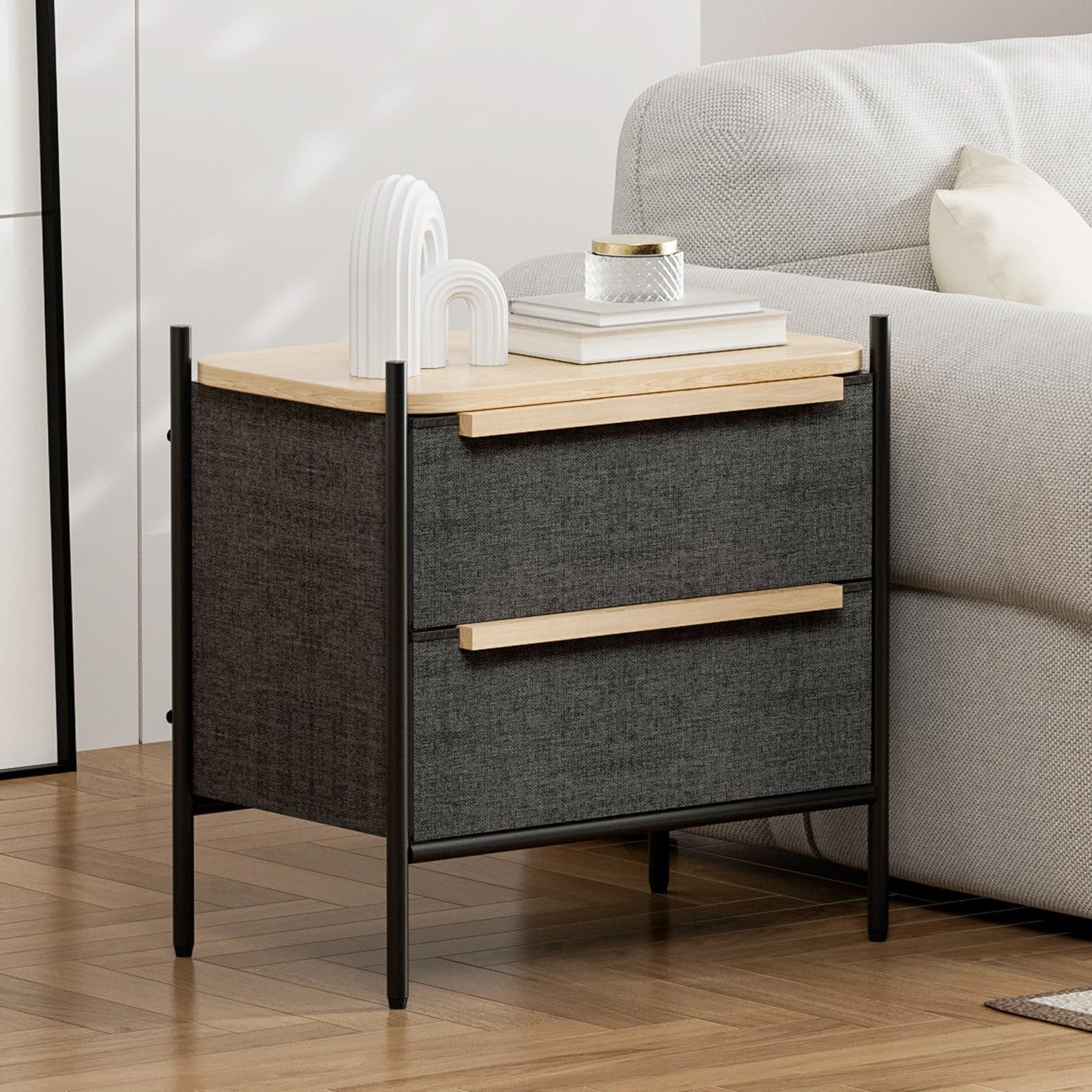 IKIFLY サイドテーブル 引き出し付き ナイトテーブル 低め ベッドサイドテーブル 2段チェスト タンス 収納 布製 ソファー サイドテーブル ベッド横 リビング 寝室 コンパクト 軽量 一人暮らし おしゃれ 北欧風 幅57.5×長さ35×高さ58.4cm (ダックグレー)