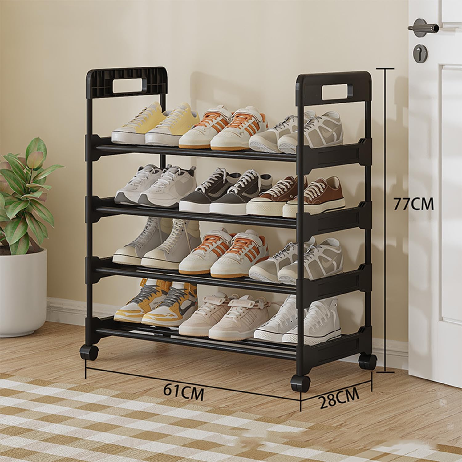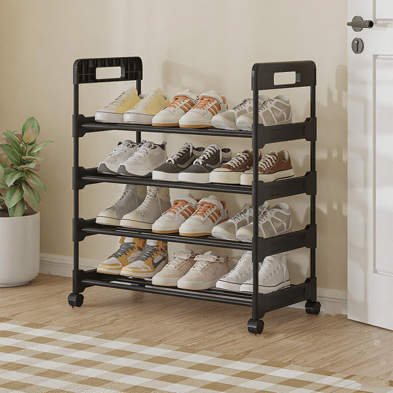 YOUDENOVA シューズラック スリム 靴棚 靴収納 8-12足 靴置き 靴箱 下駄箱 おしゃれ 縦長 省スペース 組み立て式 分割可能 取っ手付き 狭い 玄関 廊下 クローゼット 靴入れ (ブラック, 4段)