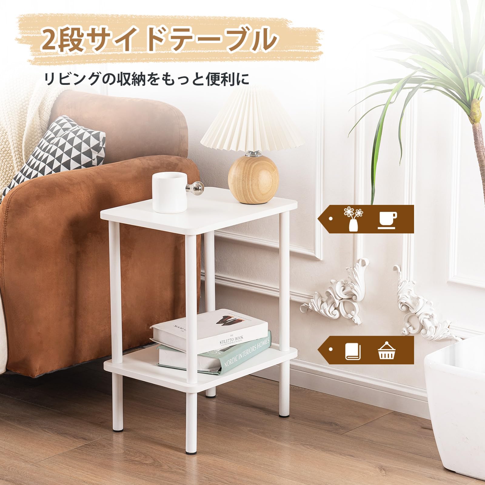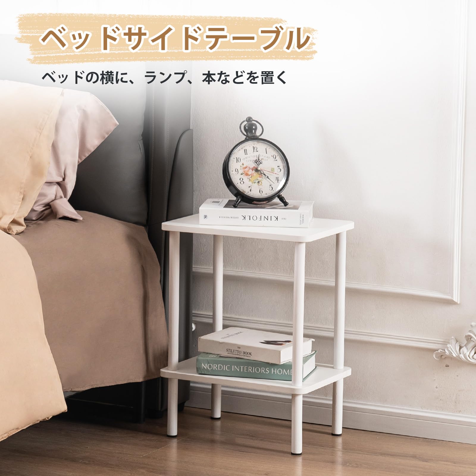 サイドテーブル ナイトテーブル 天然木 小さい おしゃれ 収納棚付き ベット用 リビング ソファサイド 一人暮らし カフェテーブル (40cm*30cm*62cm, ナチュラル+ホワイト)