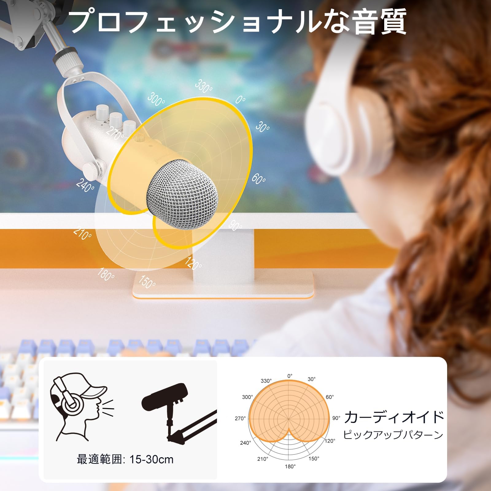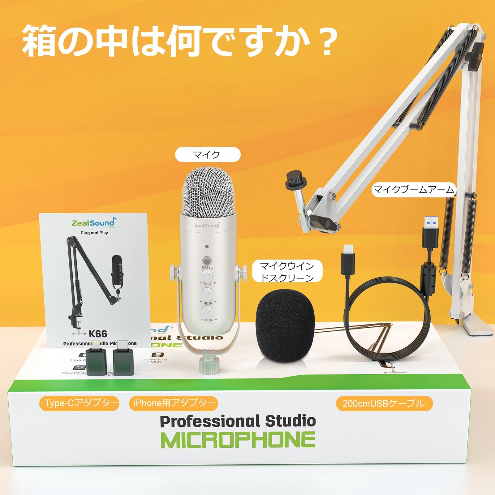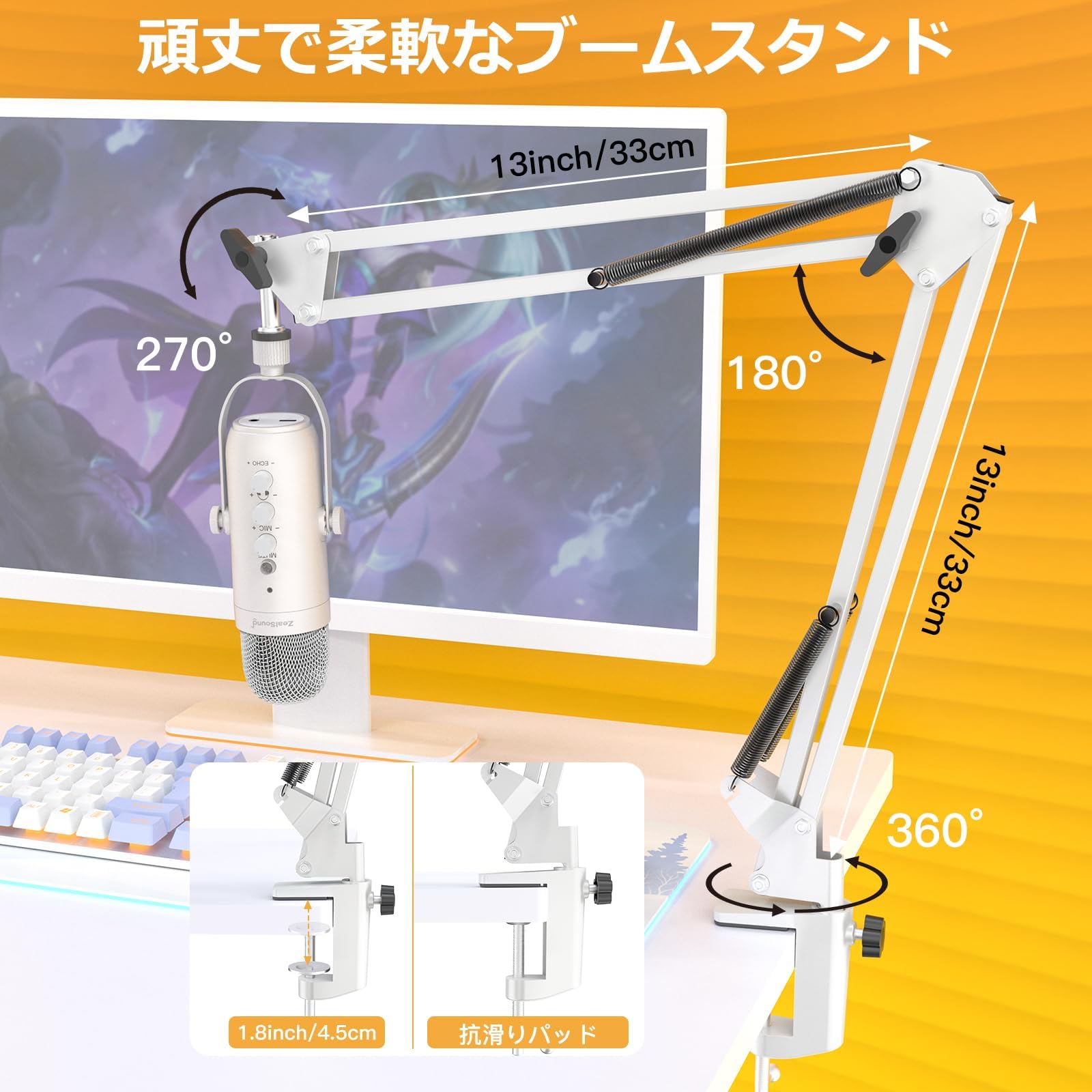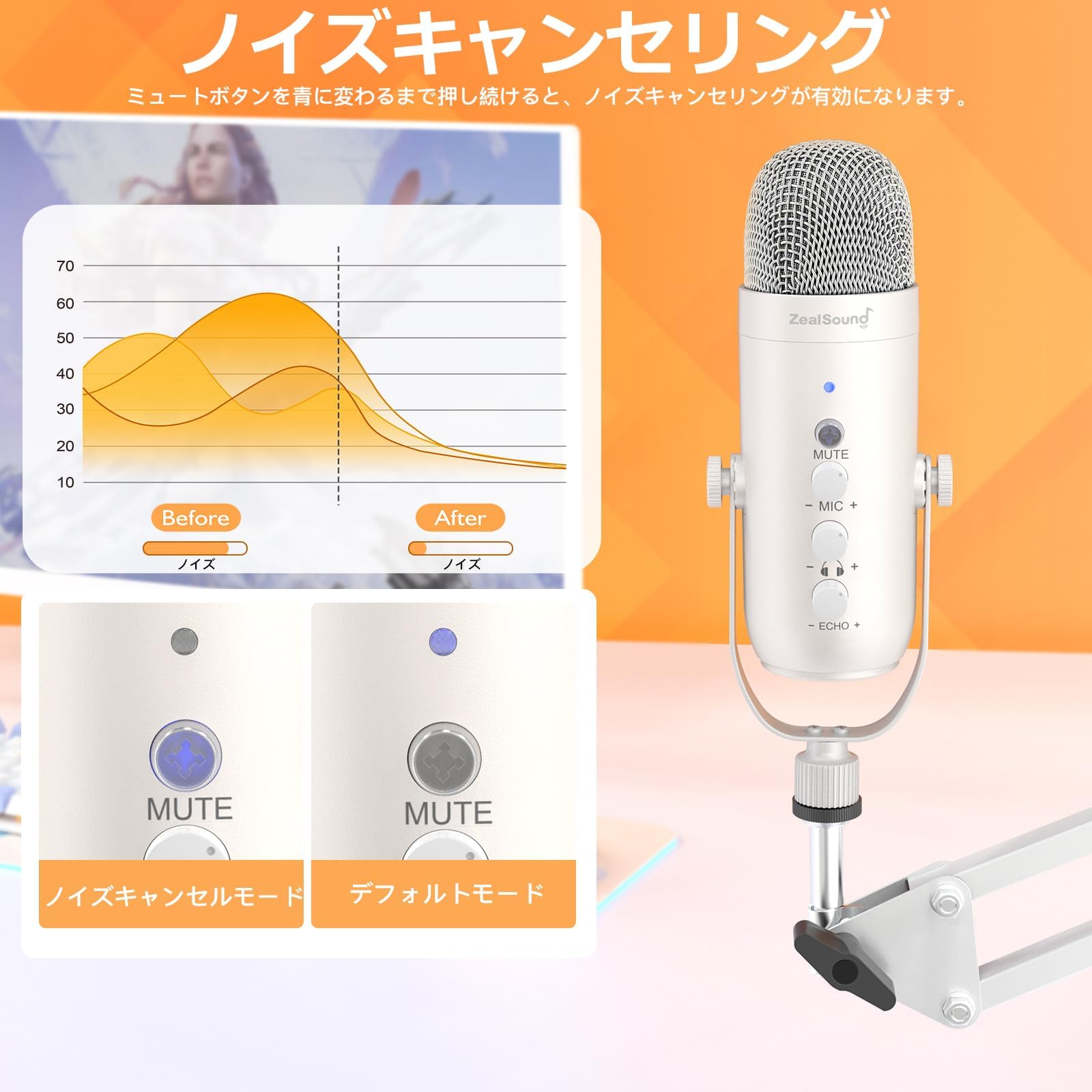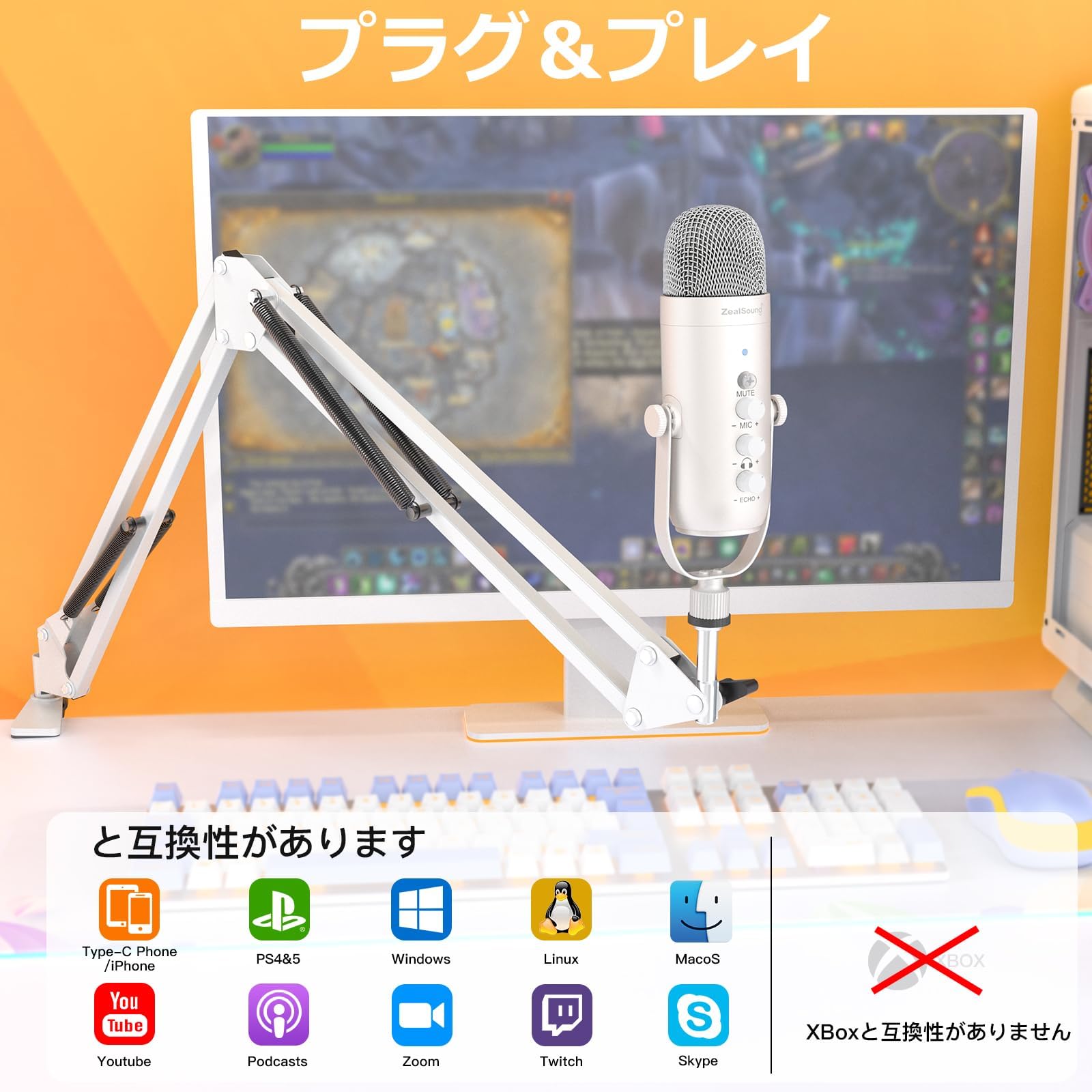 ZeaLSound USBマイクセット、コンデンサーマイク、PCマイク、アームスタンド付属、カーディオイド指向性、プラグアンドプレイ、ワンタッチミュート、エコー機能、ゲームプレイ、ライブ配信、ASMR、オンライン会議に最適、i*Phone/Windows/MacOS/PS4/PS5に完全対応(白)
