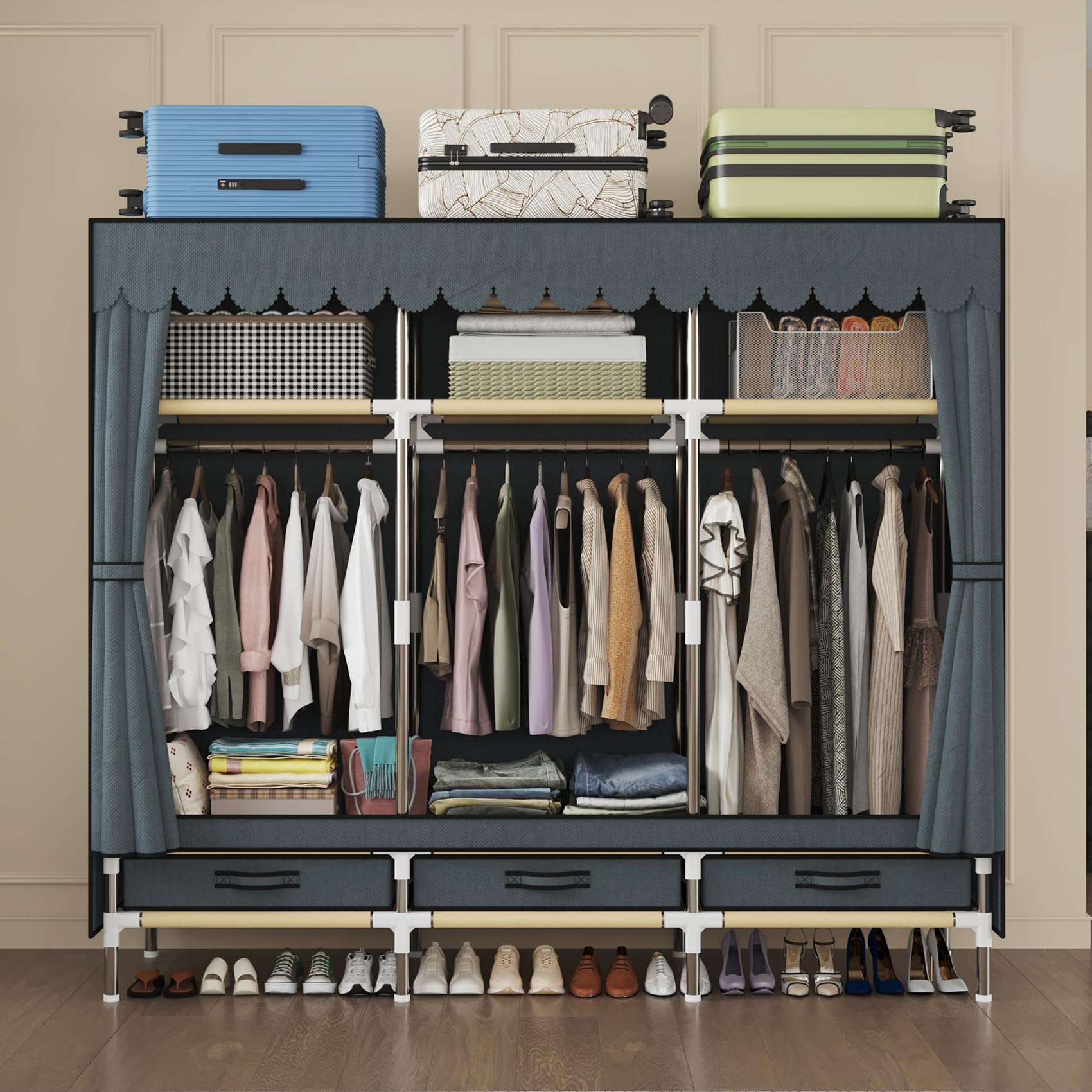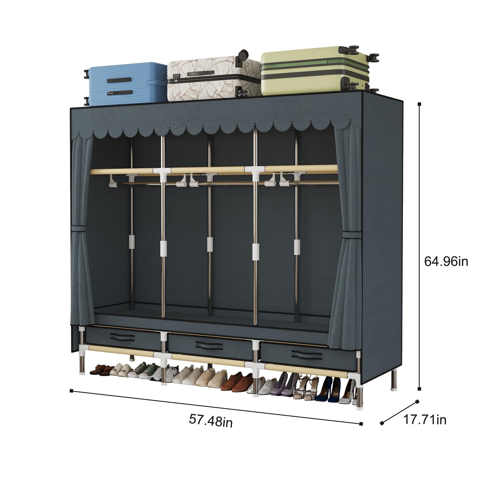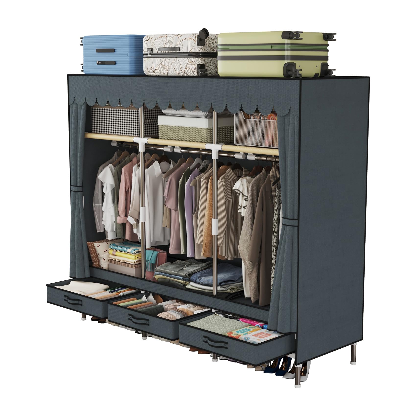 LEAIJIAFY ポータブルワードローブ、自立型クローゼット吊り下げ収納、グレーの布製カバー付き金属フレーム、収納コンパートメント 3 つ、吊り下げロッド 3 本、引き出し 3 つ。
