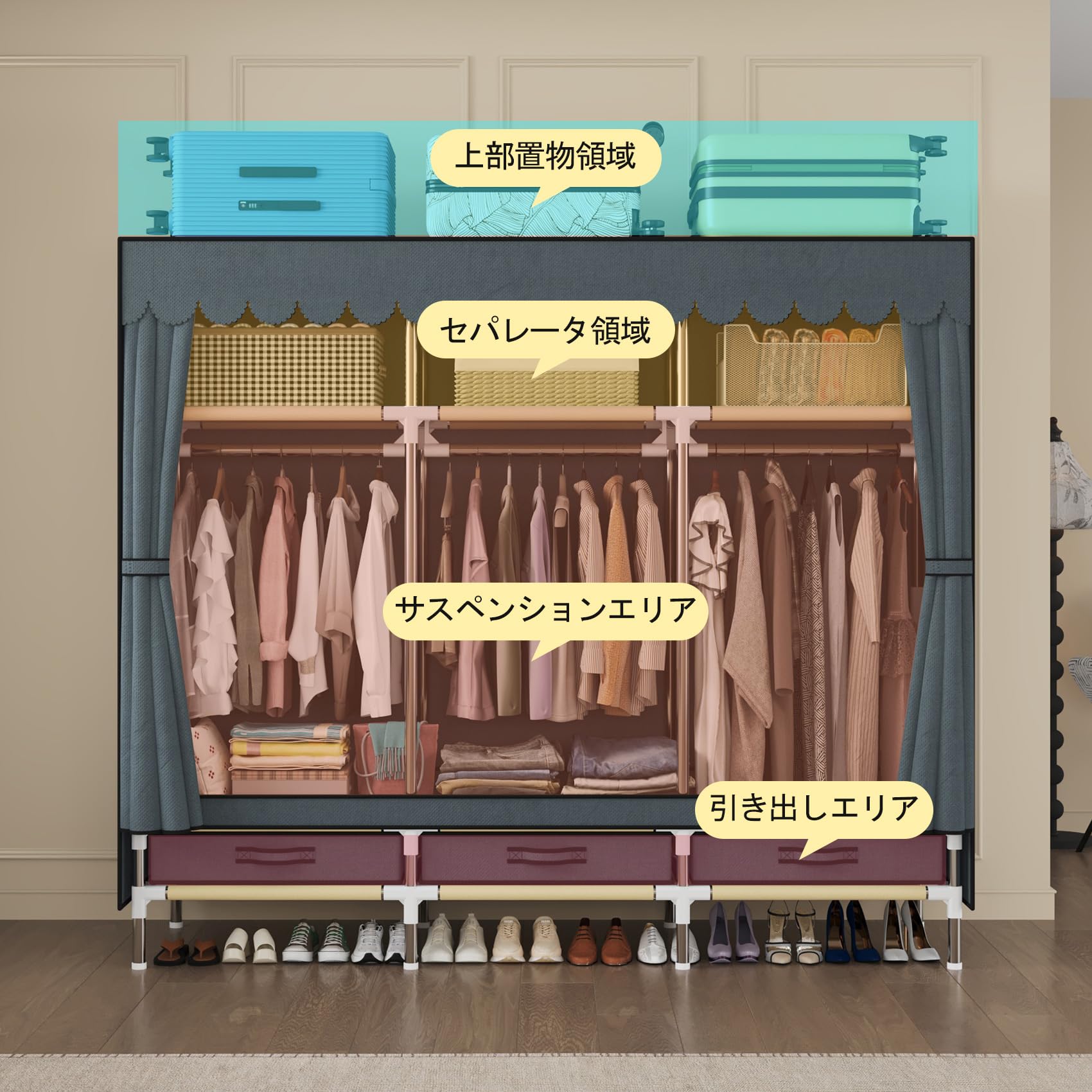 Aikenn ワードローブ 衣類収納ボックス ハンガーラック クローゼット 大容量 防水 防塵 高耐荷重 扉付き衣類ケース 多用途 耐久性 省スペース 組立簡単 工具不要 帽子 靴 小物 リビングルーム 寝室 書斎 玄関 (タイプ1)