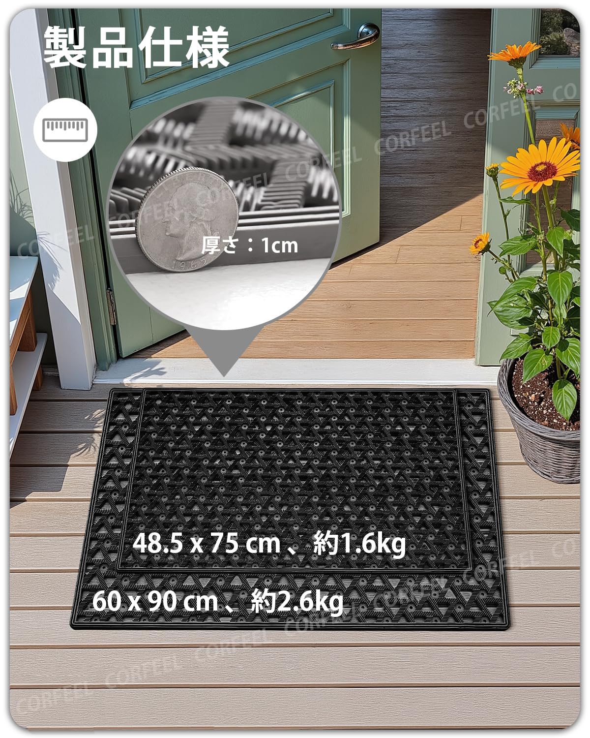 CORFEEL 玄関マット 屋外 泥落とし ドアマット 業務用 家庭用 (48.5x75cm, ブラック)