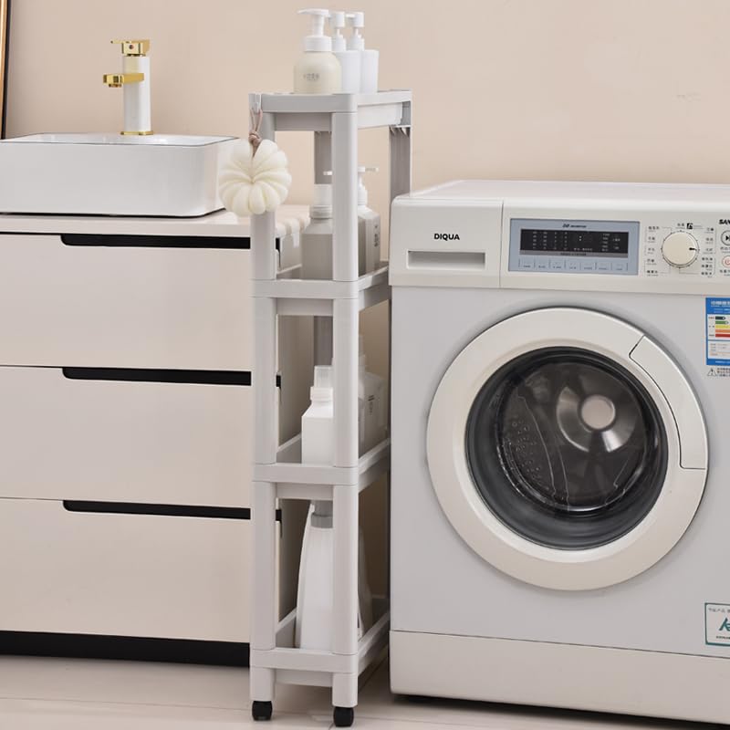 4段スリムストレージカート キャスター付き狭いランドリーカート ユーティリティキッチンローリングカート 木製卓上モバイルシェルフユニット バスルームストレージオーガナイザー スライドアウトローリングタワー 狭いスペース用