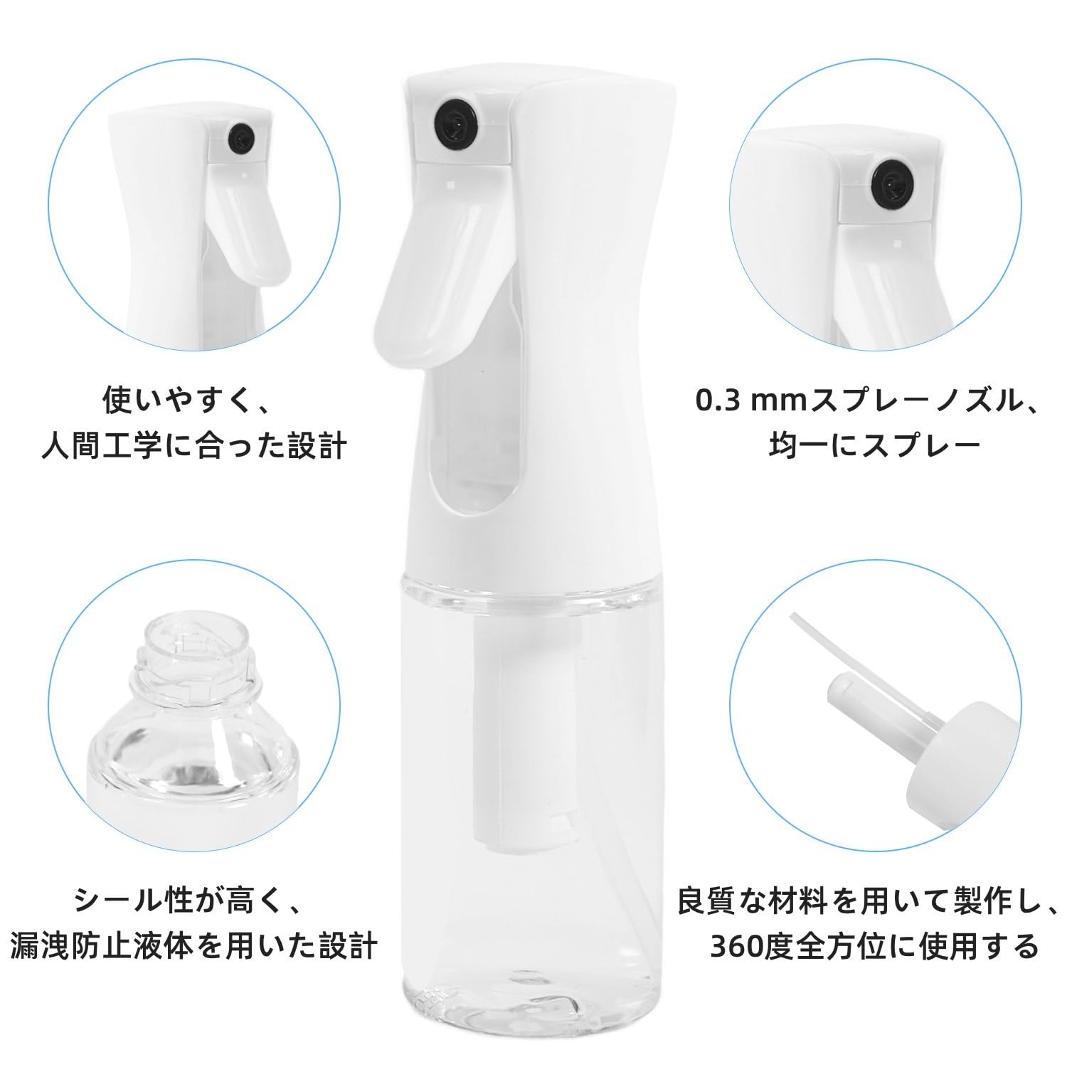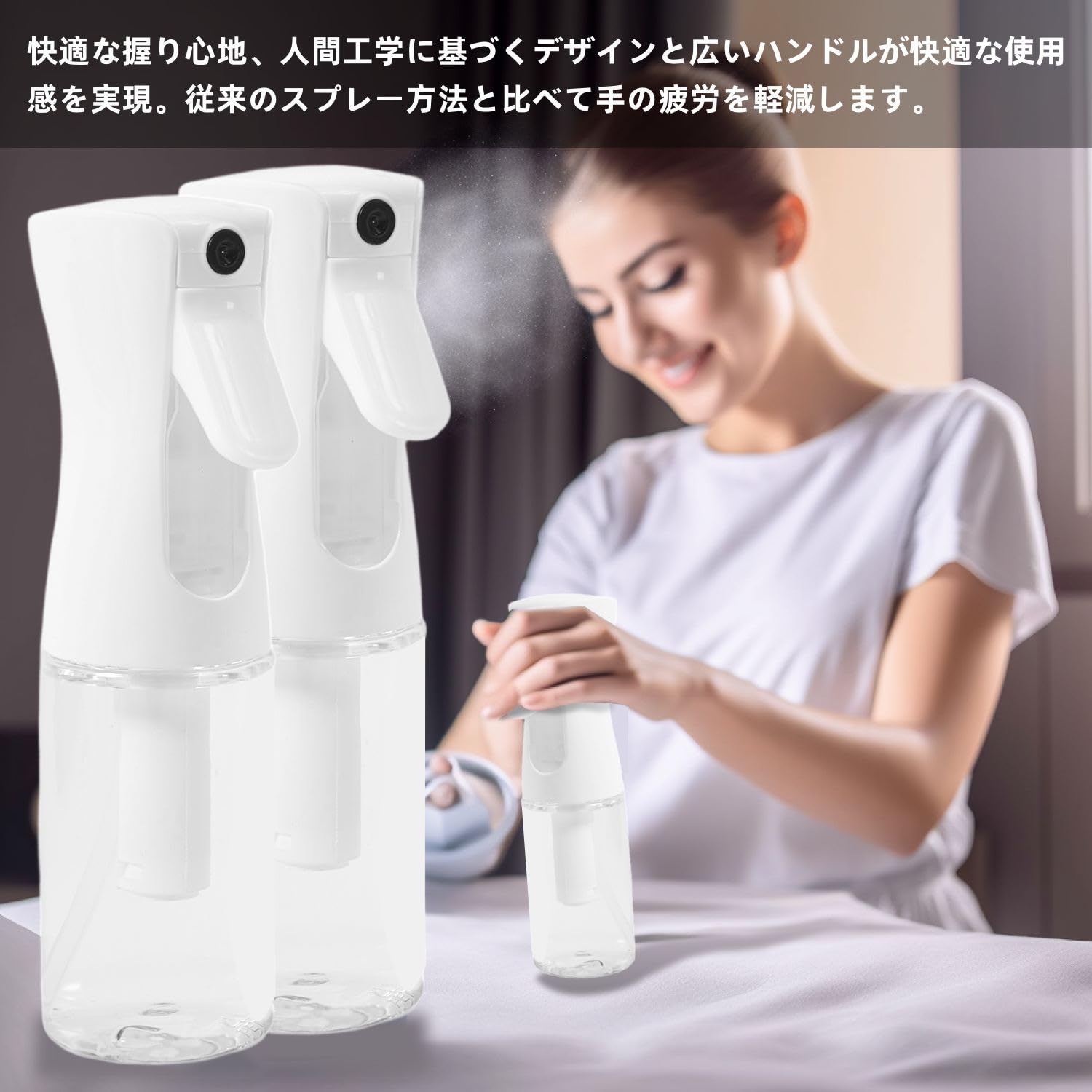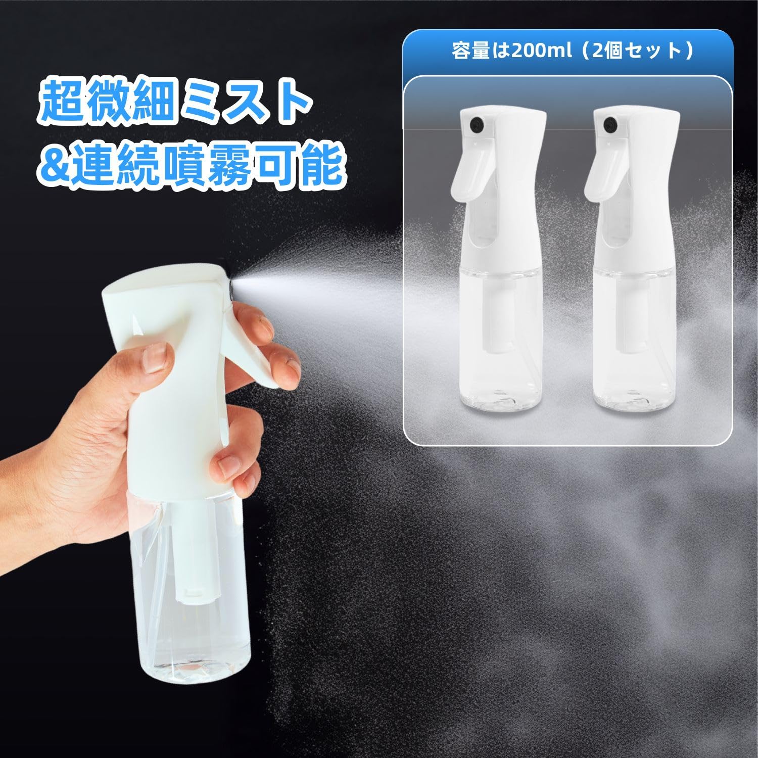2個セット スプレーボトル 連続ミスト 200ml 超微粒子0.3mm 極細ミスト 霧吹き アルコール対応 化粧水詰め替え用 PET素材 家庭・美容院・園芸・車掃除向け 漏れ防止
