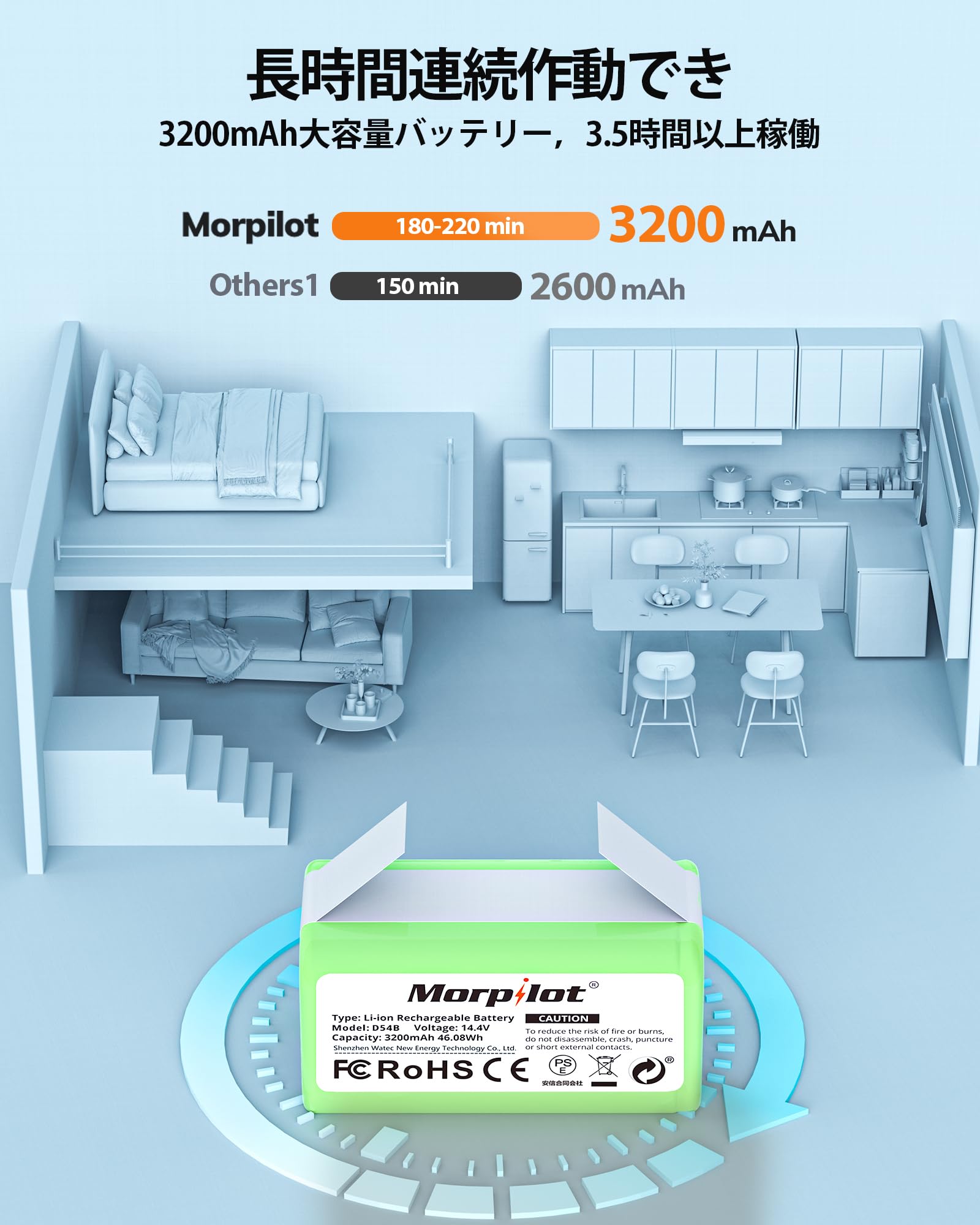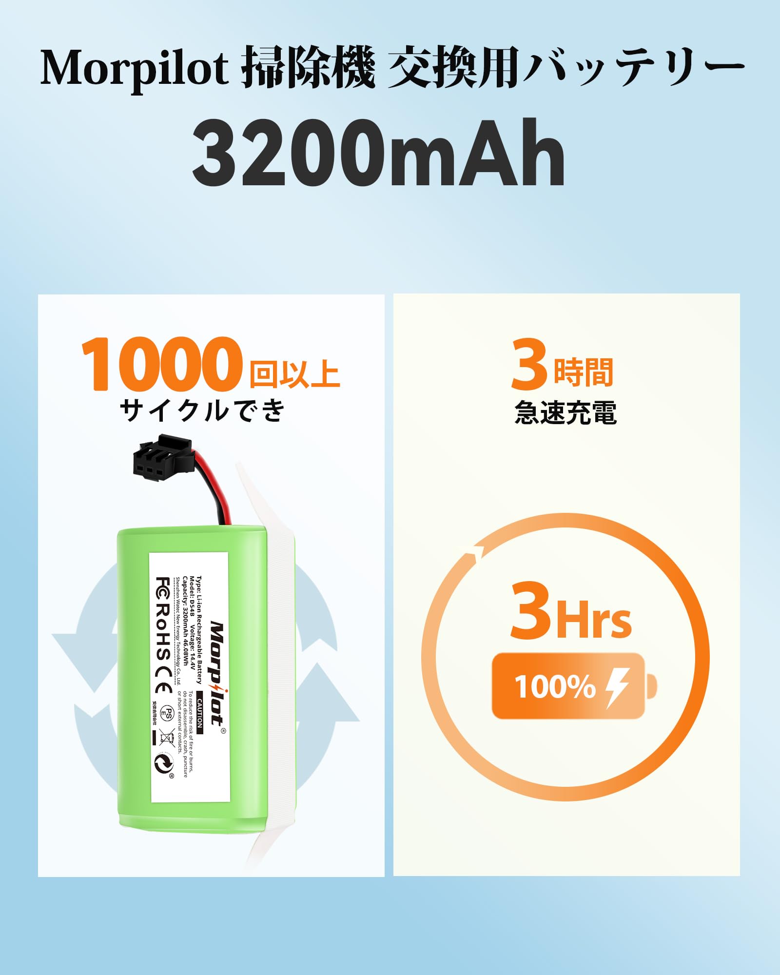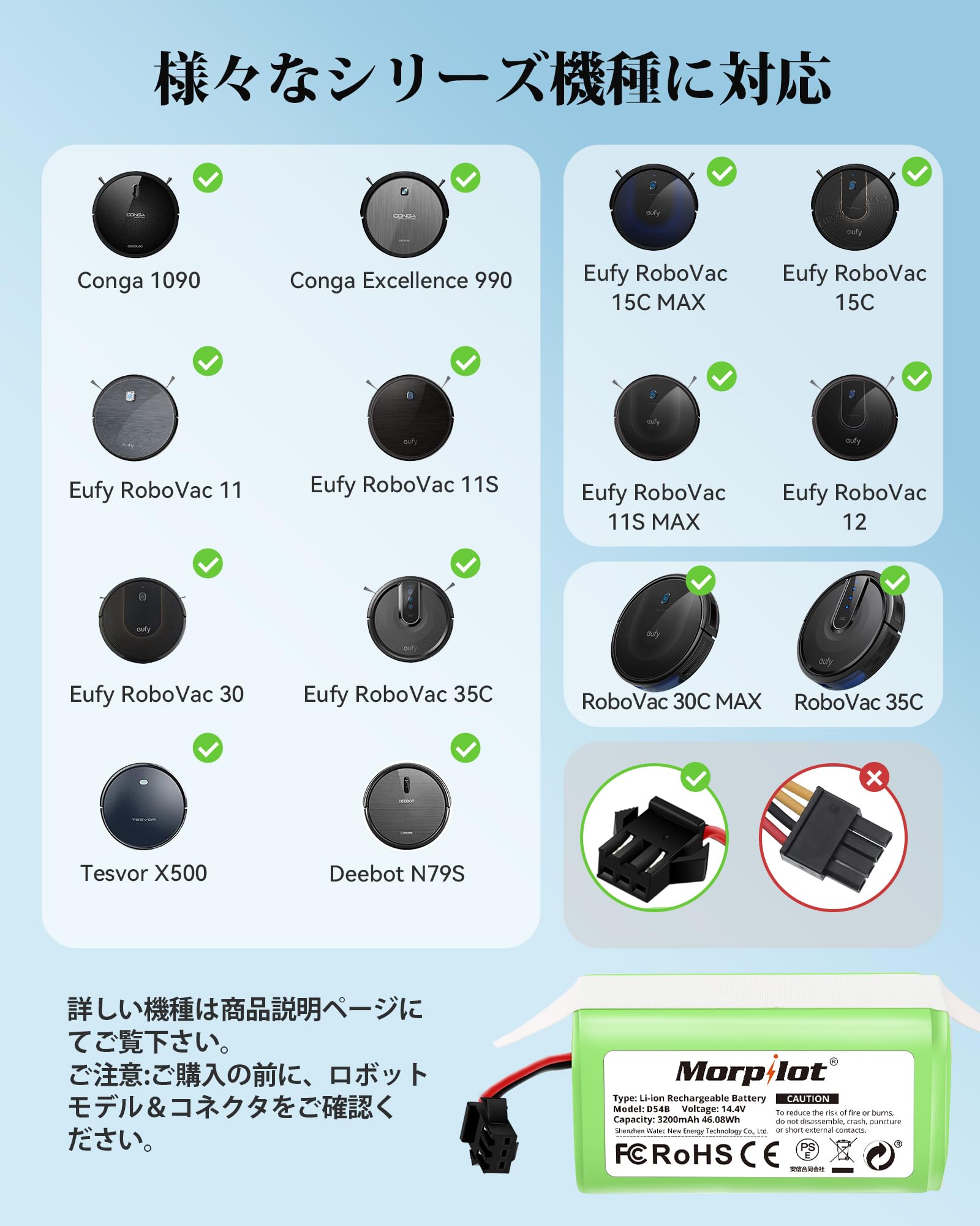 Morpilot RoboVac 11s 交換用バッテリー eufy用 ロボット掃除機交換用バッテリー 14.4v 3200mAh RoboVac 11・11s・15C・30C・G10・G20・G30・G40シリーズ・Ecovacs Deebot用 N79・DN621・DN622 など対応 ユーフィー用 BMS保護回路付き 3時間以上連続稼働 1年間メーカー保証