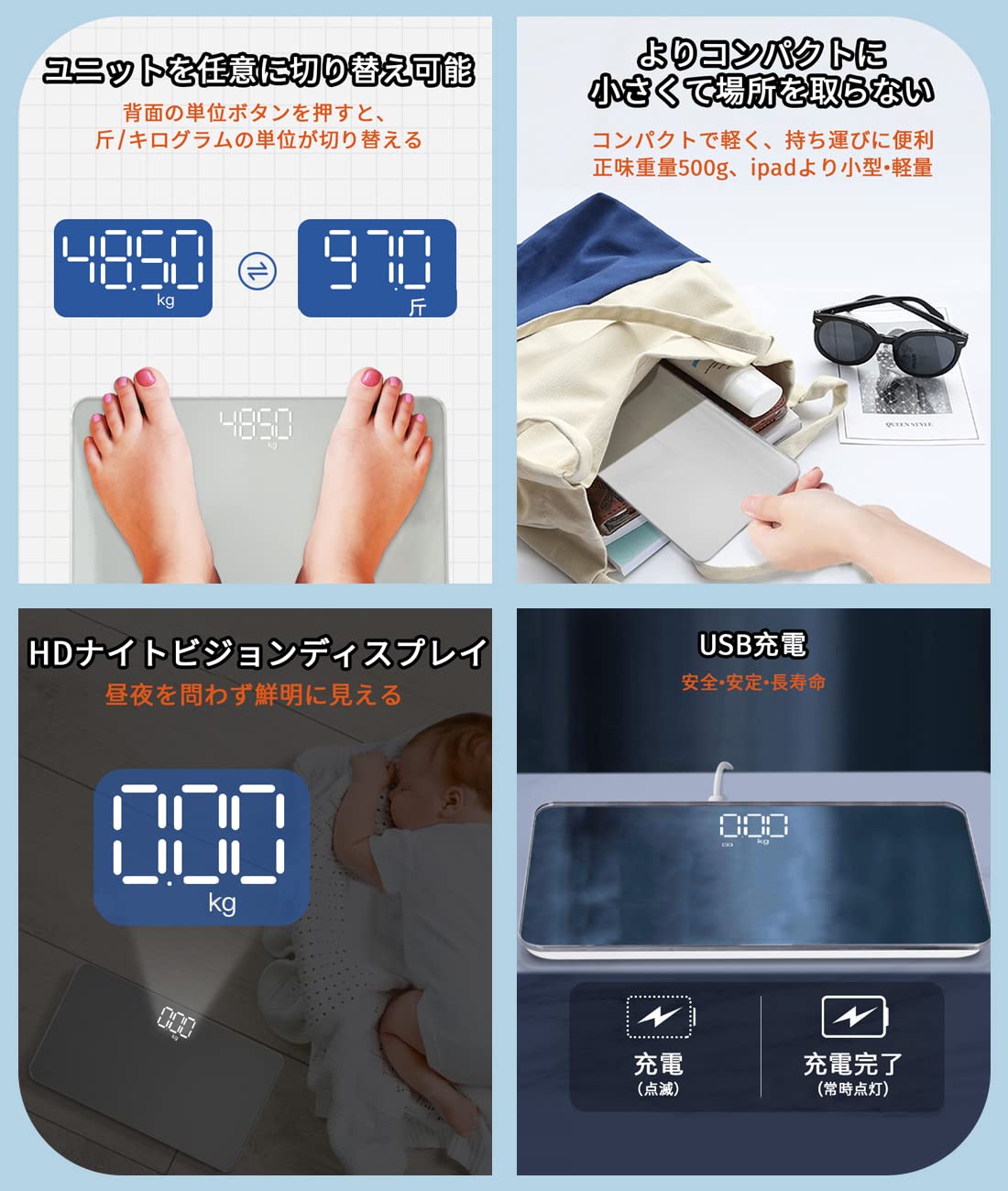 体重計-デジタル-電子スケール-ヘルスメーター-乗るだけ-自動電源ON/OFF-バックライト付-180kgまで対応-高精度ボディースケール-コンパクト