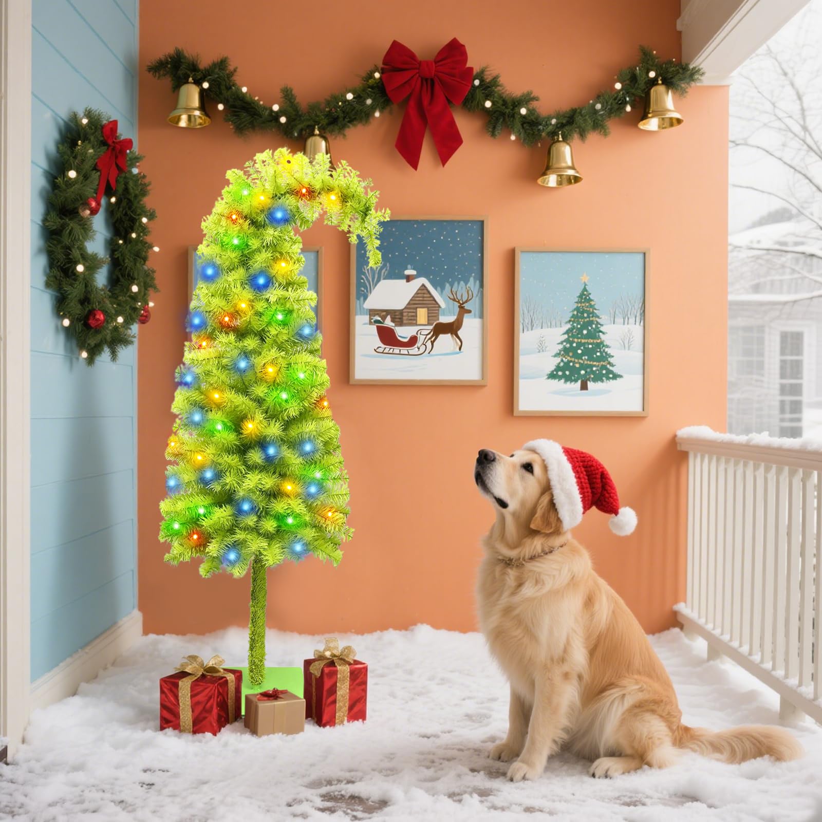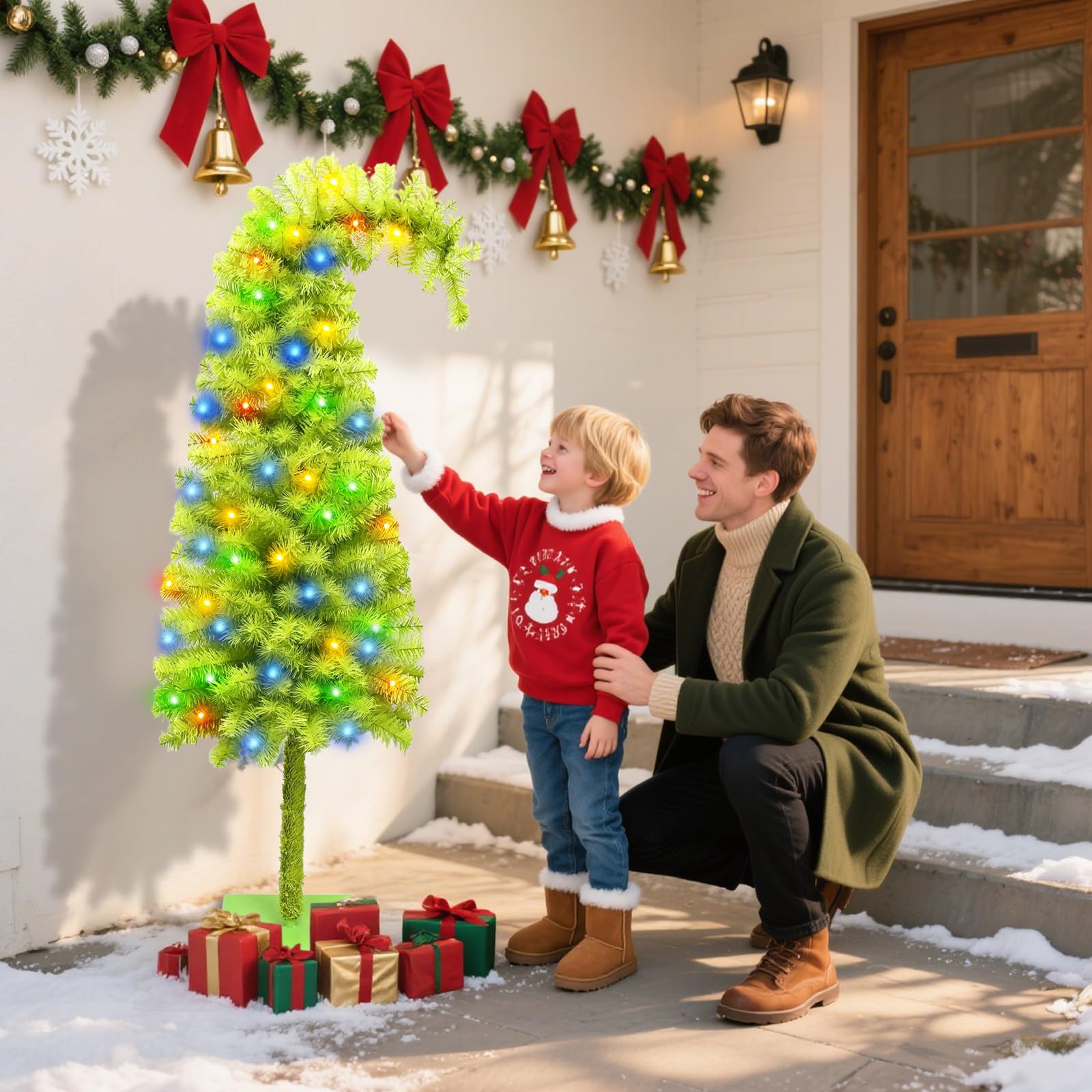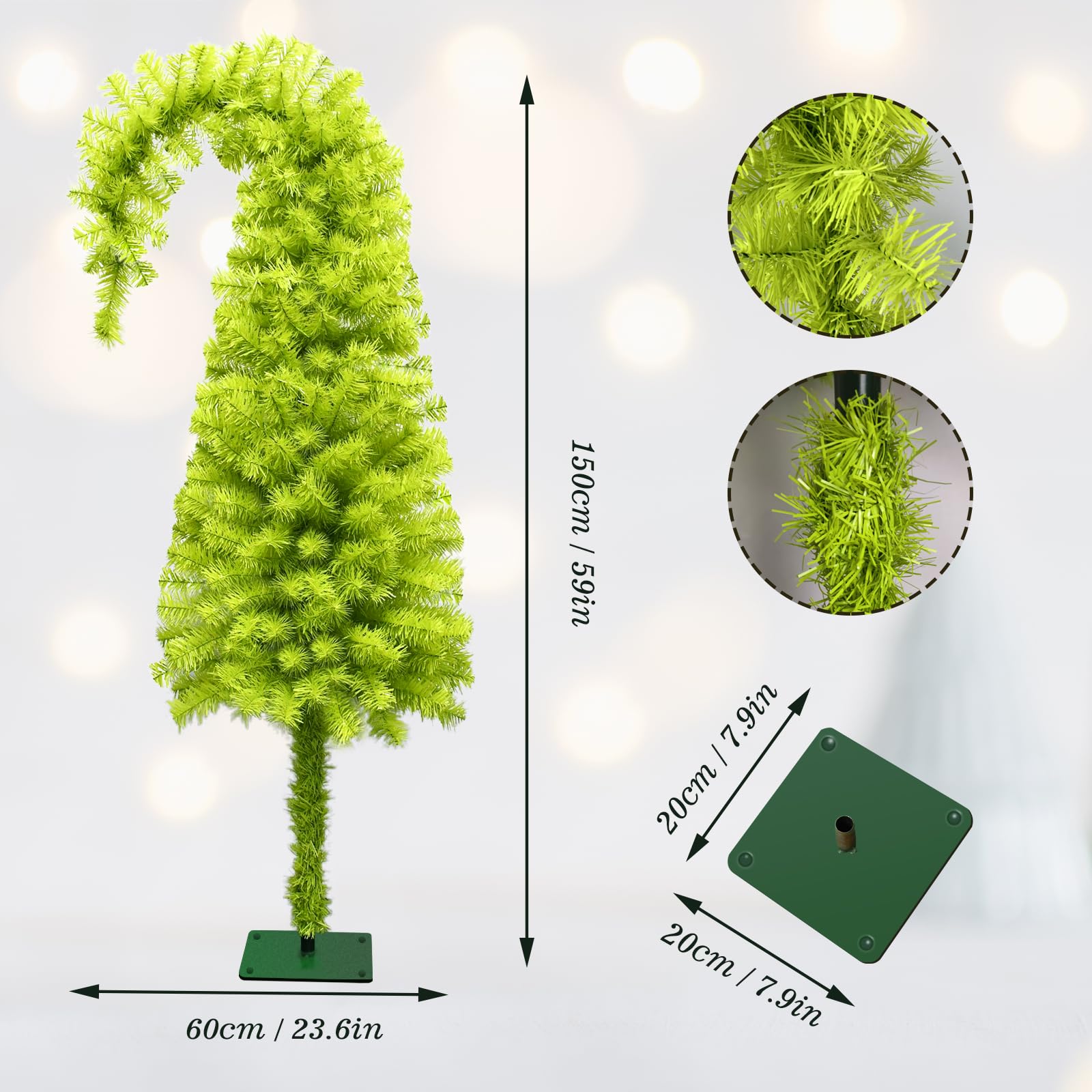 1.5メートルの傾きクリスマスツリー 曲線デザインの風人工 5メートルのカラーLEDライトストリングと赤いボール装飾付き、2種類の照明モード、人工松の木に円形のラメ装飾、クリスマス装飾品 (グリーン)