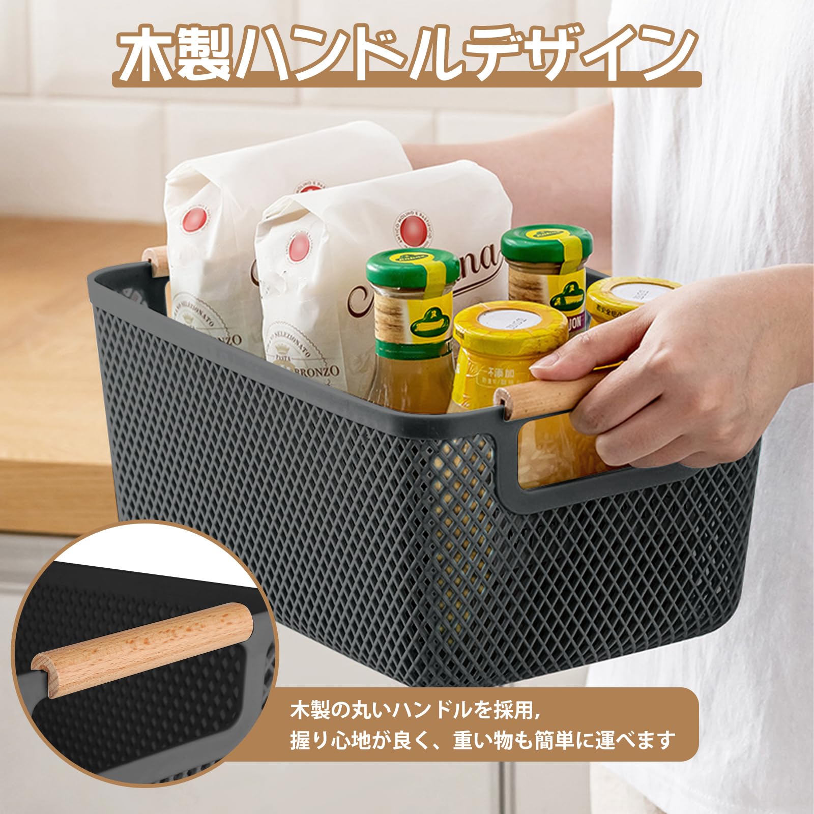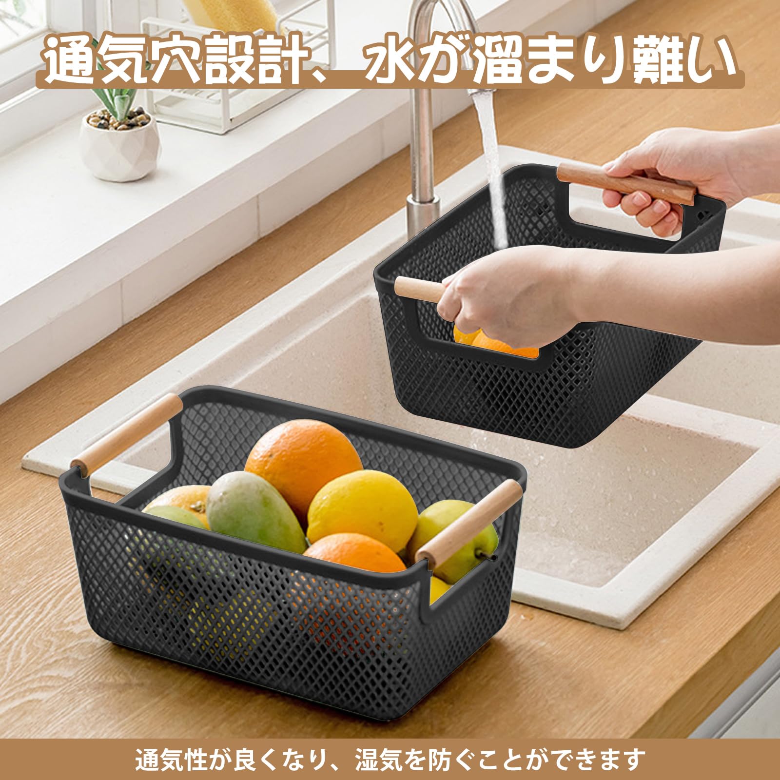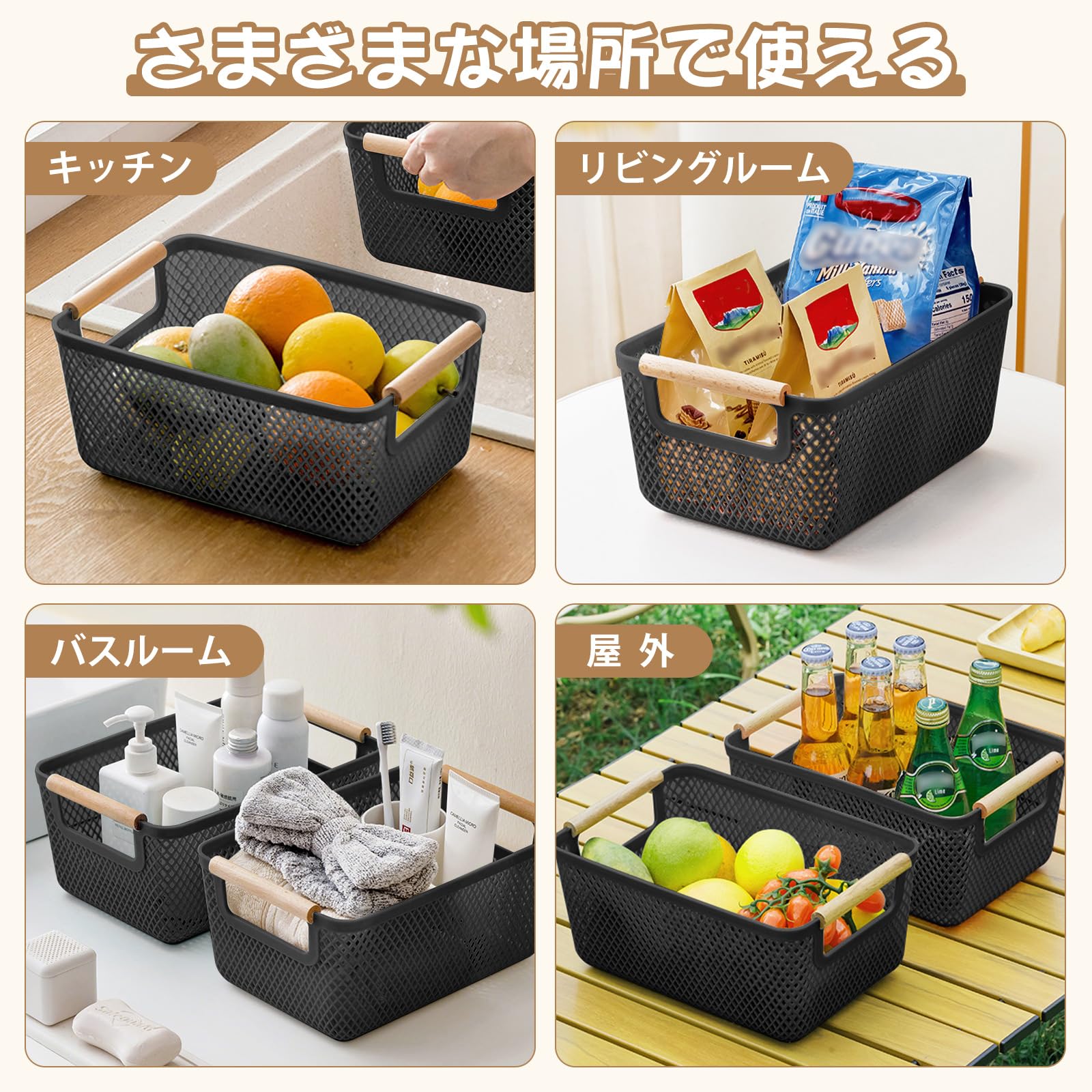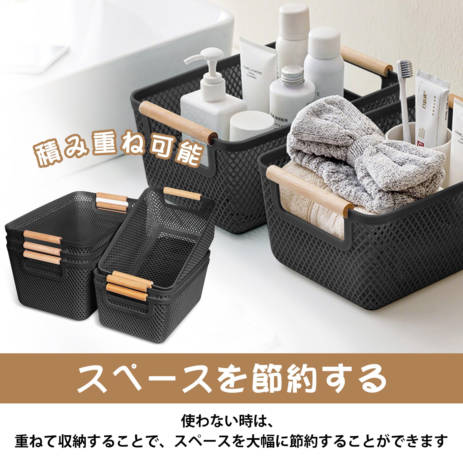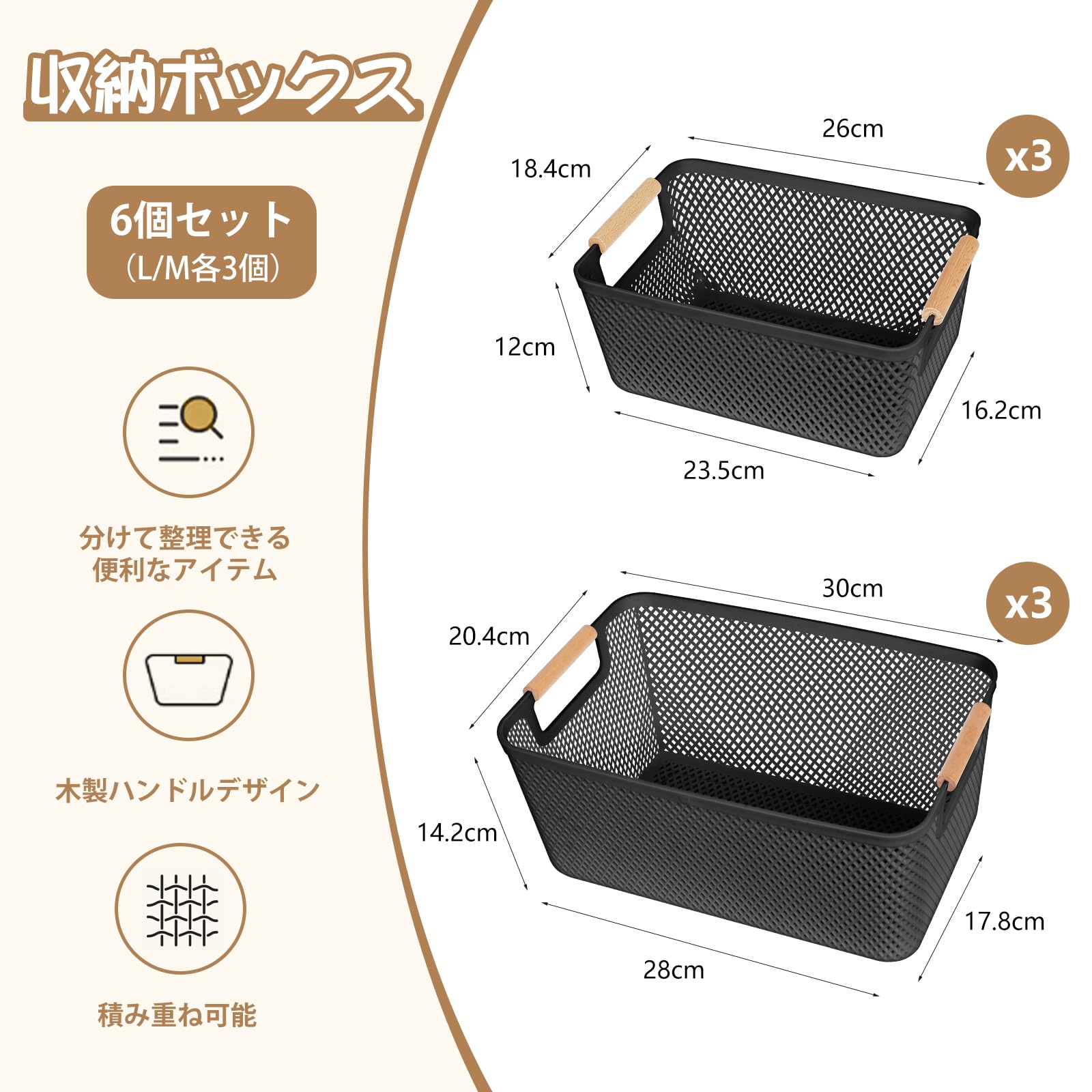 LAMPTOP 収納カゴ 6個セット 多用途収納ボックス 木製円形ハンドル収納バスケット キッチン/バスルーム/クローゼット 小物入れケース 調味料・洗面用品・衣類・食品整理に 頑丈軽量 すっきり収納ボックス Lサイズ&Mサイズ各3個セット ブラック