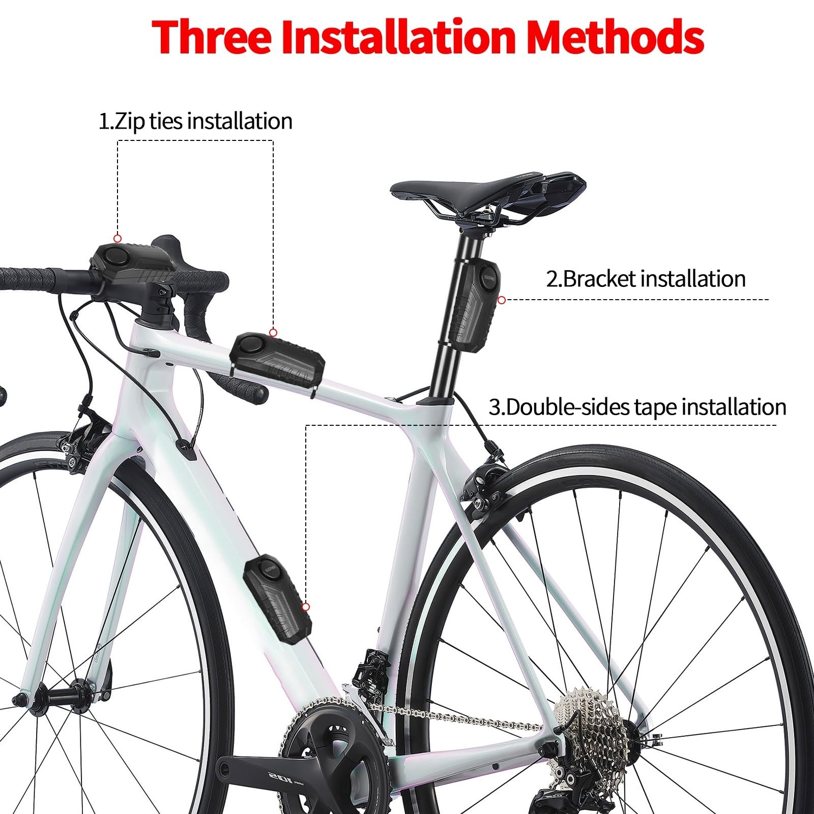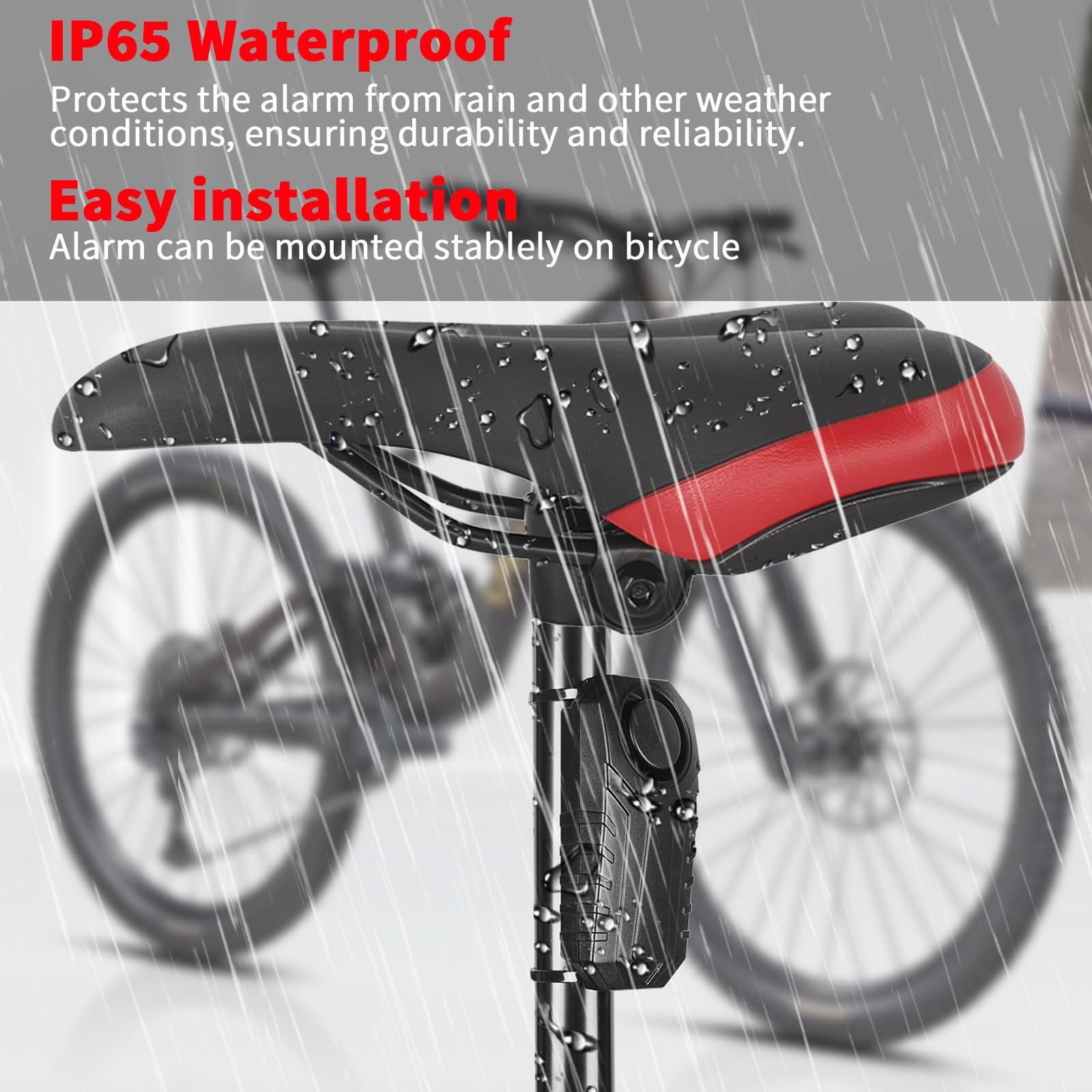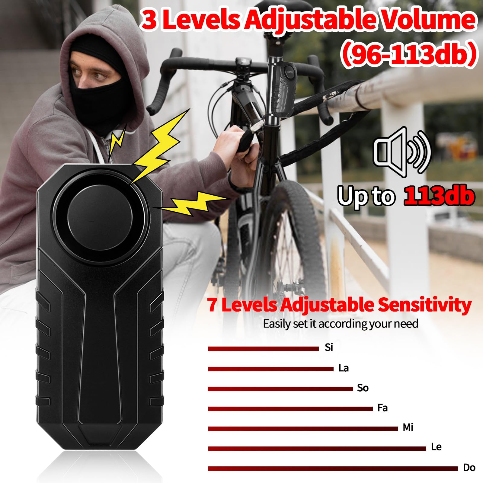 113 dB自転車盗難防止警報器、長距離防水自転車安全トリガ振動センサ、電池駆動のオートバイ部品、電動自転車無線警報器、スクーター、ドア、窓