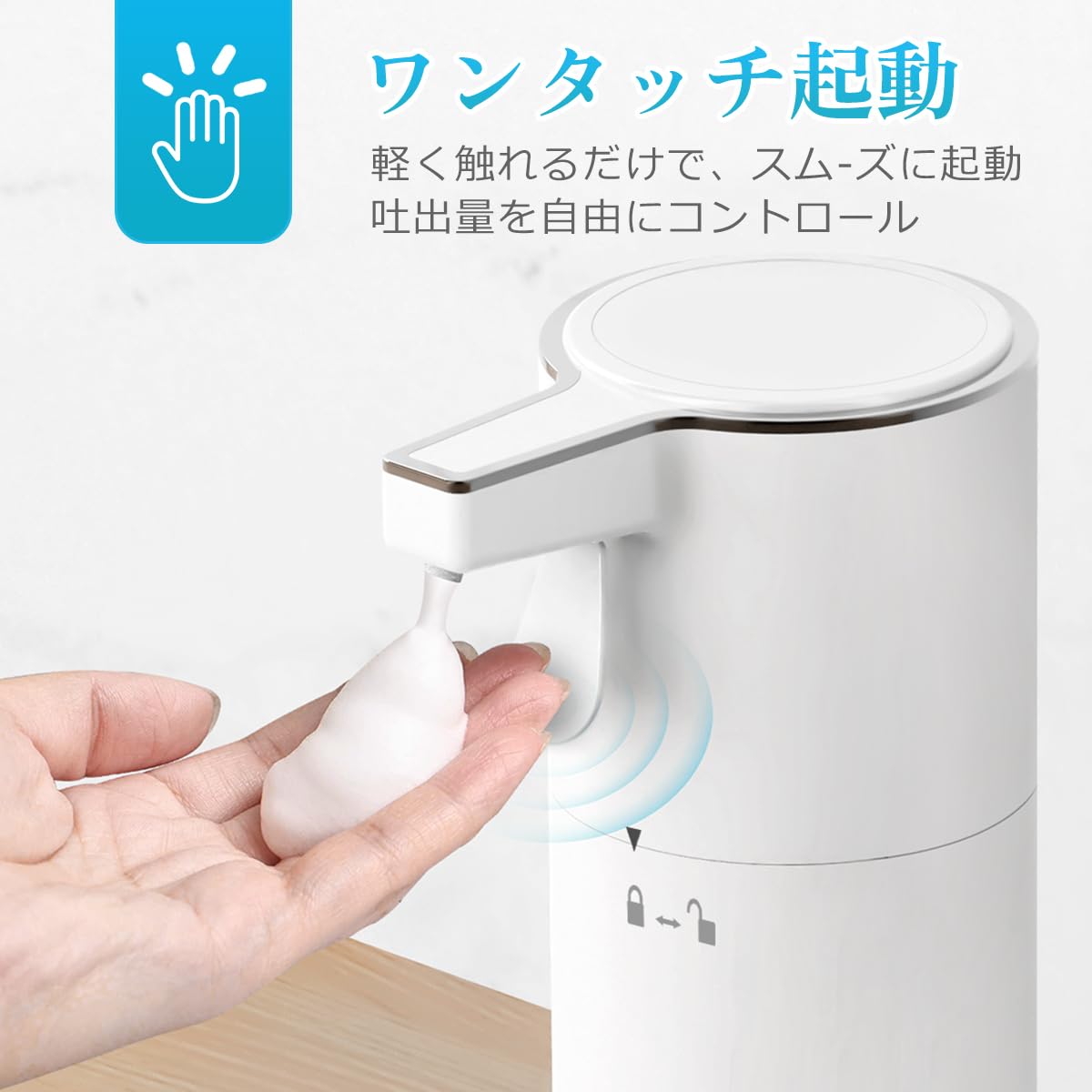 ソープディスペンサー 半自動 タッチ式 泡 電池式 IPX5防水 排出量調整可能 使いやすい オートソープディスペンサー ハンドソープ 自動手洗い ハンドソープ対応 食器洗剤対応 トイレ お手洗い バスルーム キチン ホワイト H5D-white-new