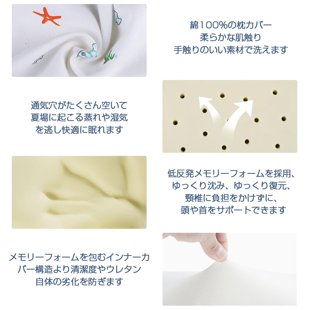 Adokoo 子供枕 子ども用まくら 低め 低反発ピロー 睡眠まくら 頭の形が良くなる キッズ枕 男女兼用 汗とり 綿100% 通気 プレゼント 小魚柄