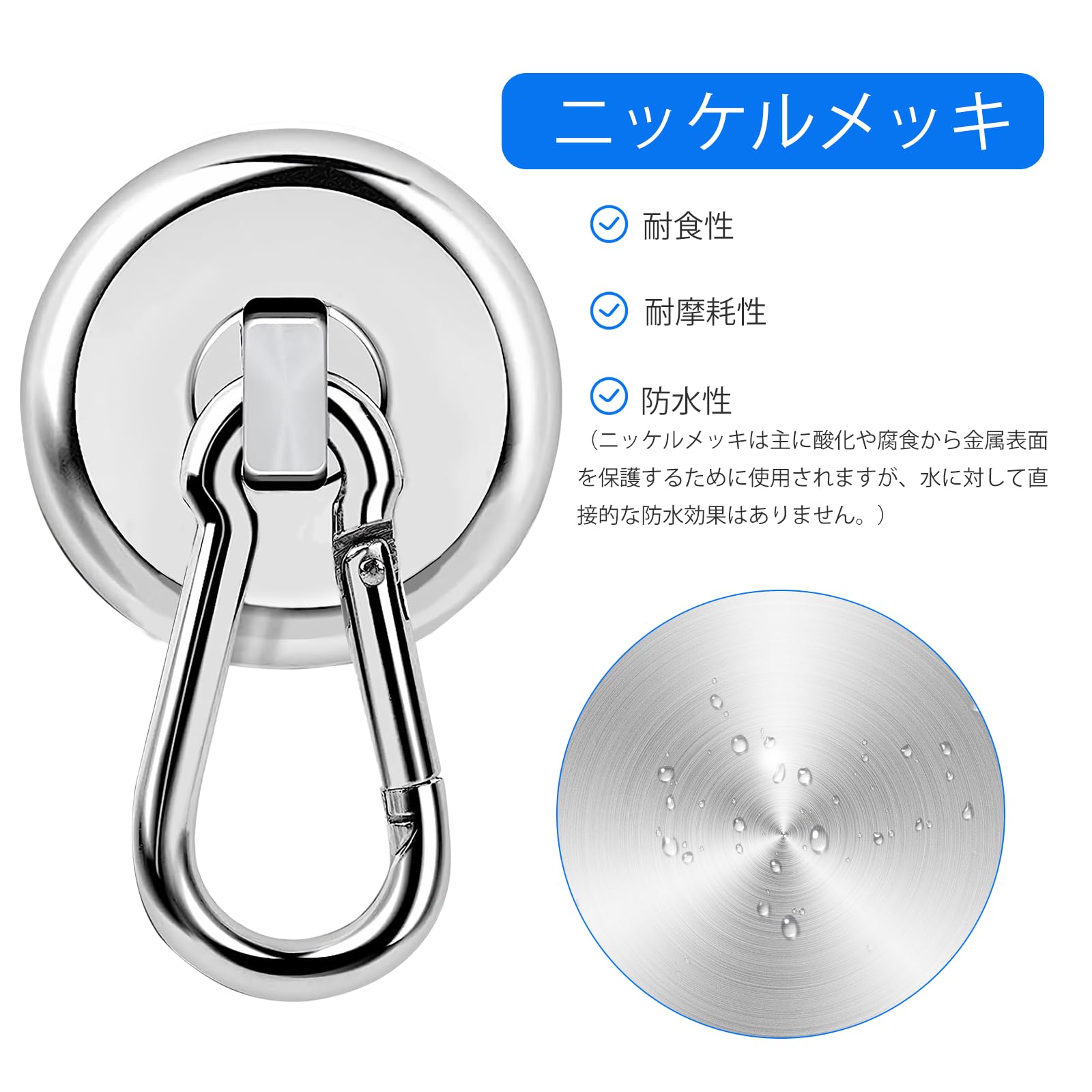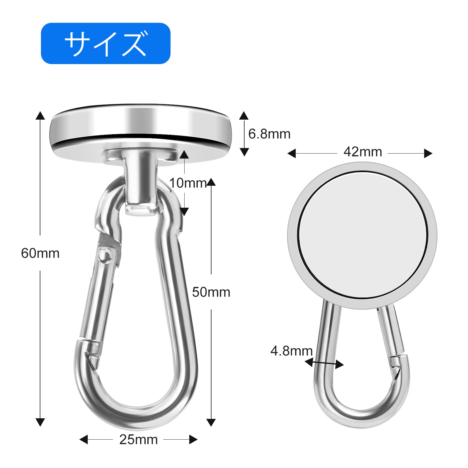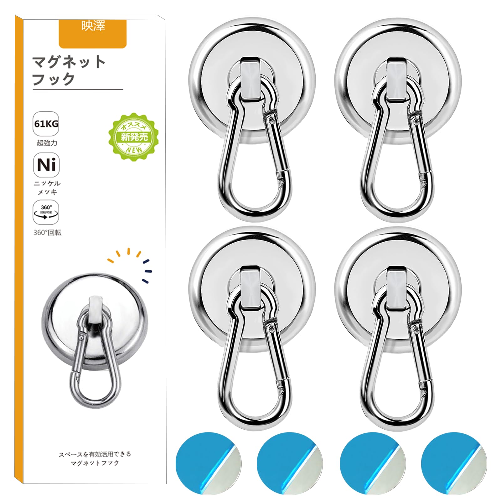映澤 カラビナ フック 超強力 マグネット フック 垂直荷重63kg ニッケルメッキ 疏水性 錆びにくい 360度回転できる 直径42mm 家庭 イベント 販売場所 キッチン キャンプ 4個セット