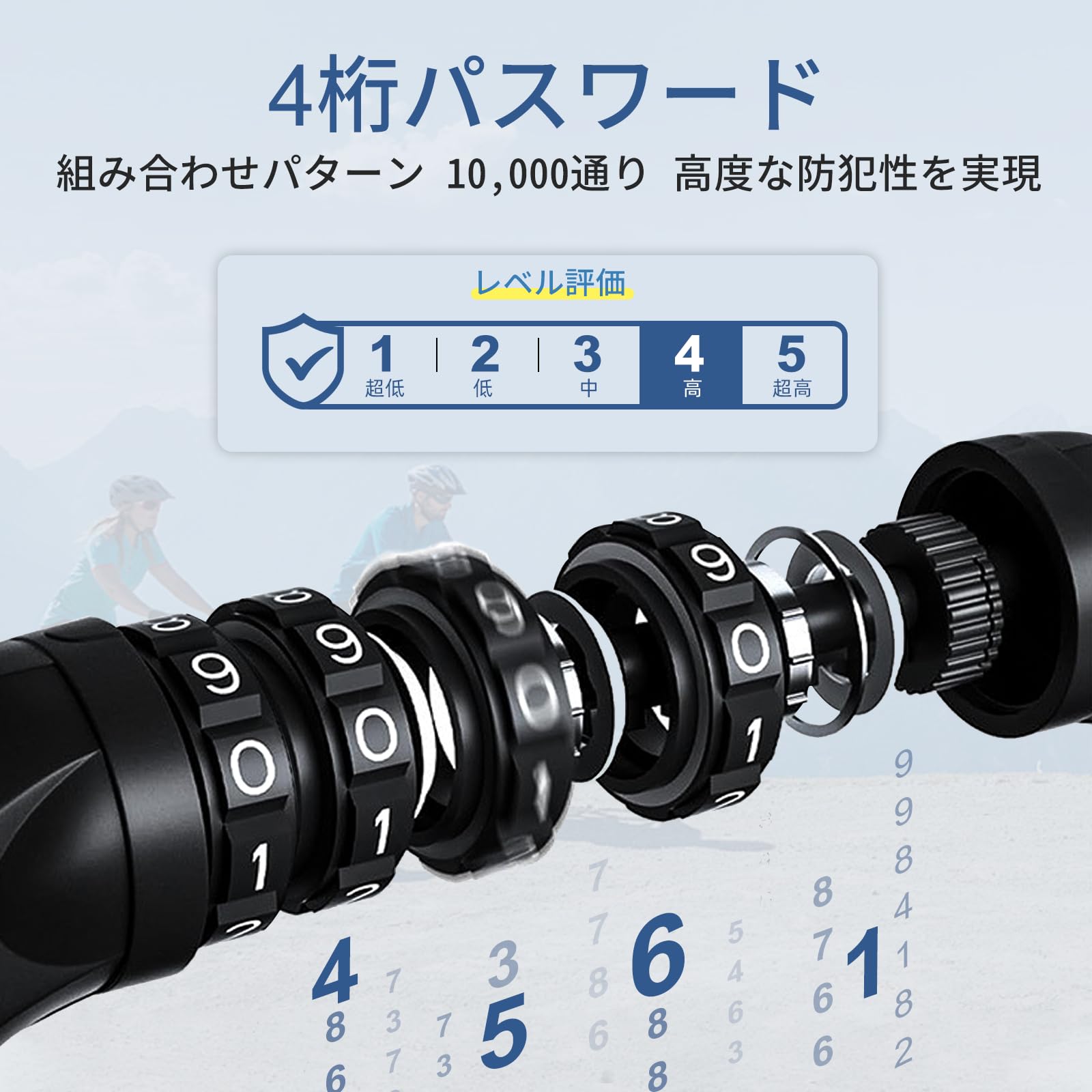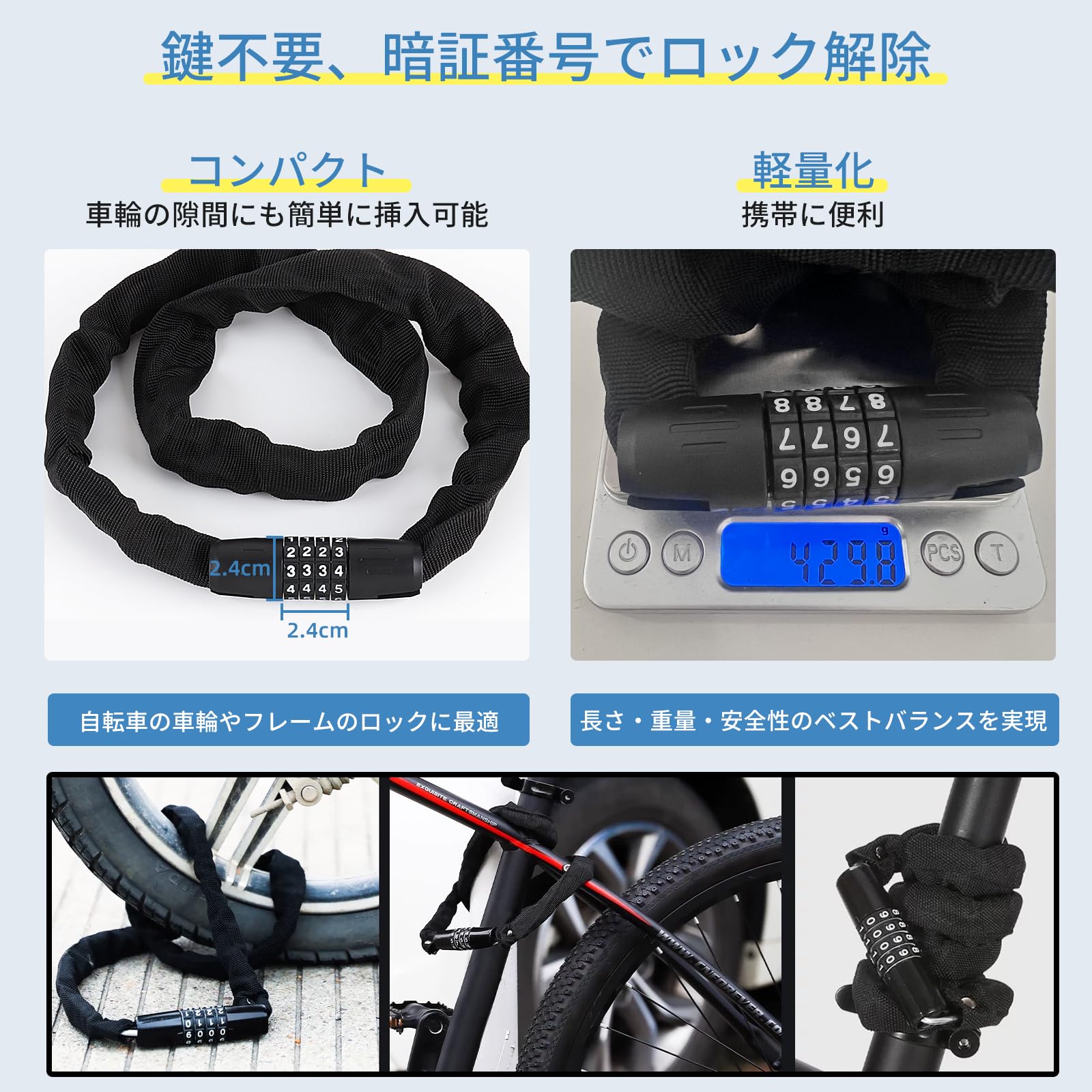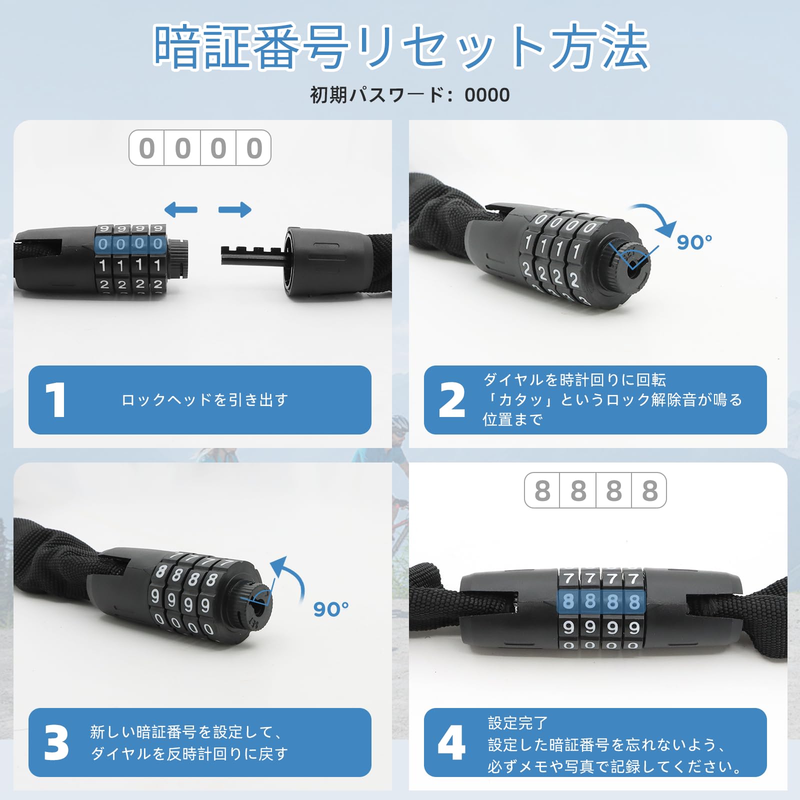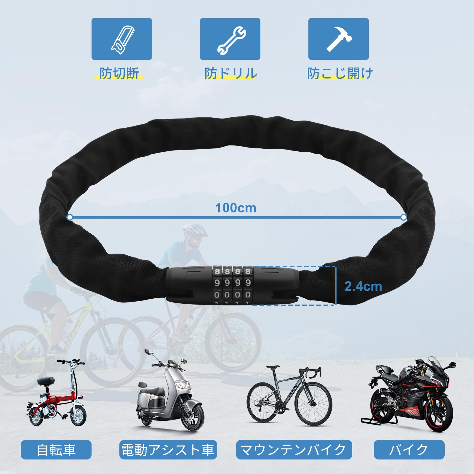 チェーンロック 全長100cm 4桁ダイヤル式 自転車ロック 盗難防止 コンパクトワイヤーロック バイクロック カギ不要 暗証番号変更可能 コンパクト 軽量 頑丈