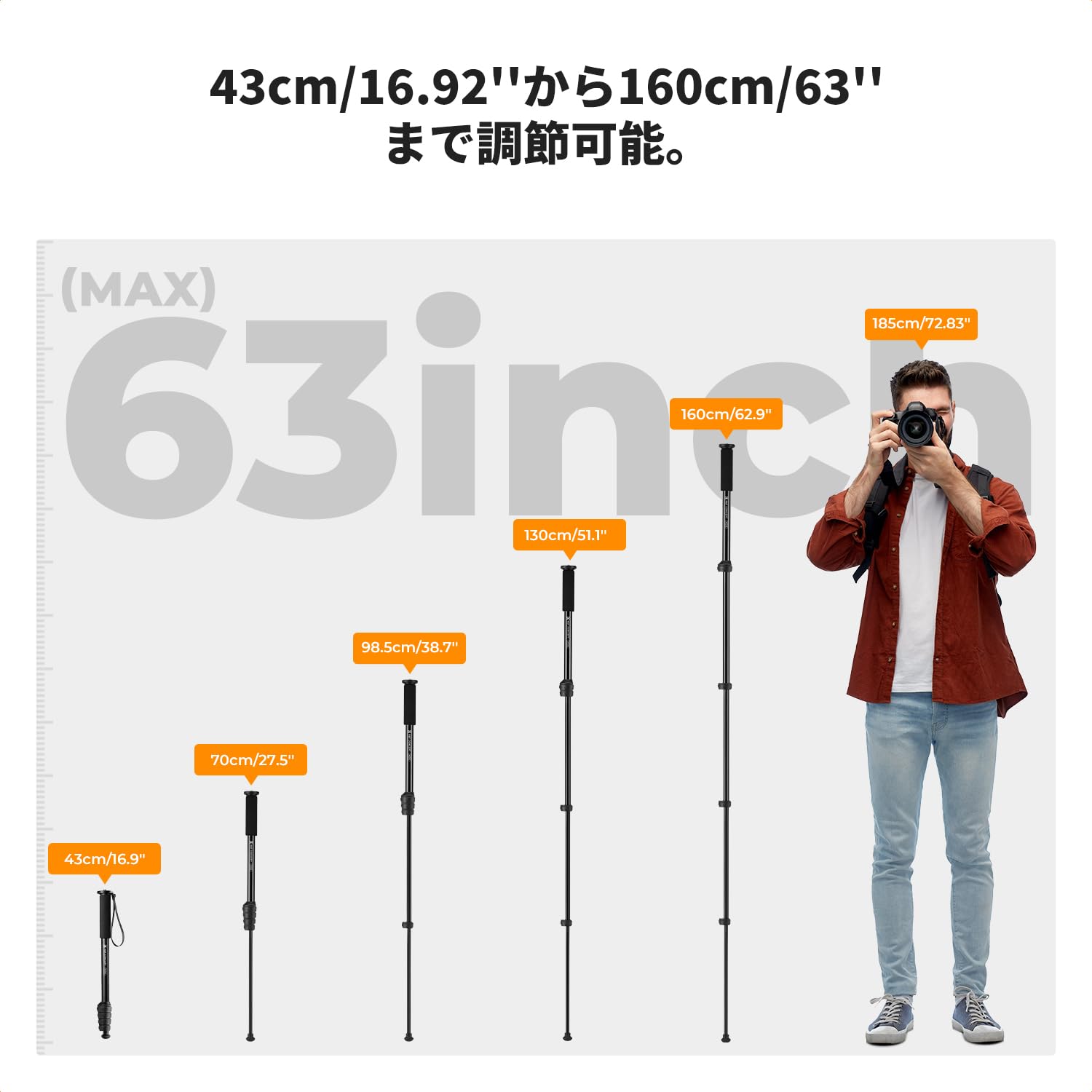 Koolehaoda アルミニウム一脚、折りたたみ式サポートフレーム付きカメラ一脚、最大高さ168 cmの5つのセクション、最大ペイロード7 kg、1/4インチおよび3/8インチのスクリューマウント、SLR/DSLRミラーレスDV、カメラ-DSLRに適しています