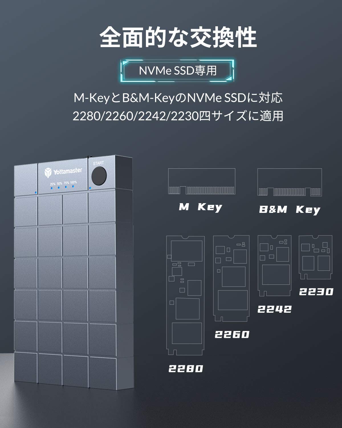 【SSDクローン作成機】Yottamaster M.2 SSD クローン, USB Type-C 10Gbps NVMe M.2 SSDケース 2ベイ コピー機能付き, 外付けケース (M-Key/B&M Key対応, Nvmeのみ), UASPサポート 2230/2242/2260/2280