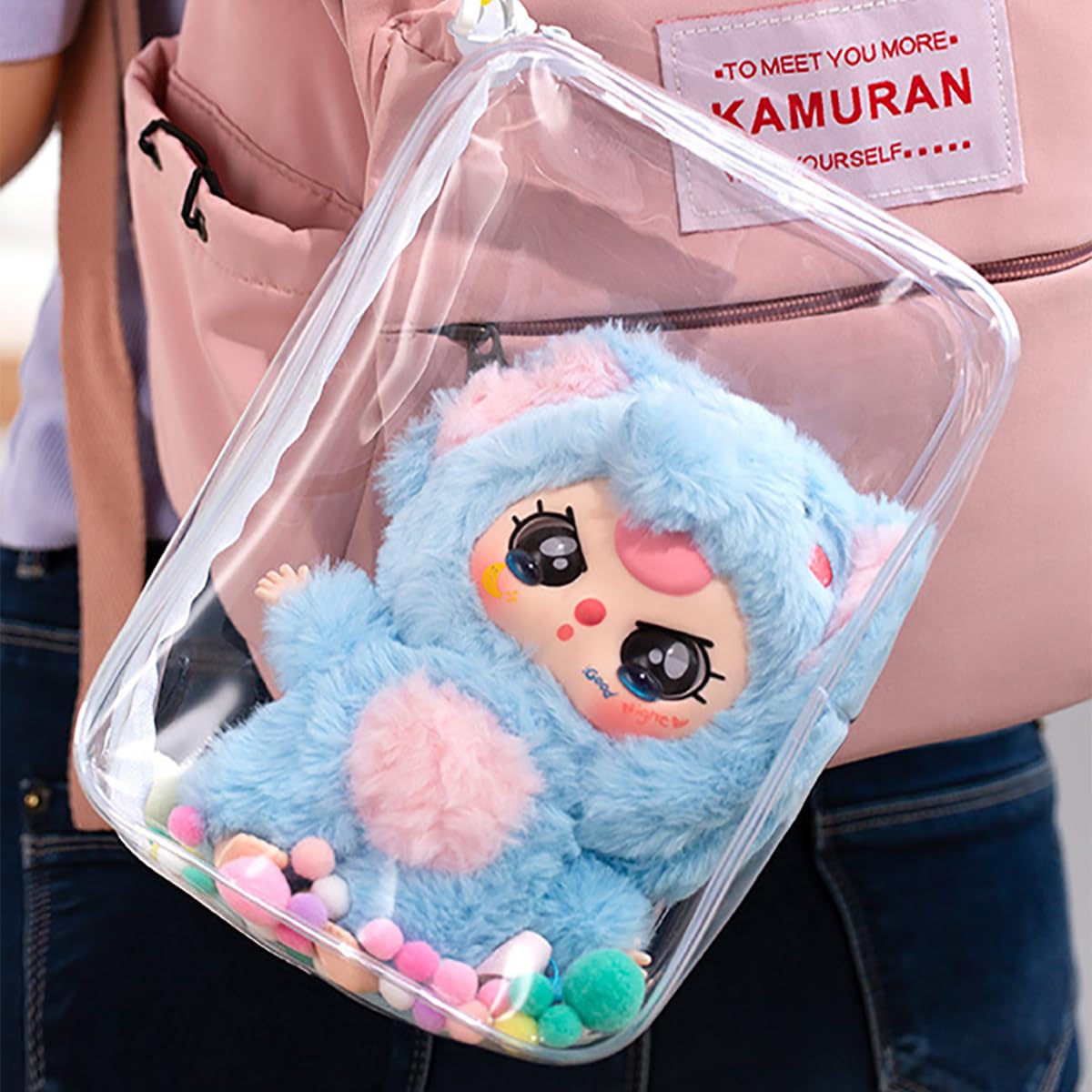 痛バッグ ぬいポーチ 10cm/15cm/20cmサイズ対応 推し活ぬいポーチ 人形の保管場所 全透明 PVCケース 防水・防塵 ジッパー式 ポンポンボール&キーホルダー付 (15cm対応)