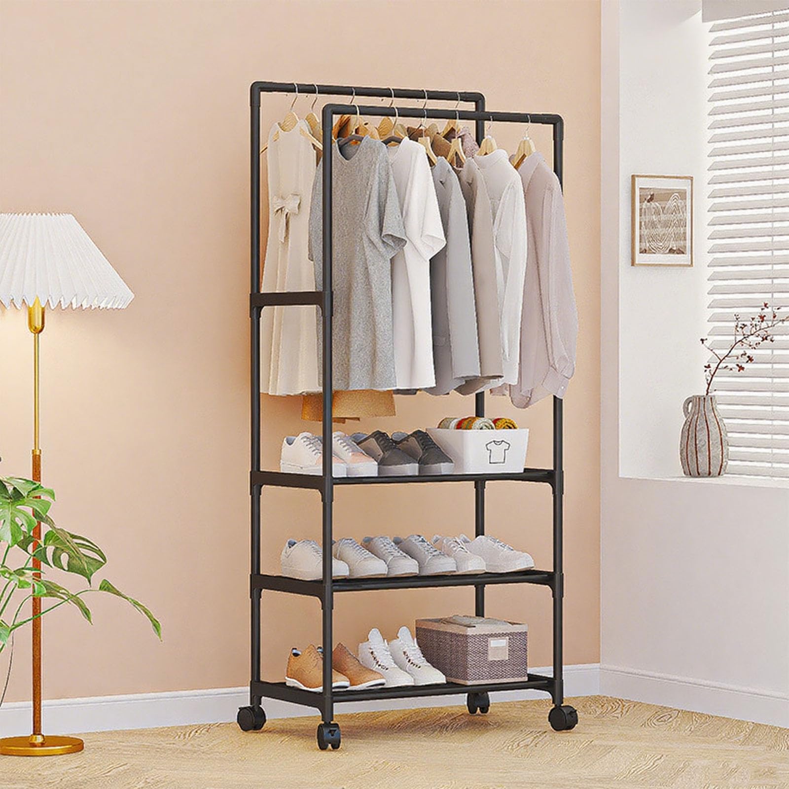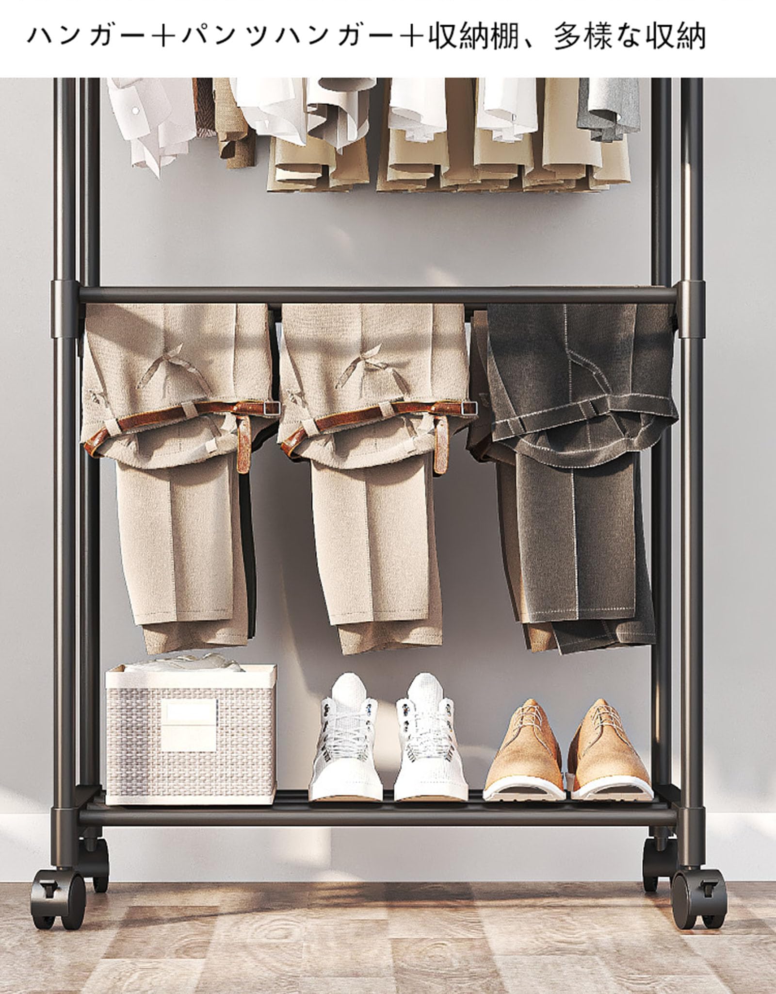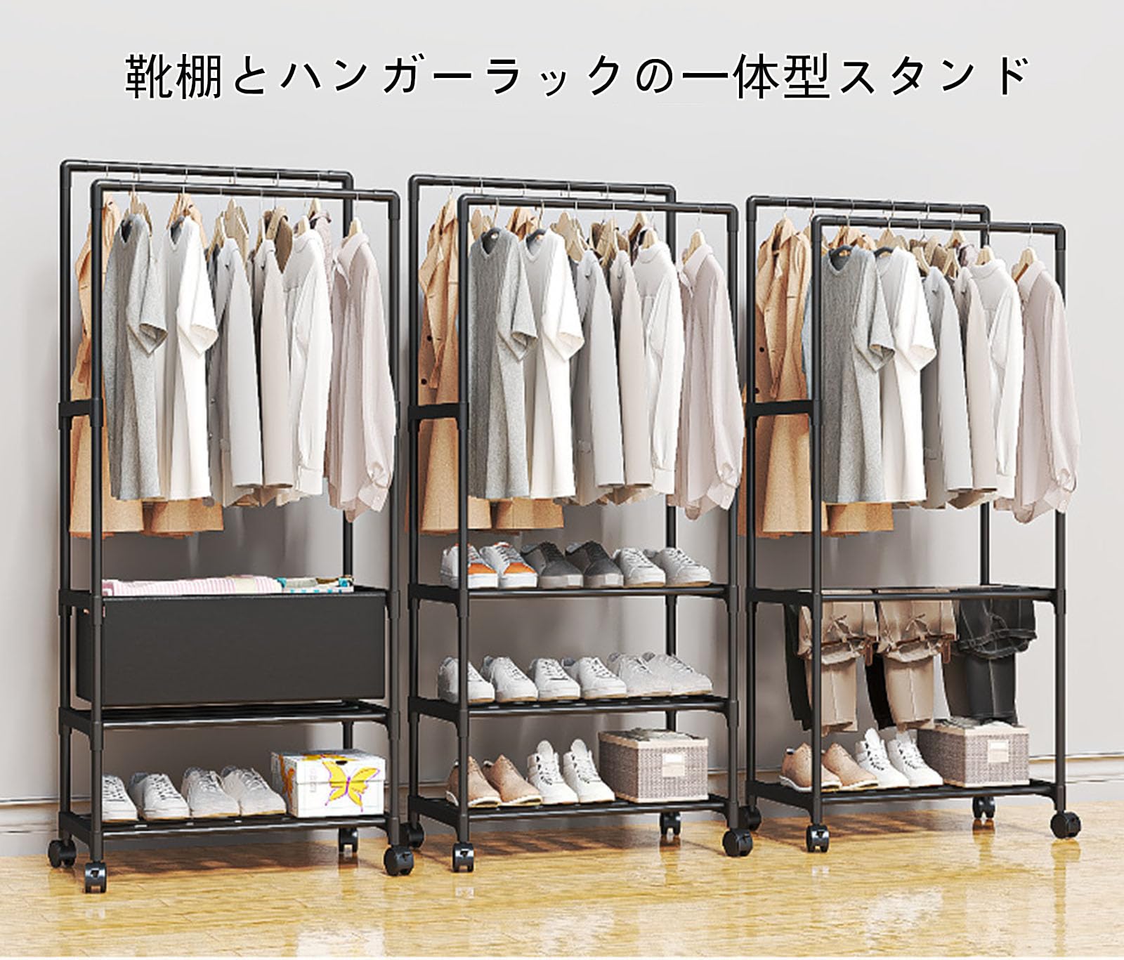SOURUanly ハンガーラック 衣服掛け キャスター付き 収納ラック 壁際掛け物 掛け収納 洋服掛け キャスター付き 衣類収納 省スペース 軽量 頑丈 コンパクト 簡単組み立て 吊り下げ衣類収納 セーター コートに最適 高耐荷重 ブラック (A)